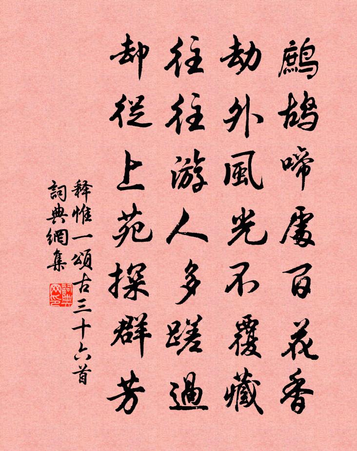詩詞名句歷史字典書法欣賞書法字典國語詞典說文解字康熙字典古漢語字典標 題 作 者 詩 句 頌古三十六首作者:釋惟一 朝代:宋代頌古三十六首原文鷓鴣啼處百花香,劫外風光不覆藏。往往遊人多蹉過,卻從上苑探群芳。詩詞問答問:頌古三十六首的作者是誰?答:釋惟一問:頌古三十六首寫於哪個朝代?答:宋代釋惟一頌古三十六首書法欣賞頌古三十六首書法作品詩詞推薦送李憲被召舊與其先侍郎游從陸游〔宋代〕早謁龍門鬢未秋,暮年乃復接英游。海瀕已幸見公子,瓜壟仍煩訪故侯。霖雨即陪諸老進,德星肯為一方留?西城峽石鋪范成大〔宋代〕峰頭壁立偉天造,萬雉石城如帶繞。山骨鱗皴火種難,山下流泉卻宜稻。新秧一棱綠茸茸,茅花先秋雪搖風。後皇挽黃承事三首廖行之〔宋代〕疇昔雲天一覩披,十年徒有夢追隨。擔簦已負異時志,仰斗今余後學師。夜壑舟亡人孰秘,少微名在世空悲。嗟嗟題定明大像閻禹錫〔宋代〕造化秘奇勝,洪流繞崇崗。層樓百仞高,下□雲水鄉。空嵌古秀峰,雷霓揮銛鋩。神□□□丁,金仙儼垂裳。懸知後塢示壁天瑞施樞〔宋代〕幾年不到已公齋,客里明知未定家。生滅無邊方共語,滿山春雨落松花。東峰亭各賦一物得寒溪草佚名〔唐代〕冪zx溪邊草,遊人不厭看。餘芳幽處老,深色望中寒。幸得陪情興,青青賞未闌。酸棗令劉熊碑詩蔡邕〔兩漢〕碑雲。君諱熊。字孟□。廣陵海西人也。清越孤竹。德牟產奇。誠宜褒顯。昭其憲則。乃相□咨度諏詢。採摭謠言和十九日湖上與張集賢餞提刑張都官韻宋祁〔宋代〕共憑高榭眺雲波,使節將歸可奈何。醇酒暫留丞相飲,驪駒愁對主人歌。千岩日下催雲合,萬里風長送雁過。茲會送徐道士赴闕魏野〔宋代〕捧詔異常倫,無官豈累真。瓢知空似性,琴想重於身。臥必思雲切,行應待鶴頻。林間起相送,漸覺世還淳。觀調發四首劉克莊〔宋代〕路傍紛紛送者誰,相顧淚下如綆縻。妻牽郎衣留不得,兒抱斧頸尤可悲。寄聲征夫且止淚,矯情勿為識者窺。國貧即事蘇泂〔宋代〕道宮釋寺多名勝,出郭經年得幾回。當此秋清身健田,可人還共子高來。出守桐廬道中十絕范仲淹〔宋代〕有病甘長廢,無機苦直言。江山藏拙好,何敢望天閽。浣溪沙陳三聘〔宋代〕越浦潮來信息通。吳山不見暮雲重。人生何事各西東。煙外好花紅淺淡,雨餘芳草綠蔥蘢。苦無歡意敵春濃。紹興以後祀五方帝六十首佚名〔宋代〕[圜鍾為宮]吉日壬祭,律中應鐘。國有故常,北郊迎冬。乃藏祀事,必祗必恭。明默雖異,感而遂通。贈蘇鍊師白居易〔唐代〕兩鬢蒼然心浩然,松窗深處藥爐前。攜將道士通宵語,忘卻花時盡日眠。明鏡懶開長在匣,素琴欲弄半無弦。猶嫌鳳鶴鵲三題與江社同賦張蘊〔宋代〕一去朝陽寂不聞,西康台北起寒雲。梧花竹實年年事,柰此喧啾百鳥群。王伯敭所藏趙昌花四首梅花蘇軾〔宋代〕南行度關山,沙水清練練。行人已愁絕,日暮集微霰。殷勤小梅花,仿佛吳姬面。暗香隨我去,回首驚千片。至今詠史詩。漢中胡曾〔唐代〕荊棘蒼蒼漢水湄,將壇菸草覆餘基。適來投石空江上,猶似龍顏納諫時。林下避暑郭印〔宋代〕行道遭三伏,流年當百殃。舌乾元少味,體倦不安床。逃暑少寬舍,沃焦無冷漿。時依喬木下,俄頃得微涼。送趙侯之任戴雨耕〔宋代〕送君遠作羊荊州,送君西上黃鶴樓。漢晉諸公舊遊處,斷磯黃葉風雨秋。只今麾纛□南斗,整暇坐列皆公侯。江湖名句推薦秋色漸將晚,霜信報黃花。葉夢得《水調歌頭·秋色漸將晚》 種豆南山下,草盛豆苗稀。陶淵明《歸園田居·其三》 晻靄寒氛萬里凝,闌乾陰崖千丈冰。岑參《天山雪歌送蕭治歸京》 安詳是處事第一法,謙退是保身第一法,涵容是處人第一法,灑脫是養心第一法。陳繼儒《小窗幽記·集醒篇》 宰相必起於州部,猛將必發於卒伍。韓非及後人《韓非子·顯學》 紫塞門孤,金河月冷,恨誰訴?朱彝尊《長亭怨慢·雁》 當壚秦女,十五語如弦。賀鑄《行路難·縛虎手》 惆悵南朝事,長江獨至今。劉長卿《秋日登吳公台上寺遠眺》 垂柳覆金堤,蘼蕪葉復齊。薛道衡《昔昔鹽》 若要人不知,除非己莫為。佚名《增廣賢文·上集》