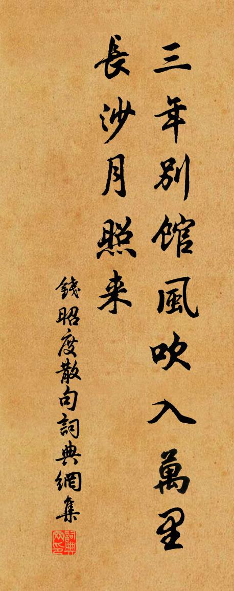 詩詞名句歷史字典書法欣賞書法字典國語詞典說文解字康熙字典古漢語字典標 題 作 者 詩 句 句作者:錢昭度 朝代:宋代句原文三年別館風吹入,萬里長沙月照來。詩詞問答問:句的作者是誰?答:錢昭度問:句寫於哪個朝代?答:宋代錢昭度句書法欣賞句書法作品詩詞推薦廣東漕李實夫四首戴復古〔宋代〕乾坤雖廣大,人物不能多。議論還諸老,文章自一科。從橫負才略,緩急任干戈。不有濟時傑,其如世事何。游龍門分題十五首晚登菩提上方歐陽修〔宋代〕野色混晴嵐,蒼茫辨煙樹。行人下山道,猶向都門去。偈頌一百零四首釋紹曇〔宋代〕鴆鳥毛,烏喙藥。毒無醫,休動著。輕動著,盡大地人,皮膚脫落。宮詞宋白〔宋代〕臘日天寒苑獵遲,獵回諸衛齪槍旗。女真王子新朝覲,旋遣黃門賜口脂。夢中送僧覺而忘第三聯戲足之陳與義〔宋代〕兩鴻同一天,羽翼不相及。偶然一識面,別意已超忽。去程秋光好,萬里無斷絕。雖無仁人言,贈子以明月。靈江釋了惠〔宋代〕水底烏龜無卦兆,岸頭神樹不相關。要知禍福流行處,只在波心月一灣。詠湖中雁沈約〔南北朝〕白水滿春塘,旅雁每迥翔。唼流牽弱藻,斂翮帶餘霜。群浮動輕浪,單泛逐孤光。懸飛竟不下,亂起未成行。刷羽磨崖頌吳杭〔宋代〕周雅久不復,楚騷方獨鳴。溪蛙弄氣態,污我蕭湘清。二公好奇古,大筆時縱橫。磨崖勒唐頌,字字飛瓊英。雲煙晚步吳儆〔宋代〕水靜偏明眼,山高不受塵。晴沙棲白鳥,野流集歸人。問字誰持酒,行歌有負薪。娟娟孤月影,獨覺向人新。西湖月(自度商調)黃子行〔宋代〕湖光冷浸玻璃,盪一餉薰風,小舟如葉。藕花十丈,雲梳霧洗,翠嬌紅怯。壺觴圍坐處,正酒醁吹波紅映頰。尚記定風波晁端禮〔宋代〕花倚東風柳弄春。分明淺笑與輕嚬。更憶當時聲細細,偎人。秦箏輕襯砑羅裙。別後此歡誰更共。春夢。只憑胡蝶福昌雜詠五首張耒〔宋代〕滿目淒涼供客愁,斷霞殘照想滄洲。風雲蕭瑟三川夜,星斗縱橫萬壑秋。騎省衰遲空作賦,荊蠻留滯感登樓。 * 答楊八敬之絕句(楊時亦謫居)劉禹錫〔唐代〕飽霜孤竹聲偏切,帶火焦桐韻本悲。今日知音一留聽,是君心事不平時。永和遇風楊萬里〔宋代〕未嫌春脕不多花,只愛青原綠似爪。剩欲開懷納岩岳,可堪病眼著風沙。待船小立看鷗沒,倚杖微吟盡帽斜。客里讀淵明詩楊萬里〔宋代〕少年喜讀書,晚悔昔草草。迨今得書味,又恨身巳老。淵明非生面,稚劌識巳早。極知人更賢,未契詩獨好。塵中和劉後村梅花百詠方蒙仲〔宋代〕兒時兩頷已生髭,一飽皇皇亟失時。索性斷它煙火氣,餐英汲潤當朝炊。和裴延齡尚書寄題果州謝舍人仙居盧綸〔唐代〕飄然去謁八仙翁,自地從天香滿空。紫蓋迥標雙鶴上,語音猶在五雲中。青溪不接漁樵路,丹井唯傳草木風。歌此雪復大作六言范成大〔宋代〕釀成送臘三白,功在迎年九秋。樵指擔肩相賀,飯囊酒瓮何憂?霅溪夜宴詩(霅溪神歌)水神〔唐代〕山勢縈迴水脈分,水光山色翠連雲。四時盡入詩人詠,役殺吳興柳使君。句秦觀〔宋代〕夢魂思汝鳥工往,事故著人羊負來。名句推薦虛空落泉千仞直,雷奔入江不暫息。徐凝《廬山瀑布》 海畔風吹凍泥裂,枯桐葉落枝梢折。陳羽《從軍行》 心之憂危,若蹈虎尾,涉於春冰。佚名《尚書·周書·君牙》 千里馬常有,而伯樂不常有。韓愈《馬說》 移風易俗,莫善於樂。孔子及其弟子《孝經·廣要道》 弱水三千,我只取一瓢飲。曹雪芹《紅樓夢·第九十一回》 長風萬里送秋雁,對此可以酣高樓。李白《宣州謝朓樓餞別校書叔雲 / 陪侍御叔華登樓歌》 月色穿簾風入竹,倚屏雙黛愁時。顧敻《臨江仙·月色穿簾風入竹》 兒女此情同。往事朦朧。湘娥竹上淚痕濃。辛棄疾《浪淘沙·賦虞美人草》 殘燈孤枕夢,輕浪五更風。徐昌圖《臨江仙·飲散離亭西去》