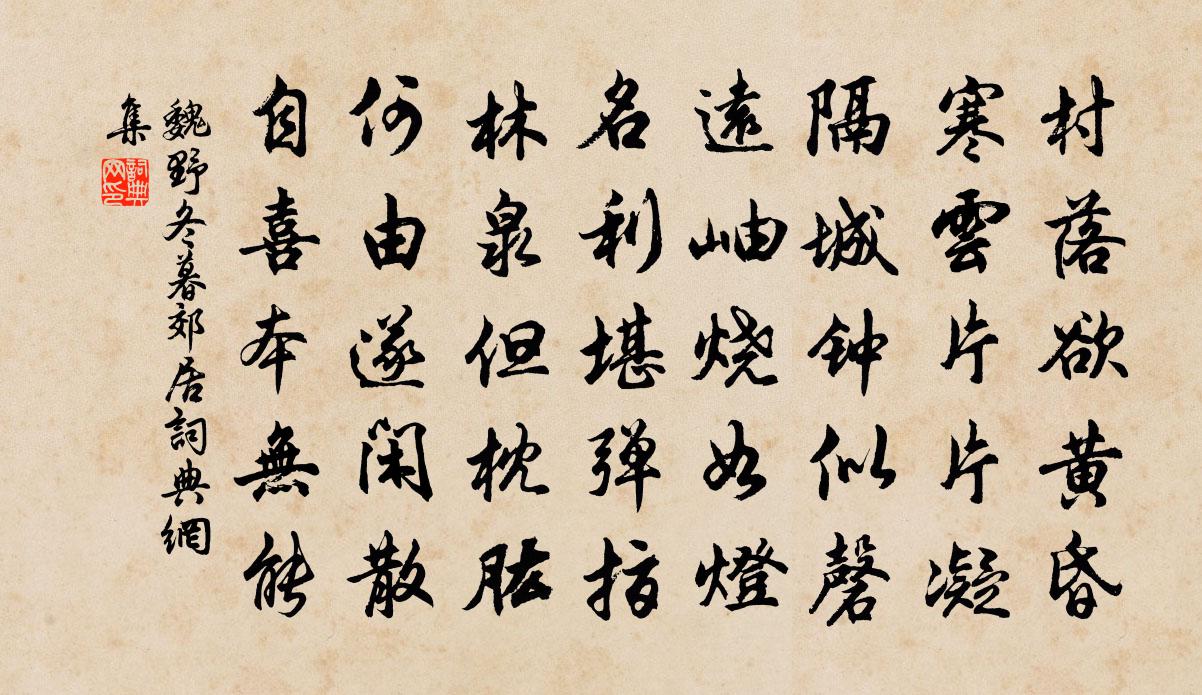 詩詞名句歷史字典書法欣賞書法字典國語詞典說文解字康熙字典古漢語字典標 題 作 者 詩 句 冬暮郊居作者:魏野 朝代:宋代冬暮郊居原文村落欲黃昏,寒雲片片凝。隔城鍾似磬,遠岫燒如燈。名利堪彈指,林泉但枕肱。何由遂閒散,自喜本無能。詩詞問答問:冬暮郊居的作者是誰?答:魏野問:冬暮郊居寫於哪個朝代?答:宋代魏野冬暮郊居書法欣賞冬暮郊居書法作品詩詞推薦漫興 其一王冕〔元代〕隱几看山與世違,當門種竹亦無機。五更驟雨隨風過,滿眼落花如雪飛。每為注書消夜燭,亦常沽酒點春衣。今朝石竹文同〔宋代〕蜂齧紅蕊爛,蟲啼碧叢短。秋風略地起,惟有蒼苔管。偈頌六十八首釋法薰〔宋代〕春光冉冉,春日遲遲。春風包裹,上下四維。黃鶯聲在柳陰西,此意明明說向誰。別諸周二首陳與義〔宋代〕隴雲知我欲船開,飛過江東還復回。不似周顒趨闕去,山靈應許卻歸來。和范倅十首曹勛〔宋代〕當年越相有青氈,百越於今奠枕眠。蘭玉階庭傳相業,聲猷剩在日華邊。到妙寂寺陳宓〔宋代〕朝辭城市哄,近寺向昏黃。步步貪山色,依依顧水光。群魚猶出戲,歸路倦高翔。正喜無人見,迎僧欲下堂。賀新涼(送劉澄齋制乾歸京口)張榘〔宋代〕匹馬鐘山路。悵年來只解,郵亭送人歸去。季子貂裘塵漸滿,猶是區區羈旅。謾空有、劍鋒如故。髀肉未消儀舌在落花胡仲弓〔宋代〕紅紫稼時雨未晴,每將春事嘆浮生。誰憐繡地愁如織,我俗箋天訴不平。半點蒼苔猶有跡,一分流水去無情。東君懷古題雪十首長安落雪方鳳〔宋代〕朔風瓊粉如節墮,四望民居絕煙火。路無行蹤門反關,珍重先生獨僵臥。洛陽令尹舉孝廉,三冬喜愛照河南。有志偈頌四十一首釋慧暉〔宋代〕君看五月半旬颸,山上雪花滿地飛。烏雞昨夜入雲外,鷺鶴今朝出紫微。木馬聲聲嘶北風,金鵝口口啼南枝。石翁上宣州沈大夫朱慶餘〔唐代〕科名繼世古來稀,高步何年下紫微。帝命幾曾移重鎮,時清猶望領春闈。登朝舊友常思見,開幕賢人並望歸。今日喜雨用前韻黃榦〔宋代〕雲霓天外起層層,華月相隨徹夜橫。費得天公能幾力,數州愁苦變歌聲。常州先生以太守入對五首趙蕃〔宋代〕一州固菲輕,四海豈不重。與其事扶疎,孰若深培壅。驥不取德稱,馬多求駕泛。偉哉底柱功,障彼百川洶。清平樂劉過〔宋代〕新來塞北。傳到真訊息。赤地居民無一粒。更五單于爭立。維師尚父鷹揚。熊羆百萬堂堂。看取黃金假鉞,歸來異爽口吟邵雍〔宋代〕爽口之物少茹,爽心之行少慮,爽意之言少語,爽身之事少做。句朱翌〔宋代〕無人馬為二,對飲月成三。詠歐陽行周事孟簡〔唐代〕有客西北逐,驅馬次太原。太原有佳人,神 * 行雲。座上轉橫波,流光注夫君。夫君意蕩漾,即日相交歡。定情解嘲示真歇老人二首張元乾〔宋代〕不作市朝夢,生憎城郭居。前身真衲子,妄念入儒書。丘壑無疑老,軒裳久已疏。世人多大屋,爭笑賣吾廬。孤鸞佚名〔宋代〕天然標格。是小萼堆紅,芳姿凝白。淡佇新妝,淺點壽陽宮額。東君相留厚意,倩年年、與傳訊息。昨夜前村雪裡有所思(一作古有所思行)李白〔唐代〕我思仙人乃在碧海之東隅。海寒多天風,白波連山倒蓬壺。長鯨噴涌不可涉,撫心茫茫淚如珠。西來青鳥東飛去,名句推薦林暗草驚風,將軍夜引弓。盧綸《和張僕射塞下曲·其二》 去日兒童皆長大,昔年親友半凋零。竇叔向《夏夜宿表兄話舊》 巧詐不如拙誠。韓非及後人《韓非子·說林上》 白髮書生神州淚,盡淒涼、不向牛山滴劉克莊《賀新郎·九日》 天不為人之惡寒也輟冬,地不為人之惡遼遠也輟廣,君子不為小人之匈匈也輟行。荀子《荀子·天論》 天外黑風吹海立,浙東飛雨過江來。蘇軾《有美堂暴雨》 若待得君來向此,花前對酒不忍觸。蘇軾《賀新郎·夏景》 文章是山水化境,富貴乃煙雲幻形。王永彬《圍爐夜話·第一二二則》 君埋泉下泥銷骨,我寄人間雪滿頭。白居易《夢微之》 讀書須用意,一字值千金。佚名《增廣賢文·上集》