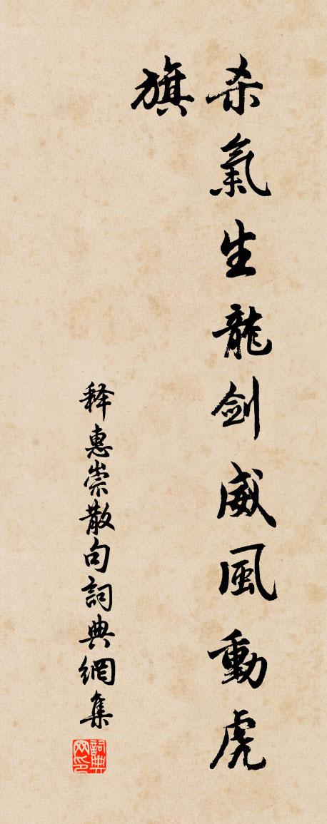 詩詞名句歷史字典書法欣賞書法字典國語詞典說文解字康熙字典古漢語字典標 題 作 者 詩 句 句作者:釋惠崇 朝代:宋代句原文殺氣生龍劍,威風動虎旗。詩詞問答問:句的作者是誰?答:釋惠崇問:句寫於哪個朝代?答:宋代釋惠崇句書法欣賞句書法作品詩詞推薦歸園田居 其三陶淵明〔魏晉〕種豆南山下,草盛豆苗稀。晨興理荒穢,帶月荷鋤歸。道狹草木長,夕露沾我衣。衣沾不足惜,但使願無違。宮中行樂詞其六李白〔唐代〕今日明光里。還須結伴遊。春風開紫殿。天樂下朱樓。 * 全知巧。嬌歌半欲羞。更憐花月夜。宮女笑藏鉤。和竹軒張史君來字韻二首王邁〔宋代〕金鳳傳呼紫馬來,壺山真面氣佳哉。朝天有路鹿呈瑞,應物無心鷗不猜。黍穋熟時農洗甑,芰荷香客銜杯。官穹職閒居雜詠三十二首夫婦陳淳〔宋代〕夫婦亦大端,乾男而坤女。一言在有別,不可欲敗度。詠舞妓詩何遜〔南北朝〕管清羅薦合。弦驚雪袖遲。逐唱回縴手。聽曲動蛾眉。凝情眄墮珥。微睇托含辭。日暮留嘉客。相看愛此時。鯨川八景客船晚煙家鉉翁〔宋代〕去棹來帆一聚塵,箇中那復有詩情。晚來應是盧仝過,留得茶煙一抹橫。送胡季永赴漕楊萬里〔宋代〕兔目著花官檨黃,永輪飄子秋風香。誰騎瘦馬蹈詞場,澹翁庭階玊雪向,天於賢佞真不省,不應阿翁有阿汞。景升句尹棟〔宋代〕白苹影蘸無痕水, * 香催未了詩。浣溪沙陳克〔宋代〕淡墨花枝掩薄羅。嫩藍裙子窣湘波。水晶新樣碾風荷。問著似羞還似惡,惱來成笑不成歌。芙蓉帳里奈君何。柴門晚步張嵲〔宋代〕柴門一延竚,暮色集四山。雨歇林藹變,歲陰嵐氣寒。峰高看月上,巢昏遲烏還。游眺暫自適,裴回反長嘆。幽思閱明妃傳華岳〔宋代〕一萬邊兵不立功,卻令婁敬自和戎。犬羊不伏稱臣妾,甘拜君王作婦翁。江上燕別(一作趙嘏詩,題作汾上宴別)許渾〔唐代〕雲物如故鄉,山川異岐路。年來未歸客,馬上春欲暮。一樽花下酒,殘日水西樹。不待管弦終,搖鞭背花去。出金陵王安石〔宋代〕白石岡頭草木深,春風相與散衣襟。浮雲映郭留佳氣,飛鳥隨人作好音。送靈武朱書記劉得仁〔唐代〕靈帥與誰善,得君賓幕中。從容應盡禮,贊畫致元功。連塞雲長慘,才秋樹半空。相如偏自愜,掌記復乘驄。延平范子登同侄祖年見訪惠詩次韻陳宓〔宋代〕森森九桂植岩幽,所謂伊人在一洲。別後道尊君可慕,病餘學廢我堪羞。雪驚新白傳佳詠,雲□殘黃會晚秋。多謝和中丞晏尚書西園晚秋懷寄宋庠〔宋代〕眾籟日蕭蕭,閒園氣寂寥。風萍難覆水,霜葉易辭條。噪鵲繁聲合,寒蟬舊吹飄。試尋籬下菊,鄰酒濁盈瓢。頌古三十一首釋玿〔宋代〕此兒話計口皮邊,點著風馳與電旋。謾說鎮州蘿蔔大,何曾親見老南泉。蛩李中〔唐代〕月冷莎庭夜已深,百蟲聲外有清音。詩情正苦無眠處,愧爾階前相伴吟。太常引劉秉忠〔元代〕青山憔悴鎖寒雲。站路上,最傷神。破帽鬢沾塵。更誰是、陽關故人。頹波世道,浮雲交態,一日一番新。無地覓晚眺吳錫疇〔宋代〕日未沈西月色東,一山秋葉染霜紅。鮮明恰勝春花好,不似春花耐得風。名句推薦深居俯夾城,春去夏猶清。李商隱《晚晴》 若要俏,添重孝。馮夢龍《警世通言·卷三十五》 風送梅花過小橋,飄飄。趙顯宏《晝夜樂·冬》 攀荷弄其珠,蕩漾不成圓。李白《折荷有贈》 耿斜河、疏星淡月,斷雲微度。張元乾《賀新郎·送胡邦衡待制赴新州》 君寵益嬌態,君憐無是非。王維《西施詠》 敬他人,即是敬自己;靠自己,勝於靠他人。王永彬《圍爐夜話·第五七則》 生而富者驕,生而貴者傲。范曄《後漢書·列傳·崔駰列傳》 盡道有些堪恨處,無情,任是無情也動人。秦觀《南鄉子·妙手寫徽真》 勿言草卉賤,幸宅天池中沈約《詠新荷應詔》