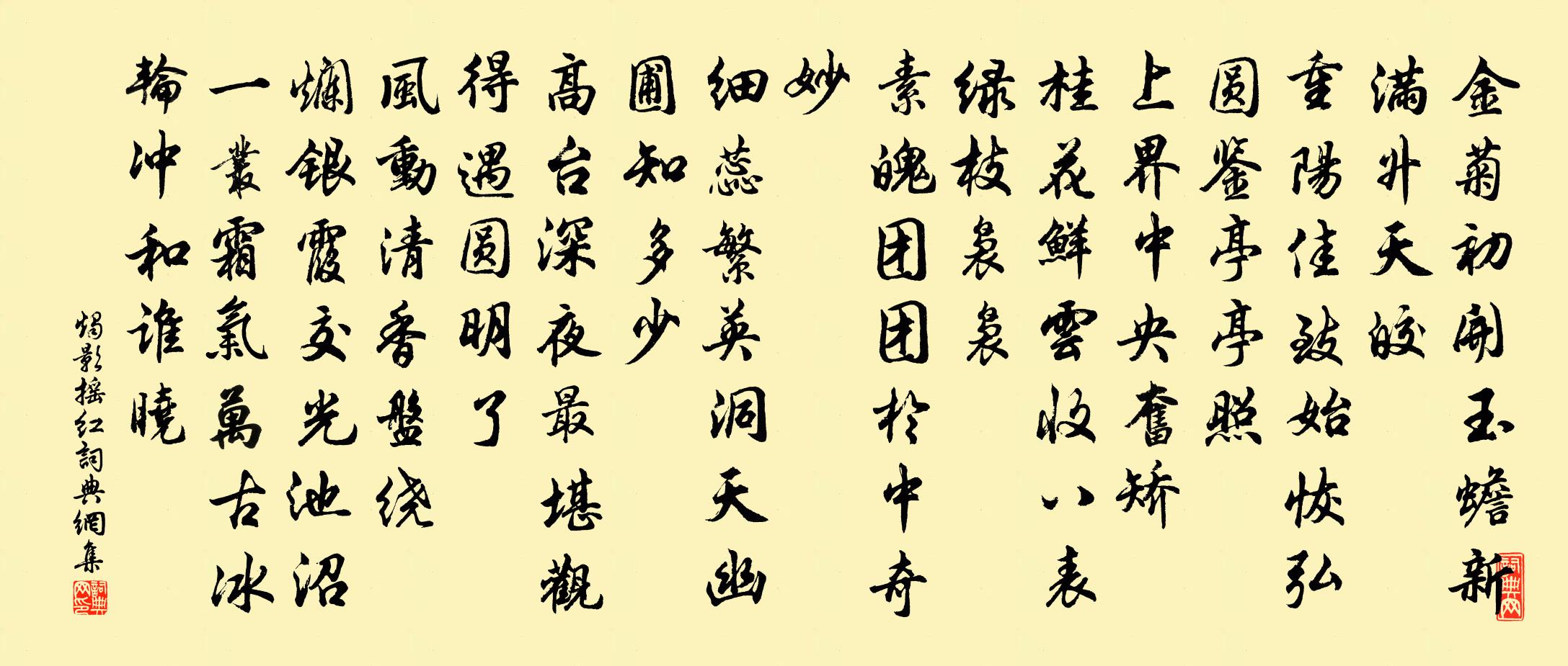 金菊初開,玉蟾新滿升天皎。重陽佳致始恢弘,圓鑒亭亭照。