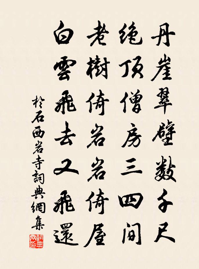 詩詞名句歷史字典書法欣賞書法字典國語詞典說文解字康熙字典古漢語字典標 題 作 者 詩 句 西岩寺作者:於石 朝代:宋代西岩寺原文丹崖翠壁數千尺,絕頂僧房三四間。老樹倚岩岩倚屋,白雲飛去又飛還。詩詞問答問:西岩寺的作者是誰?答:於石問:西岩寺寫於哪個朝代?答:宋代於石西岩寺書法欣賞西岩寺書法作品詩詞推薦食粥歌朱申〔宋代〕龍平江水清洋洋,尉山高兮秋葉黃。釣翁落落兮棲山房,偕室人兮甘糟糠。丈夫壯圖兮在四方,道豈終窮兮業不彰和宮怨羅公升〔宋代〕竹葉垂黃雨露偏,羞緣買賦費金錢。有緣會有承恩日,莫遣峨眉減去年。石屏久游湖海祖妣遂題二句於壁雲機番白薴和戴復古〔宋代〕伊昔天邊望藁砧,天邊魚雁幾浮沉。機番白薴和愁織,門掩黃花帶恨吟。自古詩人皆浪跡,誰知賢婦有關心。歸來仙佛之孝十首許真君林同〔宋代〕鄉以孝廉舉,仙為孝道宗。謂予方不信,君請問蘭公。春步岳園二首董嗣杲〔宋代〕將軍墓域在杭州,如此家園入夢遊。誰惜再傳無嗣續,至今匙鑰屬官收。挽賈平章生母王義山〔宋代〕修齡逾八袠,五福萃諸身。翟服儀容舊,鸞綾謚誥新。艱難共淮楚,褒表建齊秦。曾聽呼兒道,仲華能笑人。列仙峰陳岩〔宋代〕笑闖黃冠高切雲,前攜後掖互相親。我來歷歷披雲看,試問肩隨是幾人。詠畫屏風詩 二四庾信〔南北朝〕金鞍聚磧岸。玉舳泛中流。畫鷁先防水。媒龍即負舟。沙城疑海氣。石岸似江樓。崩槎時半沒。壞舸或空浮。定是淵明圖唐寅〔明代〕五柳先生日醉眠,客來清賞榻無氈。酒資盡在東籬下,散貯黃金萬斛錢。即事二首王安石〔宋代〕雲從鍾山起,卻入鍾山去。借問山中人,雲今在何處。過揚子江二首楊萬里〔宋代〕天將天塹護吳天,不數殽函百二關。萬里銀河瀉瓊海,一雙玉塔表金山。旌旗隔岸淮南近,鼓角吹霜塞北閒。多謝過王處士竹莊薛師魯〔宋代〕臨流結屋植琅玕,中有高人詠考槃。一曲秋煙青欲滴,滿林春雨翠堪看。山僧過乞歸雲仗,漁父來分釣月竿。千古呈薛博士喻鳧〔唐代〕辛勤長在學,一室少曾開。時憶暮山寺,獨登衰草台。名期五字立,跡愧九年來。此意今聊寫,還希君子哀。湘中作韋莊〔唐代〕千重煙樹萬重波,因便何妨吊汨羅。楚地不知秦地亂,南人空怪北人多。臣心未肯教遷鼎,天道還應欲止戈。否去感春張耒〔宋代〕若若堂北桃,昨日花猶小。暖風遲景一日功,萬萼千葩爛相照。東風漾漾吹朝雨,朝日滿檐春鳥語。櫻桃得暖花意折紅梅吳感〔宋代〕喜冰澌初泮,微和漸入、東郊時節。春訊息,夜來頓覺,紅梅數枝爭發。玉溪仙館,不是個、尋常標格。化工別與蠟梅三絕潘良貴〔宋代〕旦評人物尚雌黃,草木何妨定短長。試問清芳誰第一,蠟梅花冠百花香。蜀酒高斯得〔宋代〕我辭相國歸,遺我酒十器。拜受起潸然,為上有蜀字。狐狸之所嗥,種秫寧有地。得非父兄血,或是鄉人淚。我飲近岸楊萬里〔宋代〕十日都無一日晴,牽船客子總斜行。一川黃犢朝朝飽,岸草何曾減寸青?側犯楊 * 〔宋代〕九衢艷質,看來怎比他閒靚。清韻。似照水橫斜暮臨鏡。林間頓畫閣,花底藏芳徑。幽靜。將絳燭、高燒照雙影。名句推薦童孫未解供耕織,也傍桑陰學種瓜。范成大《夏日田園雜興·其七》 岸柳垂金線,雨晴鶯百囀。顧敻《醉公子·岸柳垂金線》 子治世之能臣,亂世之奸雄也。羅貫中《三國演義·第一回》 因人成事,其功不難。魏徵《隋書·列傳·卷七》 花落家童未掃,鶯啼山客猶眠。王維《田園樂七首·其六》 背若泰山,翼若垂天之雲。莊周《逍遙遊(節選)》 更深人去寂靜,但照壁孤燈相映。周邦彥《關河令·秋陰時晴漸向暝》 德不孤,必有鄰。孔子弟子《論語·里仁篇》 飛鴻過也。萬結愁腸無晝夜。蔣氏女《減字木蘭花·題雄州驛》 窮冬烈風,大雪深數尺,足膚皸裂而不知。宋濂《送東陽馬生序》