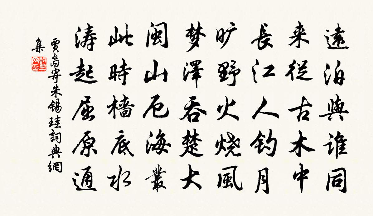 遠泊與誰同,來從古木中。長江人釣月,曠野火燒風。