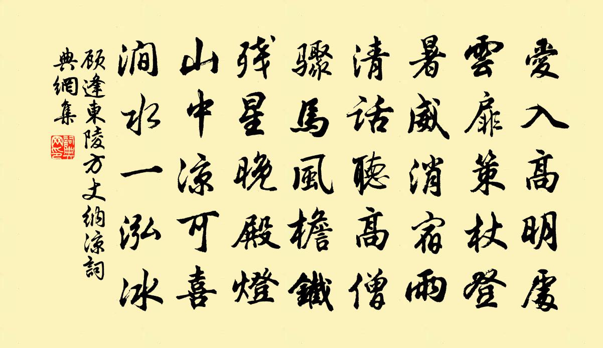 詩詞名句歷史字典書法欣賞書法字典國語詞典說文解字康熙字典古漢語字典標 題 作 者 詩 句 東陵方丈納涼作者:顧逢 朝代:宋代東陵方丈納涼原文愛入高明處,雲扉策杖登。暑威消宿雨,清話聽高僧。驟馬風檐鐵,殘星晚殿燈。山中涼可喜,澗水一泓冰。詩詞問答問:東陵方丈納涼的作者是誰?答:顧逢問:東陵方丈納涼寫於哪個朝代?答:宋代顧逢東陵方丈納涼書法欣賞東陵方丈納涼書法作品詩詞推薦立春前有雪姜特立〔宋代〕春前一寸雪,春後一犁金。萬里煙瘴息,九農和氣深。邵武泰寧途間一路海棠陳普〔宋代〕萬騎連線出襄國,諸忍撩亂上驪山。道人不識紅妝面,何事扶筇過此山。送鄭嚴州四首陳鑒之〔宋代〕諸賢適江海,梧竹孤鳳吟。願言正王度,祈招嗣清音。亦為膠西董,反慰及物心。未可賦柏舟,天眷宗社深。晦日重宴周思鈞〔唐代〕綺筵乘晦景,高宴下陽池。濯雨梅香散,含風柳色移。輕塵依扇落,流水入弦危。勿顧林亭晚,方歡雲霧披。次韻趙帥登平山堂陳造〔宋代〕修月於今第一功,後車九萬蜀箋紅。詩供寒食鶯花課,袖拂平山楊柳風。匝坐蕙蘭歌似剪,生香笑語酒如空。胡床謝劉德謙惠疊翠峰詩李若水〔宋代〕我聞帶劉綱古仙帶子,此郎帶無乃渠耳帶孫。平生丘壑有真趣,脫口誤與兒輩論。杖藜乘興繞山腹,撥碎松影尋雲點絳唇(呈洛濱、筠溪二老)張元乾〔宋代〕清夜沈沈,暗蛩啼處檐花落。乍涼簾幕。香繞屏山角。堪恨歸鴻,情似秋雲薄。書難托。盡交寂寞。忘了前時約。端午月山主人酒邊即事黃庚〔宋代〕時序催人易白頭,端陽懷古客添愁。朱符不寫湘纍恨,角黍難包楚國羞。記節何妨斟蟻酒,奪標無復見龍舟。高歌厄台李廌〔宋代〕今古俱無忌憚情,厄台猶敢尚為名。裔孫不復重瞳聖,俗目俱同瞽叟盲。見慍仲由空骯髒,膾肝盜跖尚彭亨。聖人松陰小憩楊萬里〔宋代〕不但先生倦不蘇,僕夫也自要人扶。青松數了還重數,只是從前 * 株。喜雪李若水〔宋代〕皇家有道歲不惡,雪花如絮千里飛。老農夸殺麥本綠,一杯湯餅令汝肥。頌古十七首釋師觀〔宋代〕比此為津梁,赤體露堂堂。風光都買盡,當處是家鄉。再次贈張學錄韻十詩陳造〔宋代〕解頤匡鼎來,詩語窮益新。政用追前輩,不勞吞吾人。題乾明庵趙蕃〔宋代〕誰結道人廬,前臨博士湖。名非竄荒李,官是避秦廬。隱德雖無述,清風不可渝。嚴元有孫子,往往混樵漁。送梁府教赴括蒼任趙恬齋〔宋代〕聞得官期三月初,此行最喜奉潘輿。杏花風暖好覓句,槐影日長宜讀書。垂世文章星有斗,隨緣富貴水成渠。少須時人為鄒昉語佚名〔唐代〕蕭佺駙馬子,鄒昉駱駝兒。非關道德合,只為錢相知。自江源過雙流不宿逕行之成都陸游〔宋代〕斷筰飄飄掛渡頭,臨江立馬喚漁舟。少城已破繁華夢,老境聊尋汗漫遊。斜日驛門雙堠立,早霜風葉一林秋。詩材寄南岩悟禪師王銍〔宋代〕雪後千峰玉刻成,瓊瑤寒照寺樓明。遙知禪老開窗坐,指點菸村看晚晴。次韻和王密學冬暮書事宋庠〔宋代〕歲晏陪京守,心間俗自安。斗城供近望,天幕借餘歡。秀句然萁待,幽經濯手看。不因郵問數,誰識政條寬。志峽船具詩梢王周〔唐代〕制之居首尾,俾之辨斜正。首動尾聿隨,斜取正為定。有如提吏筆,有如執時柄。有如秉師律,有如宣命令。守彼名句推薦長記海棠開後,正傷春時節李清照《好事近·風定落花深》 二人同心,其利斷金。同心之言,其臭如蘭。佚名《易傳·繫辭傳上·第八章》 吳興才人怨春風,桃花滿陌千里紅。李賀《送沈亞之歌·並序》 柳花深巷午雞聲,桑葉尖新綠未成。范成大《春日田園雜興》 落花水香茅舍晚,斷橋頭賣魚人散。馬致遠《壽陽曲·遠浦帆歸》 可能無意傳雙蝶,盡付芳心與蜜房。宋祁《落花》 林花著雨胭脂濕,水荇牽風翠帶長。杜甫《曲江對雨》 蚤是傷春夢雨天,可堪芳草更芊芊。韋莊《長安清明》 晝成淒黯,雁飛過、垂楊轉青。吳文英《慶 * ·秋感》 吳台直下,緗梅無限,未放野橋香度。吳文英《永遇樂·探梅次時齋韻》