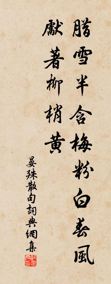 詩詞名句歷史字典書法欣賞書法字典國語詞典說文解字康熙字典古漢語字典標 題 作 者 詩 句 句作者:晏殊 朝代:宋代句原文臘雪半含梅粉白,春風先著柳梢黃。詩詞問答問:句的作者是誰?答:晏殊問:句寫於哪個朝代?答:宋代問:晏殊的名句有哪些?答:晏殊名句大全晏殊句書法欣賞句書法作品詩詞推薦蜘蛛釋普濟〔宋代〕一絲掛得虛空住,百憶絲頭殺氣生。上下四維羅織了,一無漏綱話方行。嶺梅曾幾〔宋代〕蠻煙無處洗,梅蕊不勝清。顧我已頭白,見渠猶眼明。折來知韻勝,落去得愁生。坐久江南夢,園林雪正晴。河東贈別鍊師武元衡〔唐代〕多累有行役,相逢秋節分。遊人甘失路,野鶴亦離群。戎馬犯邊壘,天兵屯塞雲。孔璋才素健,羽檄定紛紛。自遣齊己〔唐代〕瞭然知是夢,既覺更何求。死入孤峰去,灰飛一燼休。雲無空碧在,天靜月華流。免有諸徒弟,時來吊石頭。贈尤檢正四首趙蕃〔宋代〕多書如鄴侯,讀書如張巡。一代信不數,吾身見能親。門牆雖雲舊,蹤跡乃若新。政以沅湘遠,無由書疏頻。婆羅門引(望月)曹組〔宋代〕漲雲暮卷,漏聲不到小簾櫳。銀河淡掃澄空。皓月當軒高掛,秋入廣寒宮。正金波不動,桂影朦朧。佳人未逢。嘆鷓鴣天(乙丑八月十八日壽太孺人)郭應祥〔宋代〕人道今年秋較遲。木犀全未放些兒。不因誕節開千歲,爭得今辰把一枝。呼寶鼎,伴渠伊。堂萱喜色正融怡。兒前夢中作陸游〔宋代〕富貴誇人死即休,每輕庸子覓封侯。讀書歷見古人面,好義常先天下憂。獨往何妨刀買犢,大烹卻要鼎函牛。坐皆永明樂 四謝朓〔南北朝〕龍樓日月照。淄館風雲清。儲光溫似玉。藩度式如瓊。悶歌行十二首楊萬里〔宋代〕一夜顛風翻卻天,簸將白浪到天邊。康郎尚自無根腳,斗大洲頭卻繫船。秋思贈遠二首王涯〔唐代〕當年只自守空帷,夢裡關山覺別離。不見鄉書傳雁足,唯看新月吐蛾眉。厭攀楊柳臨清閣,閒采芙蕖傍碧潭。走馬禪人並化主寫真求贊釋正覺〔宋代〕眉下眼深,額上骨隆。說禪口窄,受道心空。閒閒無伎倆,默默有家風。片月濯磨秋更白,百華點染春能工。孟子尚友陳普〔宋代〕賢聖雖亡心不死,詩書所在即其人。大人取友無今古,天地中間一性真。青杏兒姬翼〔元代〕人世太愚痴。虛幻里自作羈縻。妻男眷戀何時盡,同枝宿鳥,天明解散,各自東西。走骨與行屍。看不破、傀儡關藏一山房倪龍輔〔宋代〕屋小書千古,身閒心五湖。從人笑迂闊,於道轉清孤。涯涘觀詩硯,陽春借酒壺。江邊折 * ,共感老頭顱。送董少卿游茅山皮日休〔唐代〕名卿風度足杓斜,一舸閒尋二許家。天影曉通金井水,山靈深護玉門沙。空壇禮後銷香母,陰洞緣時觸乳花。盡待卜運算元高宣教〔宋代〕去又如何去。住又如何住。但得山花插滿頭。休問奴歸處。至前偶書方回〔宋代〕江南子月已春回,一日堪傾一百杯。朝飯太牢□□□,□窗西子月中梅。閒心自得無窮趣,老氣猶夸未盡才。我近宿甘露寺黃庚〔宋代〕山險疑無路,縈迴一徑通。鐘聲寒瀑外,塔影夕陽中。窗出茶煙白,爐分葑火紅。禪房遇耆舊,清話數霄同。陽翟縣城凝嵩亭梅堯臣〔宋代〕西北望嵩色,憶上大室時。陟彼已不淺,坐此安能知。今誰絕壁下,但見前峰危。正與曩未異,目存跡焉追。名句推薦大風起兮雲飛揚。威加海內兮歸故鄉。安得猛士兮守四方!劉邦《大風歌》 早梅發高樹,迥映楚天碧。柳宗元《早梅》 梓匠輪輿,能與人規矩,不能使人巧。孟子《孟子·盡心章句下·第五節》 立業無論大小,總要此身做得來。王永彬《圍爐夜話·第三九則》 侯門一入深如海,從此蕭郎是路人。崔郊《贈去婢》 秋波落泗水,海色明徂徠。李白《魯郡東石門送杜二甫》 非知之難也,處知則難也。韓非及後人《韓非子·說難》 馬嘶人散後,秋風換、故園夢裡。吳文英《丁香結·夷則商秋日海棠》 別夢依依到謝家,小廊回合曲闌斜。張泌《寄人》 莫辭盞酒十分勸,只恐風花一片飛。程顥《郊行即事》