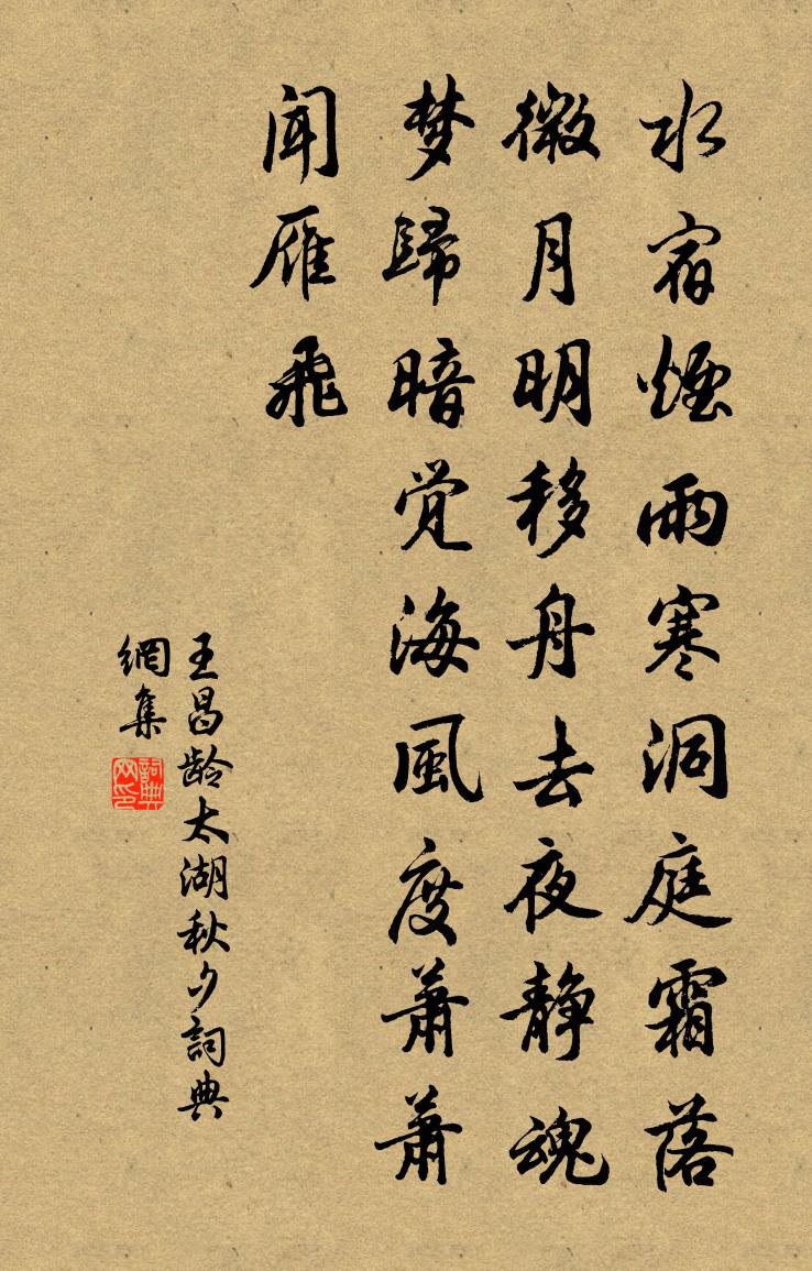 王昌齡吟詠蘇州的詩,僅此一篇。深秋的一個夜晚,詩人宿在太湖的一條小船上,月光下,小船在水上慢慢地移動。夜是如此地安靜,湖面泛起一片寒氣,洞庭山落下一層微霜。詩人似睡非睡,似夢非夢,隱隱地感到海風吹過,聽到遠遠的地方有大雁南飛的聲音。詩人為我們描繪了一幅寧靜的太湖秋夕圖。