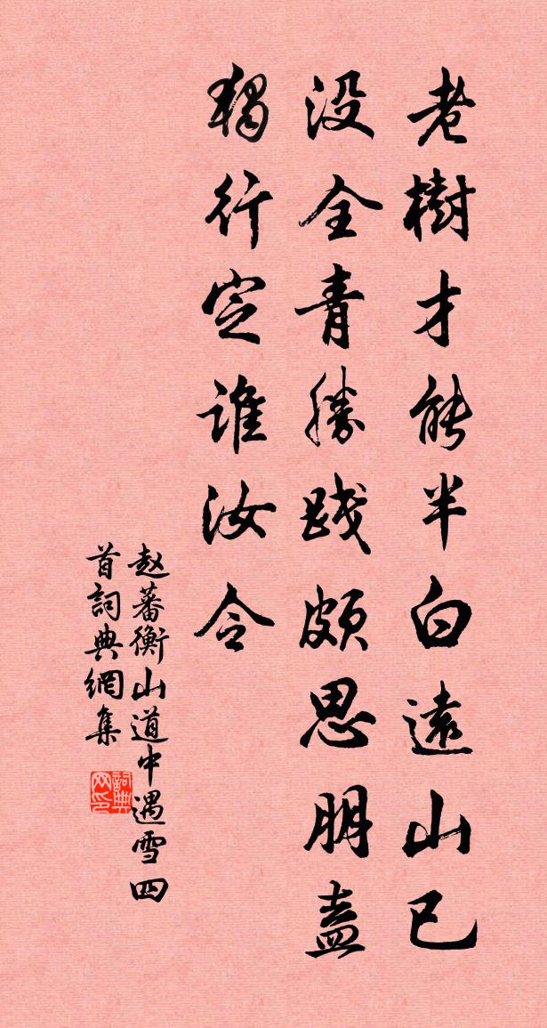 詩詞名句歷史字典書法欣賞書法字典國語詞典說文解字康熙字典古漢語字典標 題 作 者 詩 句 衡山道中遇雪四首作者:趙蕃 朝代:宋代衡山道中遇雪四首原文老樹才能半白,遠山已沒全青。勝踐頗思朋盍,獨行定誰汝令。詩詞問答問:衡山道中遇雪四首的作者是誰?答:趙蕃問:衡山道中遇雪四首寫於哪個朝代?答:宋代趙蕃衡山道中遇雪四首書法欣賞衡山道中遇雪四首書法作品詩詞推薦老樹鄭獬〔宋代〕老樹十百圍,赤日不滿影。廟貌畫鬼神,焰閃見光景。閭里頗驚動,豚壺日叩請。小巫口吟呀,祝奠屢折磬。安敢全守支耀卿飲餞七里倅楊仲宣復攜具至深溪酌范成大〔宋代〕店舍煙火寒,塵沙亭堠遠。嫣紅糝芸綠,春事亦已晚。年芳去踆踆,江水來袞袞。故人瀟湘逢,留落一笑莞。已張香林洞楊蟠〔宋代〕百年樵斧外,留得掛寒猿。不奈西溪水,流香出洞門。貽山甫舒岳祥〔宋代〕多病空餘老,勞生為苦思。偶然新得句,長是不眠時。鼠攪歉無肉,傭逃怨食糜。此懷誰可訴,只恐則山知。頌古三首釋可封〔宋代〕阿魏無真,水銀無假。老倒南泉,可知禮也。歲暮海上作孟浩然〔唐代〕仲尼既已沒,余亦浮於海。①昏見斗柄回,方知歲星改。②虛舟任所適,垂釣非有待。③為問乘槎人,滄洲復何在和運司園亭潺玉亭孫甫〔宋代〕迴環引細泉,泉聲漱檐底。美哉知者心,清通樂流水。琤琮戛鳴球,淅瀝 * 綺。塵慮無由得,何須洗雙耳。減字木蘭花(呈鑒義王介甫)張繼先〔宋代〕嚴寒冬月。前日陽生幾降雪。松柏凌霄。森聳庭中嘆後凋。昔人猶豫。身入山林深靜處。今古同符。好趁笙歌且自和聶之美雞澤官舍詩七首柳司馬光〔宋代〕驛道苦車馬,田廬悲斧斤。誰栽官舍前,老朽完天夫。所願明府心,庇村如庇人。春波堂小飲懷棠湖舊隱三首岳珂〔宋代〕虛欄四面挹湖光,最愛薰風六月涼。萬朵鞭蕖紅影鬧,兩行楊柳綠絲長。鋪陳雪月晶明態,商略陰晴濃淡妝。四序虛舟何耕〔宋代〕君不見江乾車馬紛相送,巨艑峨峨船載重。西南使者解官歸,水淺著沙牽不動。如君材具豈多得,合侍明光參法從吊雙泉大師真塔齊己〔唐代〕塔聳層峰後,碑鐫巨石新。不知將一句,分付與何人。靜坐雲生衲,空山月照真。後徒游禮者,猶認指迷津。賀新郎(和陳新淥觀競渡韻)趙必〔宋代〕繡口琅玕腹。美人兮、陽春一曲,華貂難續。喚醒荷花歸棹夢,猶憶紅塵迷目。只消得、烏飛兔逐。往事已隨流水生查子(和李商老)謝薖〔宋代〕情親難語離,且盡玻璃盞。雙鯉有來時,莫使音書緩。征驂去若飛,不道家山遠。相見小馮君,笑語迎歸雁。惠山雲開複合楊萬里〔宋代〕二年常州不識山,惠山一見開心顏。只嫌雨里不子細,髣佛隔簾青玉鬟。天風忽吹白雲坼,翡翠屏開倚南極。政緣與鄭少融、趙養民二使者訪古訾家洲,歸憩松范成大〔宋代〕飄飄竹雨潤輕裘,嫋嫋松風系小舟。安得從容興廢手,越人重上訾家洲。回陸主簿賀生日詩陽枋〔宋代〕南華眇夸靈椿樹,八千為秋八千春。要是循名須責實,人生三萬六千日。世間修短皆自然,造化到底難為言。一十好事近·中秋席上和王路鈐辛棄疾〔宋代〕明月到今宵,長是不如人約。想見廣寒宮殿,正雲梳風掠。夜深休更喚笙歌,檐頭雨聲惡。不是小山詞就,這一場病起白居易〔唐代〕病不出門無限時,今朝強出與誰期?經年不上江樓醉,勞動春風揚酒旗。桃源憶故人史達祖〔宋代〕雙鴛蹙月天津近。歸後嫩情常剩。燈市一年愁凝。心共梅花冷。網塵洞戶春沈靜。衰盡冶遊情性。羞見素娥嬌影。名句推薦依舊桃花面,頻低柳葉眉。韋莊《女冠子·昨夜夜半》 野老念牧童,倚杖候荊扉。王維《渭川田家》 醉折殘梅一兩枝,不妨桃李自逢時。陸游《落梅》 劉郎已恨蓬山遠,更隔蓬山一萬重!李商隱《無題·來是空言去絕蹤》 淡淡橫朝煙,脈脈深秋思。劉道著《湘江秋曉》 胡未滅,鬢先秋。淚空流。陸游《訴衷情·當年萬里覓封侯》 胭脂雪瘦熏沉水,翡翠盤高走夜光。蔡松年《鷓鴣天·賞荷》 亂點鴛鴦譜馮夢龍《醒世恆言·卷八》 長風破浪會有時,直掛雲帆濟滄海。李白《行路難·其一》 花褪殘紅青杏小。燕子飛時,綠水人家繞。蘇軾《蝶戀花·春景》