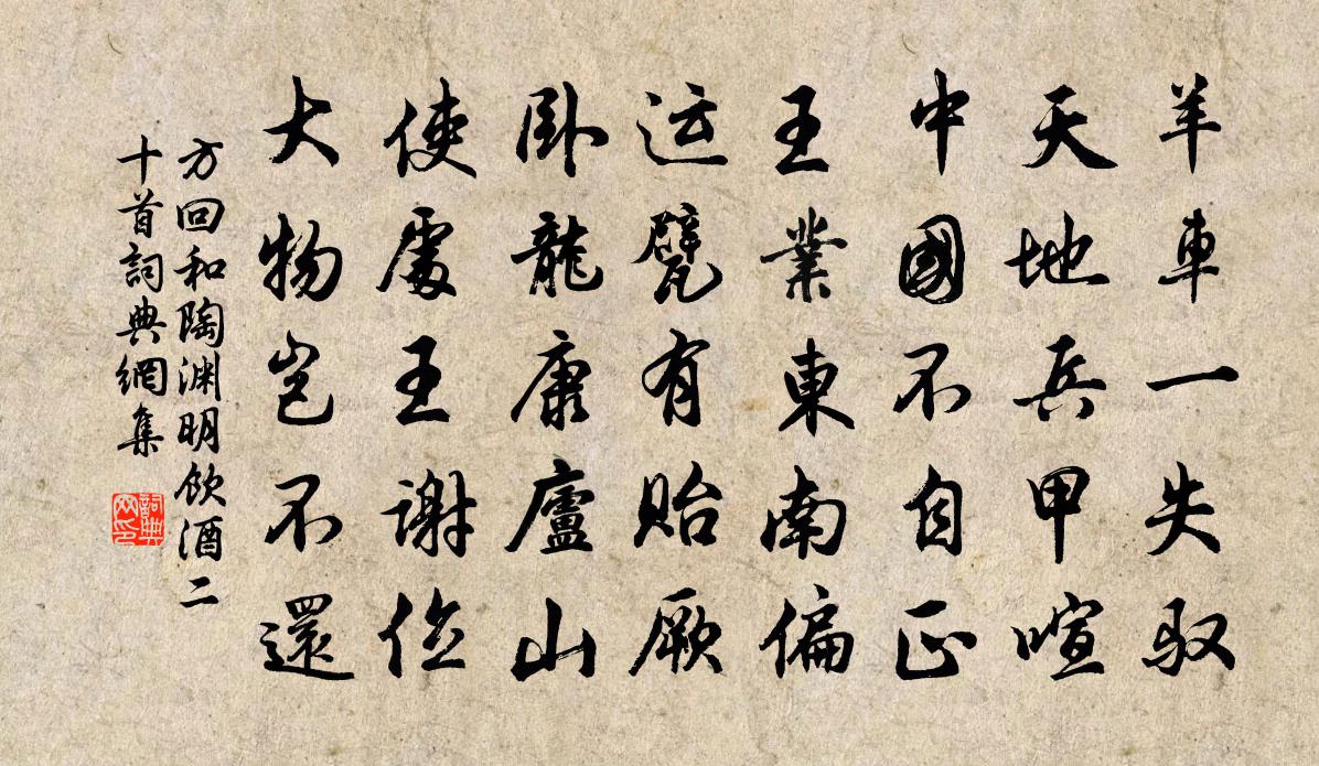 詩詞名句歷史字典書法欣賞書法字典國語詞典說文解字康熙字典古漢語字典標 題 作 者 詩 句 和陶淵明飲酒二十首作者:方回 朝代:宋代和陶淵明飲酒二十首原文羊車一失馭,天地兵甲喧。中國不自正,王業東南偏。運甓有貽厥,臥龍康廬山。使處王謝位,大物豈不還。詩詞問答問:和陶淵明飲酒二十首的作者是誰?答:方回問:和陶淵明飲酒二十首寫於哪個朝代?答:宋代方回和陶淵明飲酒二十首書法欣賞和陶淵明飲酒二十首書法作品詩詞推薦觀史黃庚〔宋代〕梧風蕭瑟雨初晴,涼入書堂夜氣清。耿耿蘭膏照千古,遲遲蓮漏轉三更。力於興廢應難助,氣為忠邪幾不平。掩卷上巳有懷金明池游賞賀鑄〔宋代〕西城小雨宿塵消,春水溶溶拍畫橋。舍翠汀洲白苹發,披香宮殿紫雲高。彩舟日晚綺羅醉,油幕風晴絲管焦。俠少招子昂飲歌戴表元〔宋代〕與君相逢難草草,與君相逢苦不早。人生何處小泥塗,此日飄零武林道。武林城中馬如雲,閉屋狂歌人不聞。狂歌頌一百則釋重顯〔宋代〕雪團打,雪團打,龐老機關沒可把。天上人間不自知,眼裡耳里絕蕭灑。蕭灑絕,碧眼胡僧難辨別。同賈運使章職方王推官賞梅鄭獬〔宋代〕花前留客解金鞍,揀遍繁梢盡折殘。翠帽插來無處著,玉盤收取與人看。無言有意空相對,欲去重來更繞欄。把酒和杜叔高相約湖上韻徐僑〔宋代〕湖上朝市兩忘言,勝趣何須頻出門。要並雪岩尋酒伴,更從梅隱覓詩魂。風低雁漵數行影,煙障鳧波幾疊痕。此意送郭大夫元振再使吐蕃張說〔唐代〕犬戎廢東獻,漢使馳西極。長策問酋渠,猜阻自夷殛。容發徂邊歲,旌裘敝海色。五年一見家,妻子不相識。武庫山中贈耿拾遺湋兼兩省故人秦系〔唐代〕數片荷衣不蔽身,青山白鳥豈知貧。如今非是秦時世,更隱桃花亦笑人。偈頌七十八首釋正覺〔宋代〕去時不出戶,來時不入門。清癯山有骨,閒澹雲無根。歸家奉祖禰,了事還兒孫。雲水通方士,相期報佛恩。大酺方千里〔宋代〕正夕陽間,秋光淡,鴛瓦參差華屋。高低簾幕迥,但風搖環珮,細聲頻觸。瘦怯單衣,涼生兩袖,零亂庭梧窗竹。光山道中黃庭堅〔宋代〕客子空知行路難,中田耕者自高閒。柳條鶯囀清陰里,楸樹蟬嘶翠帶間。夢幻百年隨逝水,勞歌一曲對青山。出門偈傾一百三十三首釋法薰〔宋代〕尋常顛說倒說,何曾開口動舌。不妨雪上加霜,更與諸人一決。風入松王吉昌〔元代〕乾坤兩卦上天梯。分柔健高低。六關爻變推天道,斡璇璣、日月東西。妙采精華成液,通神息,飲刀圭。溶溶金水送太乙真君酒青城丈人〔唐代〕峨嵋仙府靜沈沈,玉液金華莫厭斟。凡客欲知真一洞,劍門西北五雲深。芍藥五首張嵲〔宋代〕芳氣時時侵鼻觀,令人三復柳州詩。非因寂寞耽幽意,醉倒花間未必知。雜述林泳〔宋代〕書生鑽故紙里,衲子轉法華時。易有九事未解,禪無一句可疑。送越州裴參軍充使入京孫逖〔唐代〕日落川徑寒,離心苦未安。客愁西向盡,鄉夢北歸難。霜果林中變,秋花水上殘。明朝渡江後,雲物向南看。雙林志謙得玄暉筆法作此七十三矣為賦六言兩洪咨夔〔宋代〕近浦霏開略彴,遠山雲沒招提。樹底人家欲曉,隔籬仿佛雞啼。讀金鑾密記劉克莊〔宋代〕仗下千官走似麇,倉皇誰扈屬車塵。禁中陸九艱危共,殿上朱三苦死嗔。當日橫身抗岐汴,暮年避地客甌閩。小窗三和劉克莊〔宋代〕交疏認鹿為山友,客少呼猿作野賓。藏手澤書慚忝祖,食躬耕粟恥求人。腹無點墨寧非懶,腰有重金未是貧。已把名句推薦君子尊其所聞,則高明矣;行其所聞,則廣大矣,高明廣大,不在於他,在加之志而已矣。戴聖《大戴禮記·曾子疾病第五十七》 綠竹含新粉,紅蓮落故衣。王維《山居即事》 涼風起天末,君子意如何。杜甫《天末懷李白》 受人之託,忠人之事馮夢龍《警世通言·卷三十四》 玉門山嶂幾千重,山北山南總是烽。王昌齡《從軍行七首》 江帶峨眉雪,川橫三峽流。李白《經亂離後天恩流夜郎憶舊遊書懷贈江夏韋太守良宰》 雨過一蟬噪,飄蕭松桂秋。杜牧《題揚州禪智寺》 衣懶換,酒難賒。可憐此夕看梅花。吳文英《思佳客·癸卯除夜》 接天蓮葉無窮碧,映日荷花別樣紅。楊萬里《曉出淨慈寺送林子方》 寒食時看郭外春,野人無處不傷神。雲表《寒食詩》