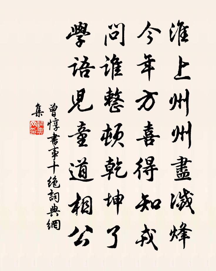 詩詞名句歷史字典書法欣賞書法字典國語詞典說文解字康熙字典古漢語字典標 題 作 者 詩 句 書事十絕作者:曾惇 朝代:宋代書事十絕原文淮上州州盡滅烽,今年方喜得知戎。問誰整頓乾坤了,學語兒童道相公。詩詞問答問:書事十絕的作者是誰?答:曾惇問:書事十絕寫於哪個朝代?答:宋代曾惇書事十絕書法欣賞書事十絕書法作品詩詞推薦好事近(十二之六)陸游〔宋代〕揮袖別人間,飛躡峭崖蒼壁。尋見古仙丹灶,有白雲成積。心如潭水靜無風,一坐數千息。夜半忽驚奇事,看鯨波故陳氏畫像贊黃庭堅〔宋代〕女歸能婦,義止宜家。誰其向道,探深見遐。入古人室,立妙法句。自履實地,告人悟處。忽爾心疾,累歲狂痴。絕句張伯端〔宋代〕饒君了悟真如性,未免拋身卻入身。何似更兼修大藥,頓超無漏作真人。五龍六首佚名〔宋代〕明明天子,禮文鹹秩。矧神之功,橫被九域。雲施稱民,物產滋殖。嘉承惠和,罔有終極。朝中措張掄〔宋代〕湖光染翠□□□。□□□□□。□愛江湖光景,不曾別做□□。□□□□,□□□□,□□儂家。醉臥水雲□□,櫓聲崔塗〔唐代〕煙外橈聲遠,天涯幽夢回。爭知江上客,不是故鄉來。詞笑令(⑧採蓮)秦觀〔宋代〕詩曰:若耶溪邊天氣秋。採蓮女兒溪岸頭。笑隔荷花共人語,煙波渺渺盪輕舟。數聲水調紅嬌晚。棹轉舟回笑人遠餞席重送從叔余之梓州李商隱〔唐代〕莫嘆萬重山,君還我未還。武關猶悵望,何況百牢關。又和開叔司馬光〔宋代〕寒梅狃發榮,大隱又專名。異種生江渚,何年到洛城。色如虛室白,香似主人清。向使吳兒見,不思菰菜羹。三天竺還五首方回〔宋代〕松枝垂地蔭松身,恨不移家此卜鄰。石上一根長數丈,似吾細看更無人。表弟廷憑章得象知信州玉山縣楊億〔宋代〕懷玉煙霞接武夷,我思祖德涕沾衣。縣齋製錦留遺愛,庭樹藏環長舊園。彭澤公田今已廢,遼東邑子半應非。津亭寄遠釋智圓〔宋代〕車聲日日碾紅埃,何事良人獨未回。苔鎖洞房書久絕,月明深夜雁空來。寒侵竹葉難成醉,塵暗菱花更懶開。杳杳大晟府擬撰釋奠十四首佚名〔宋代〕[太簇為徽]巍巍堂堂,其道如天。清明之象,應物而然。時維上丁,備物薦誠。維親禱典,樂諧中聲。陪馮使君游六首過相思嶺貫休〔唐代〕譽自馨香道自怡,相思嶺上卻無機。荒渠葉覆深霞在,片石人吟一鳥飛。何處風砧傳古曲,誰家冢樹掛斜暉。因思歸沛縣道中晚泊留侯城劉長卿〔唐代〕訪古此城下,子房安在哉。白雲去不反,危堞空崔嵬。伊昔楚漢時,頗聞經濟才。運籌風塵下,能使天地開。蔓草夢退堂師蘇泂〔宋代〕碧眼霜顱事已非,夢中相見只攢眉。推敲有法猶分付,一似高麗寺里時。梅花曲劉幾〔宋代〕結子非貪,有香不俗,宜當鼎鼐嘗。偶先紅紫,度韶華、玉笛占年芳。眾花雜色滿上林,未能教、臘雪埋藏。卻怕初夏陸游〔宋代〕白白餈筒美,青青米果新。衰遲重時節,薄少遍鄉鄰。梅市花成幄,蘭亭草作茵。極知歡意盡,強起伴遊人。前調李呂〔宋代〕紅臂韝。淺淺綠靴雙鳳困。柳弱花慵斂新悶。嬌多無力憑熏籠,又報杏園春意盡春盡。斂新悶。暗傍銀屏撩綠鬢。寄別者張籍〔唐代〕寒天正飛雪,行人心切切。同為萬里客,中路忽離別。別君汾水東,望君汾水西。積雪無平岡,空山無人蹊。羸馬名句推薦林花謝了春紅,太匆匆。無奈朝來寒雨晚來風。李煜《相見歡·林花謝了春紅》 送君九月交河北,雪裡題詩淚滿衣。岑參《送崔子還京》 淇則有岸,隰則有泮。佚名《氓》 令必行,禁必止。韓非及後人《韓非子·飾邪》 今日聽君歌一曲,暫憑杯酒長精神。劉禹錫《酬樂天揚州初逢席上見贈》 濤瀾洶湧,風雲開闔。蘇轍《黃州快哉亭記》 相顧無言,惟有淚千行。蘇軾《江城子·乙卯正月二十日夜記夢》 自有多情處,明月掛南樓。米芾《水調歌頭·中秋》 辟如天地之無不持載,無不覆幬。辟如四時之錯行,如日月之代明。子思《中庸·第三十章》 別日南鴻才北去,今朝北雁又南飛。魚玄機《閨怨》