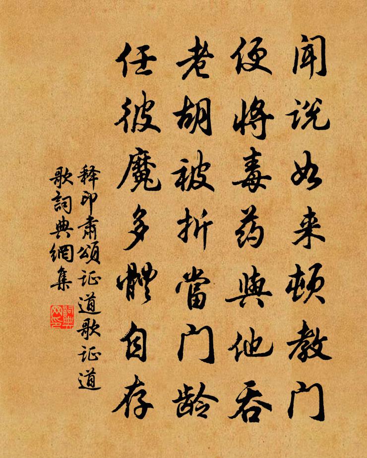 詩詞名句歷史字典書法欣賞書法字典國語詞典說文解字康熙字典古漢語字典標 題 作 者 詩 句 頌證道歌證道歌作者:釋印肅 朝代:宋代頌證道歌證道歌原文聞說如來頓教門,便將毒藥與他吞。老胡被折當門齡,任彼魔多體自存。詩詞問答問:頌證道歌證道歌的作者是誰?答:釋印肅問:頌證道歌證道歌寫於哪個朝代?答:宋代釋印肅頌證道歌證道歌書法欣賞頌證道歌證道歌書法作品詩詞推薦台城路(抵吳,書寄舊友)張炎〔宋代〕分明柳上春風眼,曾看少年人老。雁拂沙黃,天垂海白,野艇誰家昏曉。驚心夢覺。謾慷慨悲歌,賦歸不早。想得李廙佚名〔〕李廙為尚書左丞,有清德。其妹,劉晏妻也。晏方秉權,嘗詣宅,延至室。晏見其門帘甚弊,乃令人潛度廣狹,後月琴吟贈程禹仲仇遠〔宋代〕我月琴太古色,琴我琴太古琴音。色見琴音聲求,焉能知我心。月到茅亭夜亭午,據梧坐看胎仙舞。本無圓缺無虧了翁釋妙倫〔宋代〕踏斷草鞋,拗折拄杖。徹底風流,匙挑不上。擬問如何,擘面便掌。鷓鴣天(再賦)陳耆卿〔宋代〕艷朵珍叢間舞衣。蹴球場外打紅圍。小輿穿入花深處,且住簪花醉一卮。秋欲盡,最憐伊。江梅未破菊離披。情知法曲獻仙音姜夔〔宋代〕虛閣籠寒,小簾通月,暮色偏憐高處。樹隔離宮,水平馳道,湖山盡入尊俎。奈楚客淹留久,砧聲帶愁去。屢回顧船頭韓偓〔唐代〕兩岸綠蕪齊似翦,掩映雲山相向晚。船頭獨立望長空,日艷波光逼人眼。詠史詩會稽山胡曾〔唐代〕越王兵敗已山棲,豈望全生出會稽。何事夫差無遠慮,更開羅網放鯨鯢。和北京王郎中見訪留詩邵雍〔宋代〕車從賞春來北京,耿君先期已馳情。此時殞霜奈何重,今歲花開徒有聲。既辱佳章仍墜刺,寧無累句代通名。天之海棠陸游〔宋代〕今日春已半,風雨停出遊。缾中海棠花,數酌相獻酬。尚想錦官城,花時樂事稠。金鞭過南市,紅燭宴西樓。千林曹娥廟胡仲弓〔宋代〕黃絹碑殘香草生,當時淚眼不曾晴。至今流水聲嗚咽,猶是曹娥哀怨聲。邢氏園池上作趙蕃〔宋代〕可意於茲夕,乃能來此風。稻畦初吠蛤,草岸已鳴蟲。三徑思茅屋,歸艎憶釣筒。淵明寧隱者,魯望豈漁翁。一春風雨太半有感陸游〔宋代〕忽忽春將老,寒暄尚未齊。雨昏雞唱晚,風惡鵲巢低。寫物才殊退,尋芳思欲迷。餘年不須較,只是死秦稽。句潘正夫〔宋代〕嶺開越嶠通交趾,路轉荊門入九疑。韋氏館與周隱客、杜歸和泛舟元稹〔唐代〕天色低澹澹,池光漫油油。輕舟閒繳繞,不遠池上樓。時物欣外獎,真元隨內修。神恬津藏滿,氣委支節柔。眾處眼兒媚(送別)王質〔宋代〕雨潤梨花雪未乾。猶自有春寒。不如且住,清明寒食,數日之間。想君行盡嘉陵水,我已下江南。相看萬里,時須一落索(牡丹次謝主簿韻)趙以夫〔宋代〕露沁香肌嬌秀。燕脂微透。蕊宮仙子駕祥鸞,被風卷、霞衣皺。輕翦倩他紅袖。簪來盈首。直須沈醉此花前,怕花題龍隱岩王迤祖〔宋代〕龍蟠此地不知年,飛去穿成萬仞淵。霖雨四方今欲遍,後人空自想蜿蜓。是日至馬祖岩和前韻李昴英〔宋代〕九秋天地香,贛產饒木犀。登高詣其巔,風健戲馬嘶。偷得一日閒,古錦奚奴攜。秋陽閣霏雨,飛蓋換障泥。舉揚西江月王哲〔元代〕堪嘆離門坎戶。須鄰甲地庚途。暗中拍手笑相呼。款款合和一處。既把金闕鎖住。牡羊隊隊成珠。西江月里玉蟾孤名句推薦戍鼓斷人行,邊秋一雁聲。杜甫《月夜憶舍弟》 朝騁騖兮江皋,夕弭節兮北渚;屈原《九歌》 富貴易生禍端,必忠厚謙恭,才無大患王永彬《圍爐夜話·第六三則》 夜來疏雨鳴金井,一葉舞空紅淺。王月山《齊天樂·夜來疏雨鳴金井》 有生之樂,無死之心劉向《戰國策·齊六·田單將攻狄》 玉皇開碧落,銀界失黃昏。毛滂《臨江仙·都城元夕》 滿堂唯有燭花紅,歌且從容,杯且從容。辛棄疾《一剪梅·中秋元月》 君子之學也,入乎耳,著乎心荀子《荀子·勸學》 寒夜客來茶當酒,竹爐湯沸火初紅。杜耒《寒夜》 芄蘭之葉,童子佩韘。佚名《芄蘭》