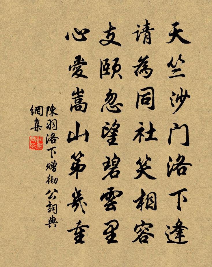 詩詞名句歷史字典書法欣賞書法字典國語詞典說文解字康熙字典古漢語字典標 題 作 者 詩 句 洛下贈徹公作者:陳羽 朝代:唐代洛下贈徹公原文天竺沙門洛下逢,請為同社笑相容。支頤忽望碧雲里,心愛嵩山第幾重。詩詞問答問:洛下贈徹公的作者是誰?答:陳羽問:洛下贈徹公寫於哪個朝代?答:唐代問:洛下贈徹公是什麼體裁?答:七絕陳羽洛下贈徹公書法欣賞洛下贈徹公書法作品注釋全唐詩:卷348-49詩詞推薦聖政更新詔書正告訐之罪因得小詩十首韓元吉〔宋代〕惡復凶終事久知,豈知聖斷不逾時。小儒未嘆周南滯,但喜逢人敢說詩。以喜離過墨贈吾婿鄭純父玸五邁〔宋代〕西蜀遊方昌,贈我墨兩個,墨上署嘉名,名曰喜聞過。過失人誰無,剛褊柔易愞。眾人巧自文,君子喜人告。予性賢者之孝二百四十首李晟林同〔宋代〕個是一孤兒,曾聞事母時。身能幾許大,卻佩國安危。曉郭印〔宋代〕客宵無一事,達曉夢魂安。窗隙檐光入,更籌漏水乾。田園終計決,遊宦久心闌。懶起趨朝謁,從渠困馬鞍。次韻虞萬州見寄除夕江村餞臘二首魏了翁〔宋代〕處士西城落照邊,春風吹袂意泠然。閒中受用封千戶,聖處功夫祿九遷。竹外緩觴留急景,沙頭飽飯看豐年。詩來六言山居釋紹曇〔宋代〕石磵霜凝松粉,竹籬雪點梅膚。春到山家日遠,愧貧管領全無。送王敦素歸金陵王銍〔宋代〕曉踏河堤月,逢有問去舟。已為羇旅客,更挽別離愁。索寞憐同姓,丁寧數舊遊。欲知幽獨意,風露滿城秋。句李大力〔宋代〕可憐一代經綸業,不抵鐘山幾首詩。重陽前二日喜雨答泗州郭從事宋祁〔宋代〕雨洗淮天旱始摧,正堪憑遠上高台。萸津菊潤齋醅熟,共助重陽辟惡杯。金山寺林景熙〔宋代〕吳楚風煙畫裹看,中流樹色擁禪關。一星化石江成陸,雙塔摩空寺裹山。衲寄雲林清海怪,泉移蛟窟照僧間。千年體南先生戒途有日惠詩為別三復黯然和韻奉送黃公度〔宋代〕摶抄聚散苦匆匆,歲晚山寒吾道東。萬木飄蕭催客老,一官去住任天公。情知今夕芳尊倒,魂斷長亭返照紅。卻喜寄唐生白居易〔唐代〕賈誼哭時事,阮籍哭路岐。唐生今亦哭,異代同其悲。唐生者何人?五十寒且飢。不悲口無食,不悲身無衣。所悲答原父歐陽修〔宋代〕炎歊郁然蒸,午景熾方焰。子來清風興,蕭蕭吹幾簟。又如沃瓊漿,遽飲不知厭。嗟予學苦晚,白首困鉛槧。危疑觀海潮王義山〔宋代〕憑誰撼得海門開,疑是神兵著力推。霎地起來銀一線,駕山捲起雪千堆。列江畫舫浮天去,幾片紅旗逐浪回。畢竟華亭吳江道中偶作十絕朱長文〔唐代〕吹散青雲見好峰,家林祗在此山東。寄聲猿鶴休悲怨,蕙帳今宵遂不空。湖口望大孤范成大〔宋代〕廬阜岡勢斷,江流漭相通。大孤如小冠,插入奫淪中。我欲蛻濁浪,往馭揚瀾風。晃晃銀 * ,瀅瀅水晶宮。濯足偈十二首釋文準〔宋代〕天道運行,節氣頻更。五日為候,十日為旬。三十日為月,十二月為年。一日一日,因循因循。五九盡,又逢春。十日二首蘇轍〔宋代〕酒經重九尚殘卮,雨送初寒問篋衣。養氣安閒真得計,讀書勤苦已知非。謾存講說傳家學,深謝交遊絕世譏。築室倚鞦韆(寓好事近)張輯〔宋代〕人在玉屏閒,逗曉柳絲風急。簾外杏花微雨,罩春紅愁濕。單衣初試麴塵羅,中酒病無力。應是繡床慵困,倚鞦韆和子由除夜元日省宿致齋三首蘇軾〔宋代〕江湖流落豈關天,禁省相望亦偶然。等是新年未相見,此身應坐不歸田。名句推薦儉則傷事,侈則傷貨管仲《管子·乘馬》 十五彩衣年,承歡慈母前。孟浩然《送張參明經舉兼向涇州覲省》 乍咽涼柯,還移暗葉,重把離愁深訴王沂孫《齊天樂·蟬》 刑稱罪,則治;不稱罪,則亂。荀子《荀子·正論》 僵臥孤村不自哀,尚思為國戍輪台。陸游《十一月四日風雨大作》 揉藍衫子杏黃裙,獨倚玉闌無語點檀唇。秦觀《南歌子·香墨彎彎畫》 滿羅衫是酒,香痕凝處,唾碧啼紅相半。張翥《陌上花·有懷》 謗書盈篋不復辯,脫身來看江南山。謝逸《送董元達》 小人肥口,君子肥身。佚名《增廣賢文·下集》 柳鎖鶯魂,花翻蝶夢,自知愁染潘郎史達祖《夜合花·柳鎖鶯魂》