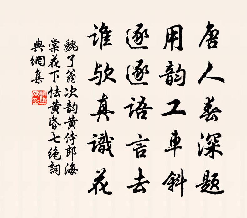 詩詞名句歷史字典書法欣賞書法字典國語詞典說文解字康熙字典古漢語字典標 題 作 者 詩 句 次韻黃侍郎海棠花下怯黃昏七絕作者:魏了翁 朝代:宋代原文唐人春深題,用韻工車斜。逐逐語言去,誰歟真識花。詩詞問答問:《次韻黃侍郎海棠花下怯黃昏七絕》的作者是誰?答:魏了翁問:該詩寫於哪個朝代?答:宋代書法欣賞次韻黃侍郎海棠花下怯黃昏七絕書法作品詩詞推薦和太素同看梅花寄子華韓維〔宋代〕寒林凍卉誰觀者,繁艷清香自得子。天賦好花如有待,日尋幽徑不知疲。未逢驛使空懷遠,猶喜山翁亦好奇。昔歲念奴嬌(丁卯上巳,燕集葉尚書蕊香堂賞海棠,即席賦之)張元乾〔宋代〕蕊香深處,逢上巳、生怕花飛紅雨。萬點胭脂遮翠袖,誰識黃昏凝佇。燒燭呈妝,傳杯繞檻,莫放春歸去。垂絲無道旁桐花楊萬里〔宋代〕春色來時物喜初,春光歸日興闌余。更無人餞春行色,猶有桐花管領渠。晚春胡仲弓〔宋代〕萬紅千紫已摧殘,留得荼醾一架看。燕子不知人意懶,飛來簾里訴春寒。就報恩借碾碾茶彝老有詩因次其韻喻良能〔宋代〕斷無鵝鴨惱比鄰,賴有鍾魚隔竹聞。故遣新茶就佳磑,要供戲彩滿甌雲。仙鶴篇武三思〔唐代〕白鶴乘空何處飛,青田紫蓋本相依。緱山七月雖長去,遼水千年會憶歸。緱山杳杳翔寥廓,遼水累累嘆城郭。經隨張建封大夫奏係為校書郎因寄此作秦系〔唐代〕久是煙霞客,潭深釣得魚。不知芸閣上,遺校幾多書。浣溪沙·初夏葉小鸞〔清代〕香到酴醾送晚涼,荇風輕約薄羅裳。曲闌憑遍思偏長。自是幽情慵卷幌,不關春色惱人腸。誤他雙燕未歸梁。挽曹侍郎方岳〔宋代〕諸老各凋零,公乎獨典刑。草堂春得句,雪戶夜談經。歲月頭從白,江山眼共青。斯文今已矣,天亦自冥冥。三君詠狄梁公(仁傑)高適〔唐代〕梁公乃貞固,勛烈垂竹帛。昌言太后朝,潛運儲君策。待賢開相府,共理登方伯。至今青雲人,猶是門下客。文宣王及其弟子贊宋高宗〔宋代〕兄弟之邦,士有廉庸。涵泳素教,表揭儒宗。杏壇探頤,洙泗從容。作興一時,莒父其封。偈傾一百三十三首釋法薰〔宋代〕大道體寬,無易無難。相頭買帽,此土西天。雜詠一百首詹尹劉克莊〔宋代〕魚腹纍臣訣,蛾眉眾女仇。靈均空發問,詹尹若為酬。夜聽許十一誦詩愛而有作杜甫〔唐代〕許生五台賓,業白出石壁。余亦師粲可,身猶縛禪寂。何階子方便,謬引為匹敵。離索晚相逢,包蒙欣有擊。誦詩齊天樂(簿廳壁燈)趙必〔宋代〕紅紛綠鬧東風透,暖得枳花香也。雪柳拈金,玉梅鋪粉,妝點春光無價。鰲蓬如畫。簇萬頃芙蕖,桂華相射。艷冶頌古一百二十一首釋宗杲〔宋代〕背觸非遮護,明明直舉揚。吹毛雖不動,遍地是刀槍。春雨漫興袁易〔元代〕日日春陰只欲眠,強尋南陌復東阡。猶殘碧樹花多少,莫惜金尊酒十千。象管烏絲題往事,玉簫錦瑟負華年。愁來上元應製夏竦〔宋代〕魚龍曼衍六街呈,金鎖通宵啟玉京,冉冉游塵生輦道,遲遲春箭入歌聲。實坊月皎龍燈淡,紫館風微鶴焰平。蘭丁謂〔宋代〕彼羨南陔子,其誰粉署郎。渥丹承露彩,紺綠泛風光。屢結騷人佩,時飄鄭國香。何須尋九畹,十步即芬芳。點絳唇宋先生〔宋代〕這個工夫,因師傳授知元祖。論甚子午。說甚龍和虎。只在目前,明有神仙路。速修取。有朝歸去。消了陰司簿。名句推薦女曰雞鳴,士曰昧旦。佚名《女曰雞鳴》 山甫歸應疾,留侯功復成。張九齡《奉和聖制送尚書燕國公赴朔方》 戚姬髡髮入舂市,萬古共悲辛。李白《中山孺子妾歌》 己所不欲,勿施於人。孔子弟子《論語·顏淵篇》 歲歲金河復玉關,朝朝馬策與刀環。柳中庸《征人怨 / 征怨》 愁與西風應有約,年年同赴清秋。史達祖《臨江仙·閨思》 長因送人處,憶得別家時張籍《薊北旅思/送遠人》 蜃散雲收破樓閣,虹殘水照斷橋粱。白居易《江樓晚眺景物鮮奇吟玩成篇寄水部張員外》 古之史也辯道,今之史也耀文。王通《中說·卷三·事君篇》 穠艷一枝細看取,芳心千重似束。蘇軾《賀新郎·夏景》