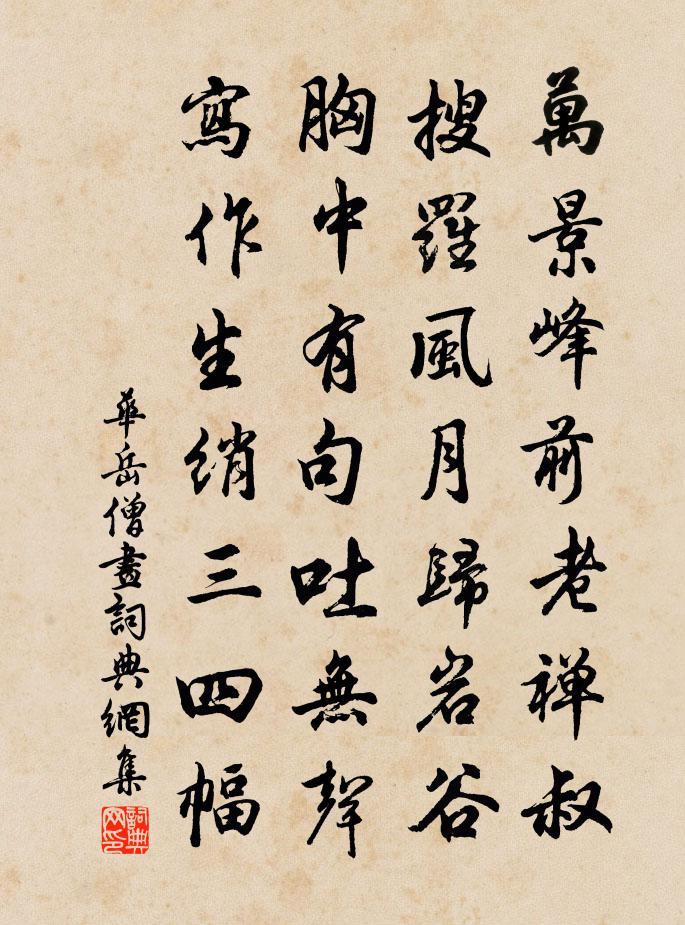 詩詞名句歷史字典書法欣賞書法字典國語詞典說文解字康熙字典古漢語字典標 題 作 者 詩 句 僧畫作者:華岳 朝代:宋代僧畫原文萬景峰前老禪叔,搜羅風月歸岩谷。胸中有句吐無聲,寫作生綃三四幅。詩詞問答問:僧畫的作者是誰?答:華岳問:僧畫寫於哪個朝代?答:宋代華岳僧畫書法欣賞僧畫書法作品詩詞推薦過襄陽樓呈上府主嚴司空樓在江陵節度使宅北隅元稹〔唐代〕襄陽樓下樹陰成,荷葉如錢水面平。拂水柳花千萬點,隔樓鶯舌兩三聲。有時水畔看雲立,每日樓前信馬行。早晚湖山十景兩峰插雲王洧〔宋代〕浮圖對立曉崔嵬,積翠浮空霽靄迷。試向鳳凰山上望,南高天近北煙低。次韻王簽判二首陳造〔宋代〕五鬼侵陵兩鬢蒼,振窮掃白分無妨。酒徒叢里投名懶,詩社中間趁課忙。塵暗鳳笙空自嘆,風驚雁字不能行。向君脫京口上岸難文天祥〔宋代〕岸行五里入真州,城外荒荒鬼也愁。忽聽路人嗟嘆說,昨朝哨馬到江頭。蝶軒讀易幾舒岳祥〔宋代〕負薪收芋栗,捫虱曝荊扉。落日烏行亂,清霜杏葉飛。歲窮終有復,人老自知非。兀兀窗西夜,吾方理易幾。得成都諸友書勸少留嘉陽戲作陸游〔宋代〕一坐五十日,痴頑良可哀。新涼為醉地,少訟作慵媒。市柳風煙慘,汀苹歲月催。遠官從漫浪,垂老嬾低回。如上人歸問浙中友信仇遠〔宋代〕何年駐錫下山中,即見匆匆又欲東。燕去鴻來俱是客,雲生月落不離空。冷泉亭上參吟暢,飛雪若前哭老同。方外白髮喪女師作歐陽修〔宋代〕吾年未四十,三斷哭子腸。子割病莫忍,屢痛誰能當。割腸痛連心,心碎骨亦傷。出我心骨血,灑為清淚行。淚多雜曲歌辭。踏歌詞謝偃〔唐代〕春景嬌春台,新露泣新梅。春葉參差吐,新花重迭開。花影飛鶯去,歌聲度鳥來。倩看飄颻雪,何如舞袖回。逶迤秋晴得雨姜特立〔宋代〕片雲飛白雨衣,萬壑亦清秋。瓮螘思新酒,河魚失舊愁。嫩涼生枕簟,爽氣入梧楸。喜得平安報,天如為我謀。試中和節詔賜公卿尺詩李觀〔唐代〕淑節韶光媚,皇明寵賜崇。具寮頒玉尺,成器幸良工。豈止尋常用,將傳度量同。人何不取利,物亦賴其功。紫翰檀口趙鸞鸞〔唐代〕銜杯微動櫻桃顆,咳唾輕飄茉莉香。曾見白家樊素口,瓠犀顆顆綴榴芳。亦好園四詠亦好亭喻良能〔宋代〕亦好新亭小,登臨意緒長。清流依檻曲,明月逐檐方。句郭三益〔宋代〕舉頭語天公,殷勤推日車。後省初成直宿呈子瞻二首蘇轍〔宋代〕射策當年偶一時,對床夜雨失前期。廬間還往無多地,夢裡追尋亦自疑。螭墨屢乾朝已久,囊封希上出猶遲。茅檐挽黃通判明叔座主度正〔宋代〕政在伾文過十年,幾多岩穴老英賢。公車牘上皆亨路,夜壑舟移閟下泉。事業鼎彝千古恨,文章衣缽萬燈傳。兌齋簡如晦伯益曾鞏〔宋代〕一年孟春月已晦,思去去臘如須臾。春事競在二月間,急景豈與正月殊。今看桃李花未出,不知花開能幾日。日尋臨江仙(賞興)趙長卿〔宋代〕柳上斜陽紅萬縷,烘人滿院荷香。晚涼初浴略梳妝。冠兒輕替枕,衫子染鶯黃。蓄意新詞輕緩唱,殷勤滿捧瑤觴。漁家傲呂勝己〔宋代〕特為梅花來渭水。有人折得橫梢至。粉毖香慳春意未。多應是。江南信息爭先寄。水綠山青風日美。此時正愜幽人轉應曲·寒夢王敬之〔清代〕寒夢。寒夢。夢被詩魔調弄。醒來吟落燈花,燈暗紙窗月斜。月斜。月斜。巷口柝聲敲歇。名句推薦乍見翻疑夢,相悲各問年。司空曙《雲陽館與韓紳宿別》 青山如黛遠村東,嫩綠長溪柳絮風。高珩《春日雜詠》 半溪流水綠,千樹落花紅。車萬育《聲律啟蒙·上卷·一 東》 山有木兮木有枝,心悅君兮君不知。佚名《越人歌》 酒醒人靜奈愁濃。殘燈孤枕夢,輕浪五更風。徐昌圖《臨江仙·飲散離亭西去》 落日熔金,暮雲合璧,人在何處。李清照《永遇樂·落日熔金》 明月皎皎照我床,星漢西流夜未央。曹丕《燕歌行二首·其一》 醉里且貪歡笑,要愁那得工夫。辛棄疾《西江月·遣興》 涼月如眉掛柳灣,越中山色鏡中看。戴叔倫《蘭溪棹歌》 自誠明,謂之性;自明誠,謂之教。子思《中庸·第二十一章》