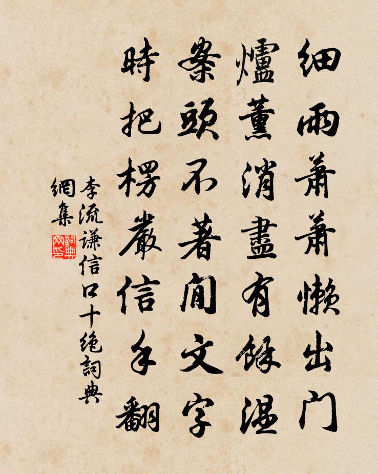 詩詞名句歷史字典書法欣賞書法字典國語詞典說文解字康熙字典古漢語字典標 題 作 者 詩 句 信口十絕作者:李流謙 朝代:宋代信口十絕原文細雨蕭蕭懶出門,爐薰消盡有餘溫。案頭不著閒文字,時把楞嚴信手翻。詩詞問答問:信口十絕的作者是誰?答:李流謙問:信口十絕寫於哪個朝代?答:宋代李流謙信口十絕書法欣賞信口十絕書法作品詩詞推薦採蓮令佚名〔宋代〕重陽淚眼,又早是、苦離腸。次韻實之春日二首劉克莊〔宋代〕向來文字擅中朝,留落而今賦大招。才子左遷追屈賈,相君高蹈友松喬。山行或與樵爭席,澗飲聊將掬代瓢。借使三和謝娛親堂扁王灼〔宋代〕榮華夢事付朱門,茗碗爐燻所性存。對月朗吟將進酒,逢春細和樂遊園。坐中投轄時留客,膝上含飴日弄孫。四美跋北齊校書圖韓元吉〔宋代〕高齊校讎誰作圖,一時紬書亦名儒。綱羅捲軸三千餘,欲儒非真類迂愚。雌黃是正定不撫,虛文末學徒區區。豈識惜奴嬌巫山神女〔宋代〕瑤闕瓊宮,高枕巫山十二。睹瞿塘、千載灩灩雲濤沸。異景無窮好,閒吟滿酌金卮。憶前時。楚襄王,曾來夢中相琴曲歌辭。思歸引張祜〔唐代〕重重作閨清旦鐍,兩耳深聲長不徹。深宮坐愁百年身,一片玉中生憤血。焦桐罷彈絲自絕,漠漠暗魂愁夜月。故鄉題高城雪堂祝勛〔宋代〕築室煙霞窟,門開紫翠堆。真成雲挽住,不為景催回。山月窺檐入,溪風掠坐來。爐薰兼茗飲,淨拂綠琴埃。早行澠池道中強至〔宋代〕二年別鹹秦,八月過崤澠。碎石隱地起,險塗抱山轉。我馬無完蹄,我仆有重趼。林紅烈炬暴,澗白亂流淺。夙駕山居雜詩九十首曹勛〔宋代〕寂歷秋風晚,閒庭落葉深。天高晴日澹,山淨暮煙沉。疾病無時已,年華有底侵。兩行南去雁,一片北歸心。與似表弟游石門懷蹈元時中用高字韻李彌遜〔宋代〕逼人塵事等牛毛,袖手端須著眼高。策蹇倦追千里馬,荷鋤安用百金刀。病來避酒連三月,春半尋山第一遭。不見鸜鵒俞灝〔宋代〕守黑元知分,能言亦任真。人知不可食,我得自全身。牛背煙村畫,烏群野水春。從教鸚鵡貴,籠終媚宮嬪。書事陸游〔宋代〕九天清蹕響春雷,百萬貔貅扈駕回。不獨雨師先灑道,汴流袬袬入淮來。壽春花楊巽齋〔宋代〕花間碧玉最敷腴,看挹南薰景又殊。天賦芳姿長不老,命名為壽定非誣。玉琯岩黃甲〔宋代〕橋山往日葬衣冠,玉琯深藏在此山。料得當時十二牧,也隨龍駕到其間。送衛清叔著作提舉淮東樓鑰〔宋代〕屢從樽酒接從容,叔寶風姿照座中。他日相逢年益老,棋壇尚可角雌雄。十二時(秋夜)柳永〔宋代〕晚晴初,淡煙籠月,風透蟾光如洗。覺翠帳、涼生秋思。漸入微寒天氣。敗葉敲窗,西風滿院,睡不成還起。更漏題三衢於艮室魏了翁〔宋代〕後前止字誤箋題,只認連山終物時。雨霽雲收青不改,悠然依舊看朝隮。答周循州蘇軾〔宋代〕蔬飯藜床破衲衣,掃除習氣不吟詩。前生似是盧行者,後學過呼韓退之。未敢叩門求夜話,時叨送米續晨炊。知君題贈高閒上人陳陶〔唐代〕檐卜花間客,軒轅席上珍。筆江秋菡萏,僧國瑞麒麟。內殿初招隱,曹溪得後塵。龍蛇驚粉署,花雨對金輪。白馬書詩卷末潘閬〔宋代〕一卷詩成二十年,晝曾忘食夜忘眠。莫言不及相如賦,誰敢高吟漢帝前。名句推薦行坐深閨里。懶更妝梳,自知新來憔悴。杜安世《鶴沖天·清明天氣》 儉節則昌,淫佚則亡。墨子《墨子·06章 辭過》 想當年,金戈鐵馬,氣吞萬里如虎。辛棄疾《永遇樂·京口北固亭懷古》 今春香肌瘦幾分?縷頻寬三寸。王實甫《十二月過堯民歌·別情》 花不語,水空流。年年拚得為花愁。晏幾道《鷓鴣天·守得蓮開結伴遊》 君子素其位而行,不願乎其外。子思《中庸·第十四章》 學而時習之,不亦說乎?佚名《論語十則》 幽徑無人獨自芳,此恨憑誰訴。曹組《卜運算元·蘭》 風定落花深,簾外擁紅堆雪。李清照《好事近·風定落花深》 價一不擇主馮夢龍《警世通言·卷二十二》