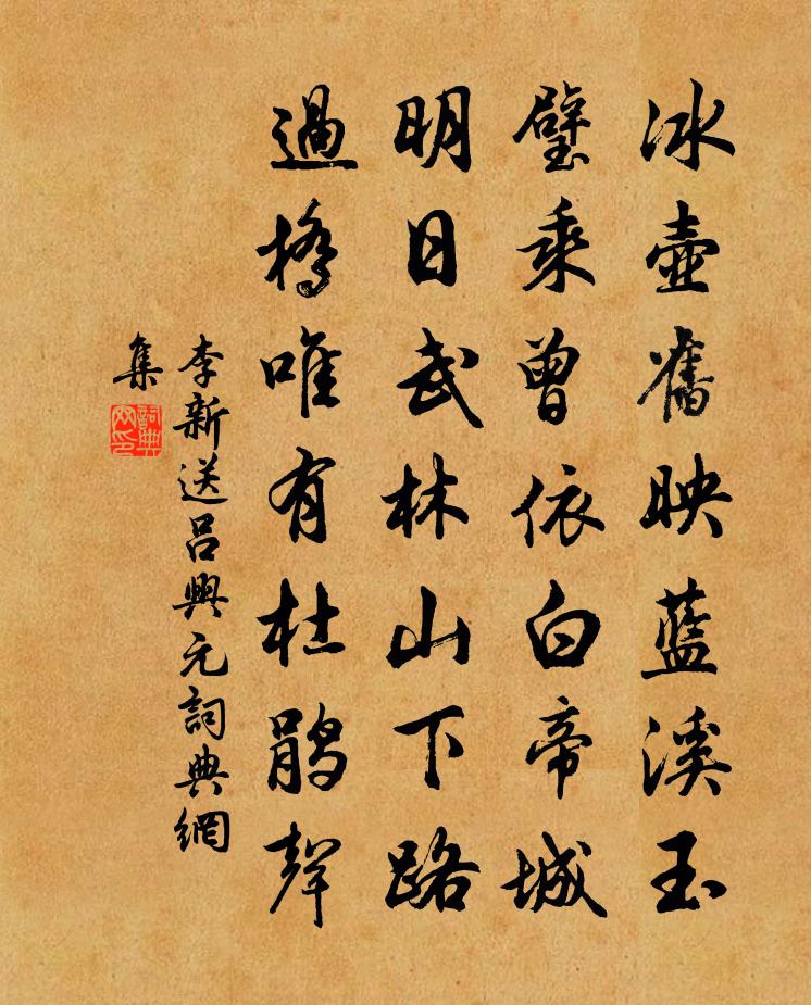 詩詞名句歷史字典書法欣賞書法字典國語詞典說文解字康熙字典古漢語字典標 題 作 者 詩 句 送呂興元作者:李新 朝代:宋代送呂興元原文冰壺舊映藍溪玉,璧乘曾依白帝城。明日武林山下路,過橋唯有杜鵑聲。詩詞問答問:送呂興元的作者是誰?答:李新問:送呂興元寫於哪個朝代?答:宋代李新送呂興元書法欣賞送呂興元書法作品詩詞推薦歲除誌喜仇遠〔宋代〕郊居守歲苦為情,一歲中間百事經。建業長男方入拜,桐江小女又歸寧。蒙頭被暖先高臥,婪尾杯空且獨醒。席上偈頌一百零二首釋慧遠〔宋代〕托跡但知忘世故,棲蘆何事不容閒。已能躡足龍門過,試把輪鉤揚碧灣。題朱虞卿自懶曾豐〔宋代〕天不與吾山水幽,卻於何處小藏修。清風吾有術堪召,俗物自無機可投。朝市眼為方冊制,利名心與曲國疇。令尹憶江南舊居雍陶〔唐代〕閒思往事在湖亭,亭上秋燈照月明。宿客盡眠眠不得,半窗殘月帶潮聲。鵲橋仙劉克莊〔宋代〕一封奏御,九重知己,不假吹噓送上。從今穩穩到蓬萊,三萬里、沒些風浪。臣年雖老,臣卿尚少,一片丹心葵向高宗明堂前朝獻景靈宮十首真宗〔宋代〕於赫大神,總司元化。監我純精,威光來下。延昌之貺,千億憑藉。曾孫保之,丕平是迓。二風詩亂風詩五篇至傷元結〔唐代〕夫可傷兮?傷王乎,欲何為乎?將蠹枯矣,無人救乎?蠹枯及矣,不可救乎?嗟傷王!自為人君,變為人奴!為人偈釋慧深〔宋代〕未得入頭應切切,入頭已得須教徹。雖然得入本無無,莫守無無無間歇。與昌國善友釋正覺〔宋代〕駕潮舟澀岸頭沙,得與岩僧款語些。夢付莊周窗外蝶,疑醒樂廣酒中蛇。夜堂莫怪雲慳月,春嶠將知雨促華。想像玉樓春錢惟演〔宋代〕錦籜參差朱欄曲。露濯文犀和粉綠。未容濃翠伴桃紅,幾許纖枝留鳳宿。嫩似春荑明似玉。一寸芳心誰管束。勸君菩薩蠻袁去華〔宋代〕流蘇寶帳沈煙馥。寒林小景銀屏曲。睡起鬢雲松。日高花影重。沈吟思昨夢。閒抱琵琶弄。破撥錯成聲。春愁著莫秋懷雍陶〔唐代〕古槐煙薄晚鴉愁,獨向黃昏立御溝。南國望中生遠思,一行新雁去汀洲。和桃花趙希逢〔宋代〕萬種莫動孟柯喜,簞食難生顏子愁。醴酒當年如□□,□□□□□□□。潁陽別元丹丘之淮陽李白〔唐代〕吾將元夫子,異姓為天倫。本無軒裳契,素以煙霞親。嘗恨迫世網,銘意俱未伸。松柏雖寒苦,羞逐桃李春。悠悠二月二十八日周提宮葉致政樓司理過訪錦園喻良能〔宋代〕錦園春色滿西東,一笑相歡四老翁。八秩總開三百歲,璽天風味此時同。罪所上御史惟則劉長卿〔唐代〕誤因微祿滯南昌,幽系圜扉晝夜長。黃鶴翅垂同燕雀,青松心在任風霜。斗間誰與看冤氣,盆下無由見太陽。賢達墨梅張嵲〔宋代〕山邊幽谷水邊村,曾被疏花斷客魂。猶恨東風無意思,更吹煙雨暗黃昏。觀化十五首黃庭堅〔宋代〕紅羅步障三十里,憶得南溪躑躅花。馬上春風吹夢去,依稀人摘雨前茶。曉起探梅四首楊萬里〔宋代〕一生劫劫只長塗,投老山林始定居。夢破燈青窗欲白,猶疑雪店聽雞初。郡中上元燈減舊例三之二而又迎送使客七首楊萬里〔宋代〕不是東風巧剪裁,如何春夜碧蓮開?江城寂寞無歌舞,喚得梅花勸一杯。名句推薦卷峭寒萬里,平沙飛雪。吳文英《暗香疏影·夾鍾宮賦墨梅》 深林人不知,明月來相照。王維《竹里館》 夜長爭得薄情知,春初早被相思染。姜夔《踏莎行·自沔東來》 文之英蕤,有秀有隱。隱也者,文外之重旨者也;秀也者,篇中之獨拔者也。劉勰《文心雕龍·隱秀》 採菊東籬下,悠然見南山。陶淵明《飲酒·其五》 世間最難得者兄弟。程登吉《幼學瓊林·卷二·兄弟》 天寒水鳥自相依,十百為群戲落暉。秦觀《還自廣陵》 治強生於法,弱亂生於阿。韓非及後人《韓非子·外儲說右下》 歲暮百草零,疾風高岡裂。杜甫《自京赴奉先縣詠懷五百字 / 自京赴奉先詠懷五百字》 解鞍欹枕綠楊橋,杜宇一聲春曉。蘇軾《西江月·頃在黃州》