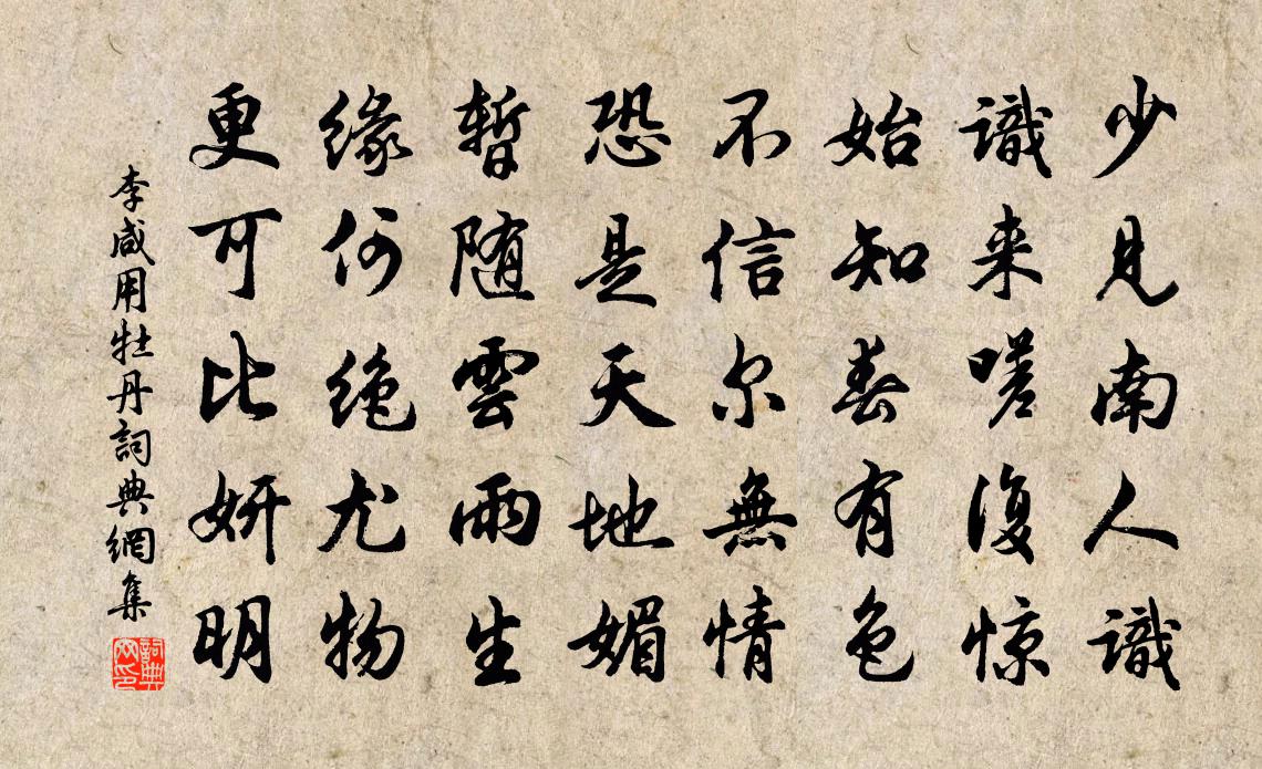 詩詞名句歷史字典書法欣賞書法字典國語詞典說文解字康熙字典古漢語字典標 題 作 者 詩 句 牡丹作者:李鹹用 朝代:唐代牡丹原文少見南人識,識來嗟復驚。始知春有色,不信爾無情。恐是天地媚,暫隨雲雨生。緣何絕尤物,更可比妍明。詩詞問答問:牡丹的作者是誰?答:李鹹用問:牡丹寫於哪個朝代?答:唐代問:牡丹是什麼體裁?答:五律李鹹用牡丹書法欣賞牡丹書法作品注釋全唐詩:卷645-47詩詞推薦蕊歌程公許〔宋代〕五雲鬱勃天九重,俯視人境塵濛濛。元和遷校品秩穹,以帝命鎮北坎宮。玄袍金鎧丁甲從,洞陰戰勝魔絕縱。際江偈頌二十五首釋如淨〔宋代〕瞿曇臘月八,夜半走出山。賊路羊腸曲,偷心虎背斑。寄晁以道陳師道〔宋代〕兩官俱為鄰,常若千里遠。經年不通書,子孰知我懶。相期宇宙外,肯復校繁簡。我愚亦知此,子意豈不滿。子教早春周弼〔宋代〕連朝微雪暗消凝,始覺春風逐旋增。今早畫檐偏有意,數條吹折曬殘冰。酴醾依柏引蔓上冒其顛崔鶠〔宋代〕春風亦已老,自厭丹采媚。獨留白雪藥,灑此千尺翠。嵯峨珠籠冠,縹緲冒佛髻。幽香勿襲人,恐為真色累。但原憶雍都一首蘇籀〔宋代〕秦漢西都誰復加,茂陵賦筆大非夸。西瞻周道平如砥,南揖秦山翠削瓜。雷尾鳳鬃蹄逸健,蝟髯黧面手高叉。兵微上元二首王洋〔宋代〕誰將膏粥飯蠶師,輕薄兒童覓彩衣。游騎但知夸艷麗,祠門直莫歡寒微。東城南陌春迷眼,逐馬隨車醉未歸。莫怪別老母黃景仁〔清代〕搴帷拜母河梁去,白髮愁看淚眼枯。慘慘柴門風雪夜,此時有子不如無。雞鳴曲李廓〔唐代〕星稀月沒入五更,膠膠角角雞初鳴。征人牽馬出門立,辭妾欲向安西行。再鳴引頸檐頭下,樓中角聲催上馬。才分幽居陸游〔宋代〕殊方飄泊向誰論,小住僧廬亦所欣。得飽罷揮求米帖,愛眠新著毀茶文。摘蔬籃小沾清露,斸藥鉏輕帶濕雲。從此次韻四絕末莉花樓鑰〔宋代〕江南創見喜孤芳,見說閩花遍海鄉。安得一居香盛處,帳中巧作寶毬妝。和晏尚書對雪招飲歐陽修〔宋代〕瑤林瓊樹影交加,誰伴山翁醉帽斜。自把金船浮白蟻,應須紅粉唱梅花。舟中枕上顧逢〔宋代〕官塘來往纖紛紛,月入疏篷漏碎紋。數盡寒更天未曉,兩三聲雁枕邊聞。溝泥二首張耒〔宋代〕不嫌泥潦巷,自掃寂寥居。雨已標新杏,春猶遺老樗。風光習暖事,雲物或寒除。頗復撩詩句,時時漫與書。迓黃守再來二首胡寅〔宋代〕舊治重臨寵渥新,聖朝因任慰斯民。芾棠不拜陰如幄,騎竹爭迎氣似春。金重百斤兼賜爵,車高一丈更施茵。能名牽牛花三首楊萬里〔宋代〕素羅笠頂碧羅檐,晚卸藍裳著茜衫。望見竹籬心獨喜,翩然飛上翠瓊篸。寄徐秀才斯遠並呈莊賢良器之陸游〔宋代〕徐子作別十年余,無人可寄一紙書;閒門美睡畏剝啄,自怪一念常關渠。西風蕭蕭吹槁葉,秋光正滿蝸牛廬,讀書次韻履常見貽晁補之〔宋代〕人皆愛陳子,新雨尚能來。但使門多客,何嫌室自埃。弓旌無遠野,城郭有遺才。底日常侯舍,傳聲四輩催。大愚梅堯臣〔宋代〕大愚不量能,品藻輒己出。朝以軻為同,暮以丘為匹。其人豈鷹雀,鳩鴿化五日。指鹿危二世,師歆造新室。雖雲早發杜甫〔唐代〕有求常百慮,斯文亦吾病。以茲朋故多,窮老驅馳並。早行篙師怠,席掛風不正。昔人戒垂堂,今則奚奔命。濤翻名句推薦但責己,不責人,此遠怨之道也;但信己,不信人,此取敗之由也。王永彬《圍爐夜話·第八五則》 待到重陽日,還來就菊花。孟浩然《過故人莊》 知之曰明哲,明哲實作則。佚名《尚書·商書·說命上》 德者才之主,才者德之奴。洪應明《菜根譚·概論》 騷人可煞無情思,何事當年不見收。李清照《鷓鴣天·桂花》 酒美梅酸,恰稱人懷抱。李清照《蝶戀花·上巳召親族》 君子不以言舉人,不以人廢言。孔子弟子《論語·衛靈公篇》 以力服人者,非心服也,力不贍也;以德服人者,中心悅而誠服也。孟子《孟子·公孫丑章句上·第三節》 春思亂,芳心碎。惠洪《千秋歲·半身屏外》 疏條交映,有時見日。吳均《與朱元思書》