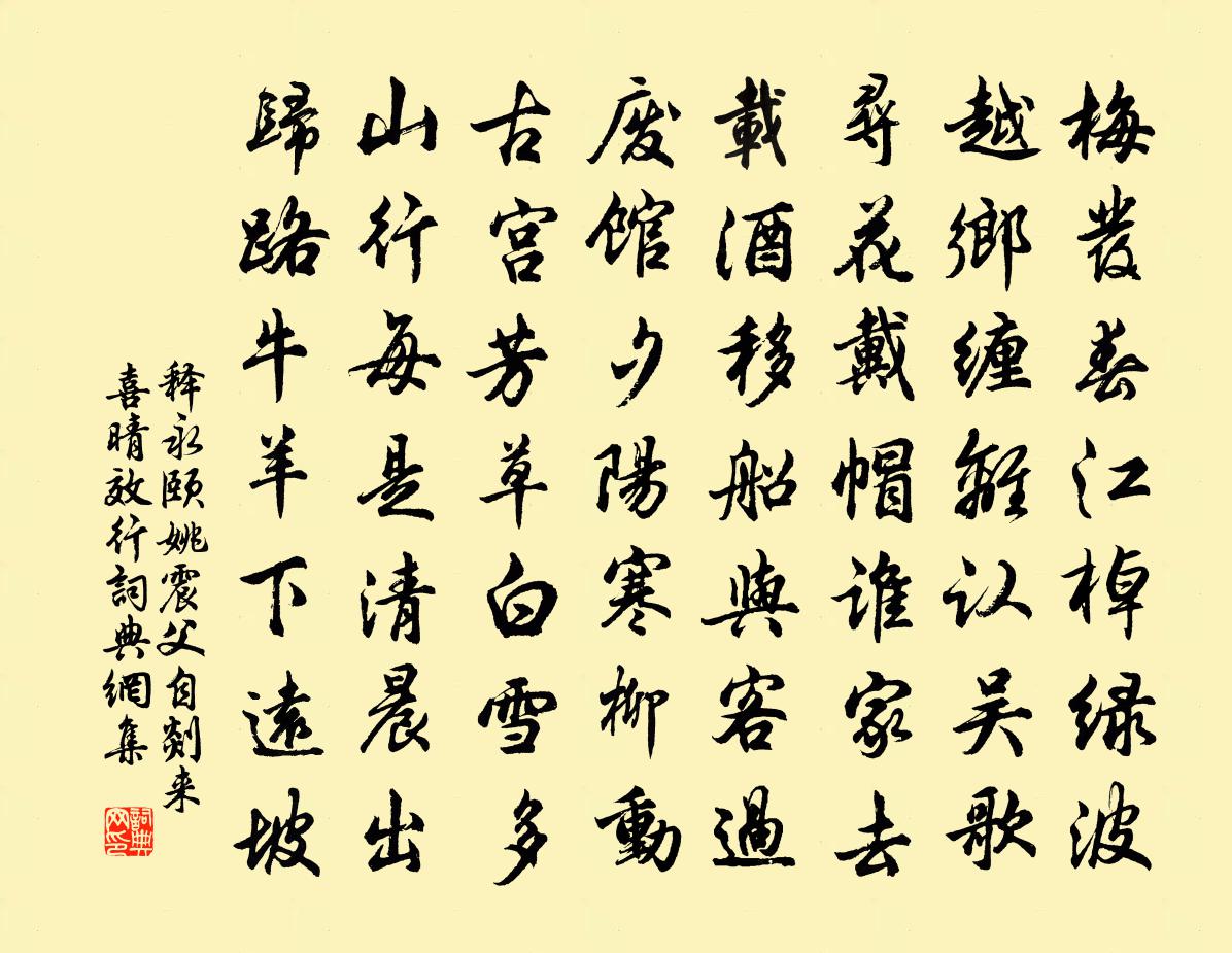 詩詞名句歷史字典書法欣賞書法字典國語詞典說文解字康熙字典古漢語字典標 題 作 者 詩 句 姚震父自剡來喜晴效行作者:釋永頤 朝代:宋代姚震父自剡來喜晴效行原文梅發春江棹綠波,越鄉纏離認吳歌。尋花戴帽誰家去,載酒移船與客過。廢館夕陽寒柳動,古宮芳草白雪多。山行每是清晨出,歸路牛羊下遠坡。詩詞問答問:姚震父自剡來喜晴效行的作者是誰?答:釋永頤問:姚震父自剡來喜晴效行寫於哪個朝代?答:宋代釋永頤姚震父自剡來喜晴效行書法欣賞姚震父自剡來喜晴效行書法作品詩詞推薦和朱公掞禱雨五龍廟李復〔宋代〕太師占歲驗律管,氣來姑洗聲猶短。野欠告病三月余,公堂嚴齋五日滿。相招禱雨陟南山,出城鞭馬追飛繖。林鳩和仁仲春日十絕胡寅〔宋代〕氣浹高深物物蘇,問言還有欠春無。桃紅李白猶閒事,麟鳳慶來瑞此都。次妹第一百五十五文天祥〔宋代〕天際傷愁別,江山憔悴人。團圓思弟妹,傳語故鄉春。松陵答友人釋永頤〔宋代〕郁羅天上挹躔,拾羽編衣泛碧蓮。長笛吹明月夜,秋風濯足太湖邊。中春望後一日登鈴瓏洪咨夔〔宋代〕出郭暄欲暑,涉林清自秋。步隨目力高,身與山氣浮。飛來辛夷花,拾得蓮葉舟。一聲提壺廬。四顧叢薄幽。詰屈坐冰床至悅心殿乾隆〔清代〕筠沖錫宴有餘閒,瓊島韶光暖鏡間。尚可翠鸞輕舵試,徐過玉蝀一橋彎。凍酥岸覺看波漾,春到物知聽雁還。今日臨江仙邢俊臣〔宋代〕只愁歌舞罷,化作彩雲飛。徵招(雪)趙以夫〔宋代〕玉壺凍裂琅玕折,駸駸逼人衣袂。暖絮張空飛,失前山橫翠。欲低還又起。似妝點、滿園春意。記憶當時,剡中情晚步裘萬頃〔宋代〕日落欲閉戶,風清聊杖藜。千山猶帶雨,一徑已無泥。虢虢水聲急,悠悠雲影低。催歸緣底事,著意旁人啼。贈法傳李洪〔宋代〕栴檀林下老支郎,偶泛溪邊般若航。齋缽分摶香積飯,午窗對臥淨名床。雲山宴坐千春木,塵境難留三宿桑。欲結和知己秋日傷懷鄭谷〔唐代〕流水歌聲共不回,去年天氣舊亭台。梁塵寂寞燕歸去,黃蜀葵花一朵開。酬浙東李侍郎越州春晚即事長句劉禹錫〔唐代〕越中藹藹繁華地,秦望峰前禹穴西。湖草初生邊雁去,山花半謝杜鵑啼。青油晝卷臨高閣,紅旆晴翻繞古堤。明日南流夜郎寄內李白〔唐代〕夜郎天外怨離居,明月樓中音信疏。北雁春歸看欲盡,南來不得豫章書。聞軍過方回〔宋代〕老膽堪多恐,焦脾更積憂。軍聲時洶洶,債事日悠悠。西路危單騎,東灘乏便舟。情懷無一可,風雨五更頭。送無為宰趙渙冰仲王之道〔宋代〕百里寄一令,於民為最親。休戚咳唾間,詎可非其人。趙侯古循吏,當世無等倫。朅來宰濡須,舊政俱更新。雖無夏日留題張山人林亭杜荀鶴〔唐代〕此中偏稱夏中游,時有風來暑氣收。澗底松搖千尺雨,庭中竹撼一窗秋。求猿句寄山深寺,乞鶴書傳海畔洲。閒與七月初五日城中大風雨鄭清之〔宋代〕颶風超海撼官城,吹斷銀河徹曉傾。瓦陣飛翻千鵠起,屐聲旁午萬蛙鳴。駢肩重足人如醉,涌溜奔雲氣未平。誰與秋思黃庭堅〔宋代〕柴門扃兮,牛羊下來其已久。四壁立兮,蛩螿太息不可聽。夜冉冉兮斗魁委柄若授人,天寥寥兮河漢風浪西南傾。與兒輩小集陸游〔宋代〕老子秋來樂事稠,吳粳新搗酒新篘。矮黃不待園官送,小白每煩溪女留。頓飽可憐頻夢與,半酣自喜有兒酬。不如過三衢呈劉共父胡銓〔宋代〕別離如許每引領,邂逅幾何還著鞭。微服過宋我何敢,大國賜秦公不然。衰鬢雕零已子後,高名崒嵂方丁年。即看名句推薦上有愁思婦,悲嘆有餘哀。曹植《明月上高樓》 貧賤非辱,貧賤而諂求於人者為辱;富貴非榮,富貴而利濟於世者為榮。王永彬《圍爐夜話·第三一則》 中歲頗好道,晚家南山陲王維《終南別業》 泉聲咽危石,日色冷青松。王維《過香積寺》 已訴徵求貧到骨,正思戎馬淚盈巾。杜甫《又呈吳郎》 非其地而樹之,不生也。劉向《說苑·雜言》 斜風細雨不須歸。蘇軾《浣溪沙·漁父》 樂遊原上清秋節,鹹陽古道音塵絕。李白《憶秦娥·簫聲咽》 一為遷客去長沙,西望長安不見家。李白《與史郎中欽聽黃鶴樓上吹笛 / 題北榭碑》 不論平地與山尖,無限風光盡被占羅隱《蜂》