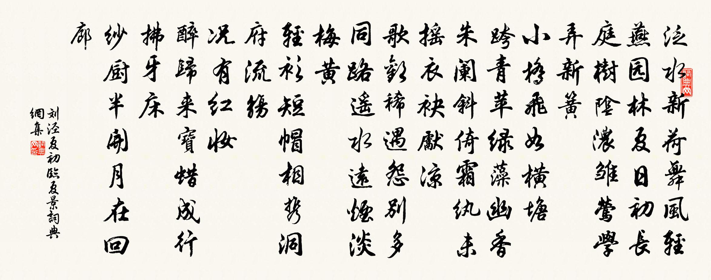 詩詞名句歷史字典書法欣賞書法字典國語詞典說文解字康熙字典古漢語字典標 題 作 者 詩 句 夏初臨(夏景)作者:劉涇 朝代:宋代夏初臨(夏景)原文泛水新荷,舞風輕燕,園林夏日初長。庭樹陰濃,雛鶯學弄新簧。小橋飛如橫塘。跨青苹、綠藻幽香。朱闌斜倚,霜紈未搖,衣袂先涼。歌歡稀遇,怨別多同,路遙水遠,煙淡梅黃。輕衫短帽,相攜洞府流觴。況有紅妝。醉歸來、寶蠟成行。拂牙床。紗廚半開,月在迴廊。詩詞問答問:夏初臨(夏景)的作者是誰?答:劉涇問:夏初臨(夏景)寫於哪個朝代?答:宋代問:夏初臨(夏景)是什麼體裁?答:詞劉涇夏初臨(夏景)書法欣賞夏初臨(夏景)書法作品詩詞推薦滿江紅(孟史君禱而得雨)臞翁〔宋代〕禱雨文昌,只全靠、心香一瓣。才信宿,沛然膏澤,來從方寸。早稻含風香旖旎,晚秧飽水青蔥茜。問螺江、恰見再韻答子文范成大〔宋代〕浮生飽外莫求余,羈旅東來計已疏。肩聳已高猶索句,眼明無用且翻書。百年子莫占元緒,萬法吾今付子盧。惟有頌古四十五首釋慧遠〔宋代〕饒君舌拄梵天,我也令行一半。趙州頭戴草鞵,也是新繁轢鑽。題蟄庵王柏〔宋代〕一蟄了千悞,心安境自寬。軒昂就收斂,自在覓艱難。龍怕烏台勘,人疑蕙帳寒。欲知舒捲意,編簡靜中看。題越王台崔子向〔唐代〕越井崗頭松柏老,越王台上生秋草。古木多年無子孫,牛羊踐踏成官道。漁家傲(次丹陽憶故人)毛並〔宋代〕楊子津頭風色暮。孤舟渺渺江南去。憶得佳人臨別處。愁返顧。青山幾點斜陽樹。可忍歸期無定據。天涯已聽邊鴻松齋偶興白居易〔唐代〕置心思慮外,滅跡是非間。約俸為生計,隨官換往還。耳煩聞曉角,眼醒見秋山。賴此松檐下,朝回半日閒。題太白祠堂喻良能〔宋代〕倒披綺裘草裹巾,酒醒玉山來映人。明月滄江故無恙,騎鯨何處狎龍鱗。霜天曉月(梅)蕭泰來〔宋代〕千霜萬雪。受盡寒磨折。賴是生來瘦硬,渾不怕、角吹徹。清絕。影也別。知心惟有月。原沒春風情性,如何共、簇蠶辭王建〔唐代〕蠶欲老,箔頭作繭絲皓皓。場寬地高風日多,不向中庭燃蒿草。神蠶急作莫悠揚,年來為爾祭神桑。但得青天不下南齋賈島〔唐代〕獨自南齋臥,神閒景亦空。有山來枕上,無事到心中。簾卷侵床月,屏遮入座風。望春春未至,應在海門東。玲瓏四犯(大石)周邦彥〔宋代〕穠李夭桃,是舊日潘郎,親試春艷。自別河陽,長負露房煙臉。憔悴鬢點吳霜,念想夢魂飛亂。嘆畫闌玉砌都換。冬夜讀書示子聿陸游〔宋代〕讀書萬卷不謀食,脫粟在傍書在前。要識從來會心處,曲肱飲水亦欣然。西山蘭若試茶歌劉禹錫〔唐代〕山僧後檐茶數叢,春來映竹抽新茸。宛然為客振衣起,自傍芳叢摘鷹觜。斯須炒成滿室香,便酌砌下金沙水。驟雨頌魯蘇拯〔唐代〕天推魯仲尼,週遊布典墳。游遍七十國,不令遇一君。一國如一遇,腳踏車不轉輪。良由至化力,為國不為身。禮樂透碧岩陳岩〔宋代〕空洞玲瓏萬石攢,中間逗入翠光寒。人來坐對山無語,表里虛明不礙觀。杭州雜詩和林石田汪元量〔宋代〕天也今如此,人乎可奈何。台邊西子去,宮裡北人過。玉樹歌方息,金銅淚已多。旌旗遮御路,舟楫滿官河。赴信幕寄子云叔?及同寺韓元吉〔宋代〕田園未辦各身謀,兄弟今成迭雲留。遊宦三年方啟足,寄書千字又從頭。白雲不定山容晚,碧水無窮樹色秋。回首寄俞玉汝趙蕃〔宋代〕晦庵寄我溧陽書,報導今為建業居。作客遽經三歲久,賦詩應盡六朝余。莫將明月夸魚目,自昔鹽車羨蹇驢。期子衛州東湖項安世〔宋代〕自笑知州百不知,近他池館未曾窺。主人正可今為客,和議初成恰是時。草色茸茸花覆座,波光灩艷酒浮卮。留連名句推薦酒已都醒,如何消夜永!周邦彥《關河令·秋陰時晴漸向暝》 想雁空、北落冬深,澹墨晚天雲闊。吳文英《暗香疏影·夾鍾宮賦墨梅》 輕汗微微透碧紈,明朝端午浴芳蘭。蘇軾《浣溪沙·端午》 意得則舒懷以命筆,理伏則投筆以卷懷劉勰《文心雕龍·養氣》 孤燈寒照雨,濕竹暗浮煙。司空曙《雲陽館與韓紳宿別》 七夕年年信不違,銀河清淺白雲微,蟾光鵲影伯勞飛。毛文錫《浣溪沙·七夕年年信不違》 白骨如山忘姓氏,無非公子與紅妝。曹雪芹《紅樓夢·第八回》 綠萼添妝融寶炬,縞仙扶醉跨殘虹曹雪芹《詠紅梅花得“紅”字》 孤村落日殘霞,輕煙老樹寒鴉,一點飛鴻影下。白樸《天淨沙·秋》 見善,修然必以自存也;見不善,愀然必以自省也。善在身,介然必以自好也;不善在身,菑然必以自惡也。荀子《荀子·修身》