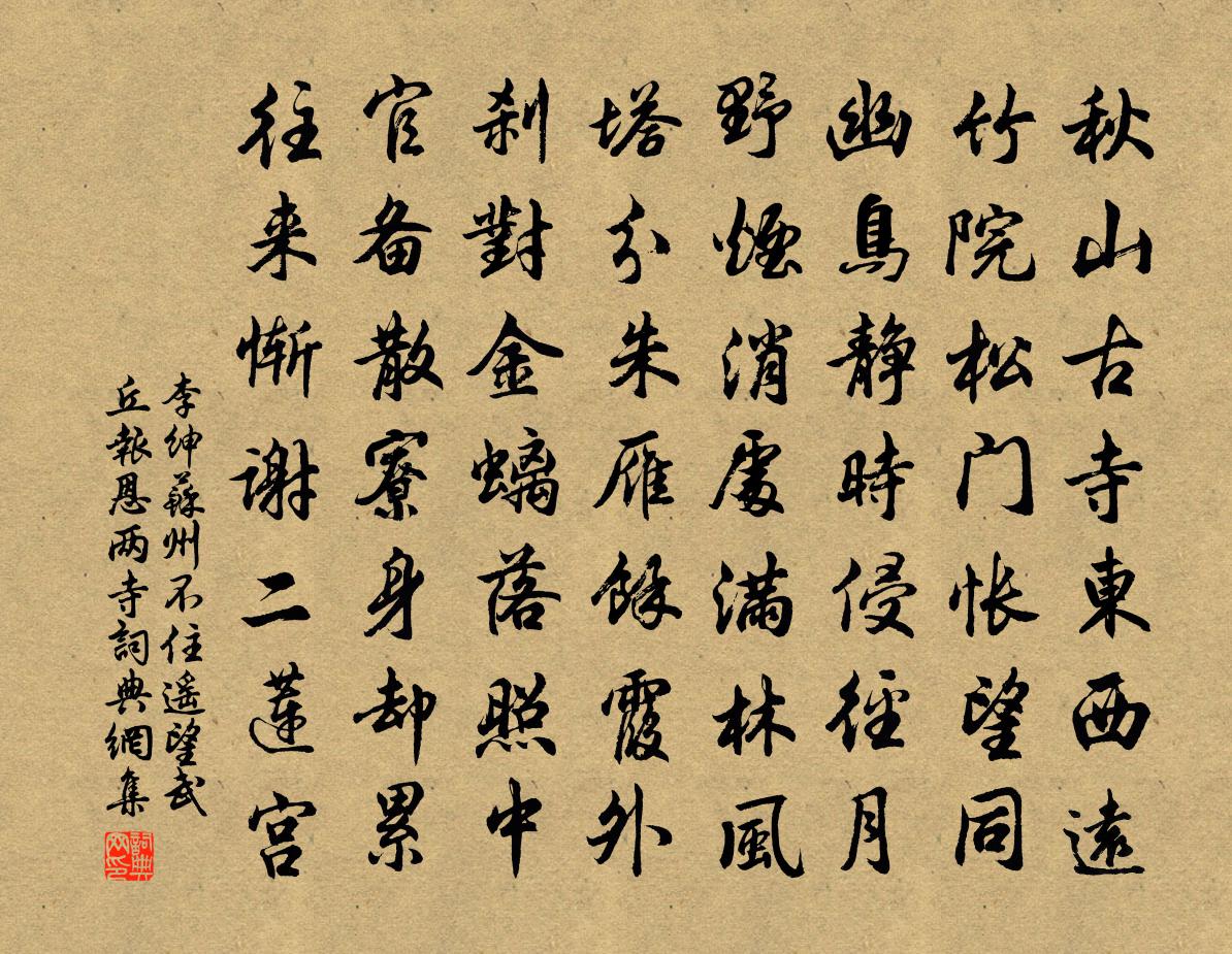 詩詞名句歷史字典書法欣賞書法字典國語詞典說文解字康熙字典古漢語字典標 題 作 者 詩 句 蘇州不住遙望武丘報恩兩寺作者:李紳 朝代:唐代蘇州不住遙望武丘報恩兩寺原文秋山古寺東西遠,竹院松門悵望同。幽鳥靜時侵徑月,野煙消處滿林風。塔分朱雁餘霞外,剎對金螭落照中。官備散寮身卻累,往來慚謝二蓮宮。詩詞問答問:蘇州不住遙望武丘報恩兩寺的作者是誰?答:李紳問:蘇州不住遙望武丘報恩兩寺寫於哪個朝代?答:唐代問:蘇州不住遙望武丘報恩兩寺是什麼體裁?答:七律李紳蘇州不住遙望武丘報恩兩寺書法欣賞蘇州不住遙望武丘報恩兩寺書法作品注釋全唐詩:卷482-4詩詞推薦命妓不至劉兼〔唐代〕琴中難挑孰憐才,獨對良宵酒數杯。蘇子黑貂將已盡,宋弘青鳥又空回。月穿淨牖霜成隙,風卷殘花錦作堆。攲枕次韻吉老十小詩黃庭堅〔宋代〕寒水幾痕落,秋山萬竅號。紅梨啄烏鵲,殘菊掛蠨蛸。野田張籍〔唐代〕漠漠野田草,草中牛羊道。古墓無子孫,白楊不得老。次韻金壁夫見寄徐瑞〔宋代〕萬緣戡破等飛煙,習氣消除得聖顛。撲滿無情又佚老,鴟夷有味可留年。美人渺渺空動夢,吾道悠悠莫間天。上界錢舜舉瓜畫方回〔宋代〕老錢工作趙昌花,殘綠依稀姤五瓜。正叔晦翁凡六說,始知輔嗣大爭差。拒霜花楊萬里〔宋代〕木蕖何似水芙蕖?同個聲名各自都。風露商量借膏沐,燕脂深淺入肌膚。喚回春色秋光里,饒得紅妝翠蓋無。字曰苞苴行鄭俠〔宋代〕苞苴來,苞苴去,封書裹信不得住。君不見箕山之下有仁人,室無杯器,以手的捧水,不願風瓢掛高樹。東城送客馬上賀鑄〔宋代〕向午孤煙起客檣,一陂春水兩鴛鴦。漁童解唱滄浪曲,應笑塵埃馬上郎。即事樓鑰〔宋代〕行盡窮邊歲亦殫,倚門應是念衣單。寧知今日幕南地,不似去年江上寒。乘馬惟欣日可愛,逢人長說雪初乾。三衾贈月溪羽士戴叔倫〔唐代〕月明溪水上,誰識步虛聲。夜靜金波冷,風微玉練平。自知塵夢遠,一洗道心清。更弄瑤笙罷,秋空鶴又鳴。實弟以詩來督作會文又因太原侄寄聲欲作不速胡宏〔宋代〕歲月嘆逾邁,入門事業難。戰兢曾子意,豈可遂闌珊。踏莎行譚處端〔元代〕才見春花,又逢秋月。春花秋月何時徹。勸君速悟勿蹉跎,壺中別有佳時節。斷愛超塵,當須猛烈。元陽固練搜玄秋霖即事聯句三十韻白居易〔唐代〕蕭索窮秋月,蒼茫苦雨天。泄雲生棟上,行潦入庭前。 ——白居易苔色侵三徑,波聲想五弦。井蛙爭入戶,轍鮒次韻介甫集禧池上詠鵝王令〔宋代〕池上溶溶浮暖日,野鵝無數自相於。謀生跡與風波密,擇地心將網弋疏。毛羽鮮明疑振鷺,聲鳴和好似關雎。應憐晚泊舒城下黎廷瑞〔宋代〕卸帆淮南岸,城樓欲鼓天。遠山雲似雪,近水屋如船。樹意紅未了,波光綠可憐。乾坤無限事,一笑白鷗前。句王廷圭〔唐代〕十字水中分島嶼,數重花外見樓台。登臥龍山寫懷二十八韻劉基〔明代〕白雲在青天,可望不可即。浩歌梁甫吟,憂來憑胸臆。臨江仙 壽程雪樓張伯淳〔元代〕白雪樓前清畫,新來喜事連綿。朱明綠暗麥秋天。繡衣何日去,丹荔已香傳。前夜團圓明月好,清光流照華筵。錦懷保步寺鏞公張即之〔宋代〕華嚴閣上夜談經,虎嘯風生月正橫。茶筍家常原有分,簪纓世路本無情。住間石屋容膝下,遇個詩翁便記名。古斷腸曲三十首周端臣〔宋代〕催花一霎雨依微,芳逕泥香草色萋。可是一春天氣冷,牡丹開了未鶯啼。名句推薦惟有綠荷紅菡萏,卷舒開合任天真。李商隱《贈荷花》 我欲乘槎,直窮銀漢,問津深入。許有壬《水龍吟·過黃河》 還作一段相思,冷波葉舞愁紅,送人雙槳。吳文英《解蹀躞·醉雲又兼醒雨》 勝地不常,盛筵難再;蘭亭已矣,梓澤丘墟。王勃《滕王閣序》 綠萼添妝融寶炬,縞仙扶醉跨殘虹曹雪芹《詠紅梅花得“紅”字》 都緣自有離恨,故畫作遠山長。歐陽修《訴衷情·眉意》 鞭撲之子,不從父之教劉向《說苑·雜言》 闌乾風冷雪漫漫,惆悵無人把釣竿。姜夔《釣雪亭》 千尋鐵鎖沉江底,一片降幡出石頭。劉禹錫《西塞山懷古》 明年豈無年,心事恐蹉跎。蘇軾《守歲》