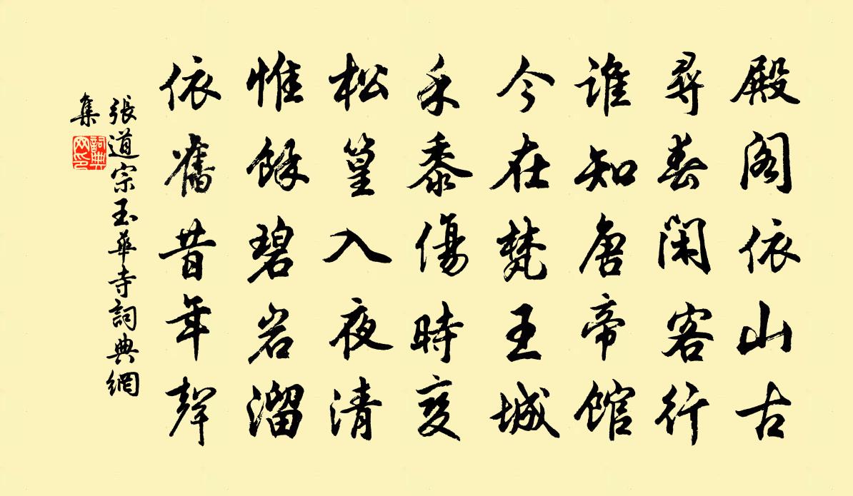 詩詞名句歷史字典書法欣賞書法字典國語詞典說文解字康熙字典古漢語字典標 題 作 者 詩 句 玉華寺作者:張道宗 朝代:宋代玉華寺原文殿閣依山古,尋春閒客行。誰知唐帝館,今在梵王城。禾黍傷時變,松篁入夜清。惟余碧岩溜,依舊昔年聲。詩詞問答問:玉華寺的作者是誰?答:張道宗問:玉華寺寫於哪個朝代?答:宋代張道宗玉華寺書法欣賞玉華寺書法作品詩詞推薦因假歸白閣西草堂岑參〔唐代〕雷聲傍太白,雨在 * 峰。東望白閣雲,半入紫閣松。勝概紛滿目,衡門趣彌濃。幸有數畝田,得延二仲蹤。早聞江南弄周巽〔元代〕秋聲起。庭院收殘暑。涼蟬抱葉鳴疏雨。玉簫吹徹人倚樓。銀漢迢迢度女牛。梧桐落翠露華冷,絡緯啼寒月影流。謝鬍子遠郎中惠蒲太韶墨,報以龍涎心字香楊萬里〔宋代〕墨家者流老蒲仙,碧梧採花和麝煙。華陽黑水煎膠漆,太陰玄霜作肌骨。龍尾磨肌飲鼠須,落點髹兒兒不如。夷甫邵陽郡圃梅坡史彌寧〔宋代〕粲玉梢頭出小亭,忍寒索笑太清生。楚山活脫青屏樣,影得疏花分外明。周錫自蜀歸浙袁說友〔宋代〕東甌西浙兩夤緣,齊止金陵萬里船。風月醉中同客夢,簿書叢里讀詩篇。懷歸念我方投劾,勇去輸君已著鞭。歲晚次韻何茂恭詠玉簪三絕喻良能〔宋代〕月露洗沐秋容淨,姑山初逢冰雪仙。風流水部與藻飾,從此梅花應並傳。曉坐臥治齋楊萬里〔宋代〕夜風甚細不勝酸,霜落無聲只是寒。日上東窗無個事,送將梅影索人看。萬安道中書事德三首楊萬里〔宋代〕攜家滿路蹈春華,兒女欣欣不憶家。騎吏也忘行役苦,一人人插一枝花。題聽蛙方君詩卷二首劉克莊〔宋代〕前輩凋零雅道衰,陳岩一叟尚龐眉。昂藏且伴戴花老,么麽安知撼樹兒。警句可編半山集,高風宜配客星祠。有詩壽陳制垣李曾伯〔宋代〕東皇妝就牡丹天,來獻蓬萊不老仙。耆舊喜增羊祜傳,蠻夷欣問晉公年。休懷苕水清風適,且醉檀溪綠草邊。原向木蘭花慢(壽)黃機〔宋代〕政胡塵滿野,問誰與、作堅城。有老子行年,平頭六十,無限聲名。向來試陳大略,便群兒、啁哳耳邊鳴。爭識規秀亭秋懷十五首方回〔宋代〕一針落大海,萬古無還期。纖纖刺繡女,斷腸終爾思。物重干將去,心愿精衛為。鄰嫗適有此,殷勤來獻之。銛鋒頌古八首釋元聰〔宋代〕明明道不說,此理憑誰識。春風一陣來,滿徑花狼藉。扇子詩李石〔宋代〕露冷蕊珠佩,五湖雲水深。一枝春好在,先寄月邊心。三山次鄭德予韻朱槔〔宋代〕何日歸舟片葉輕,白鷗相伴艫微鳴。只應潮打蓬窗處,已作離騷一半清。溪上葛紹體〔宋代〕少立沙頭夕照月,柳風吹面酒初醒。東臯好雨一犁足,麥半黃時秧半青。秋日村舍陸游〔宋代〕川雲慘慘欲成雨,宿麥蒼蒼初覆土。芋肥一本可專車,蟹壯兩螫能敵虎。村村婚嫁花簇檐,廟廟禱祠神降語。兒孫舟中遇陸棣兄西歸數日得廣陵二三子書知遲晚…墊西岸作蕭穎士〔唐代〕林烏遙岸鳴,早知東方曙。波上風雨歇,舟人叫將去。蒼蒼前洲日,的的回沙鷺。水氣清曉陰,灘聲隱川霧。舊山雨中惜海棠花四首廖行之〔宋代〕東君何事妒花妍,不遣春風一笑嫣。邀動芳心愁萬縷,盈盈含恨雨中天。紀秦漢間事二首羅公升〔宋代〕秦焰亦已灰,函關碎周文。玄感老東都,不救身首分。慎勿輕瘠牛,猶足僨孤豚。高文信神武,□往乘□昏。落果名句推薦卻愁宴罷青娥散,揚子江頭月半斜。韋莊《陪金陵府相中堂夜宴》 親朋無一字,老病有孤舟。杜甫《登岳陽樓》 烏鵲倦棲,魚龍驚起,星斗掛垂楊。陳亮《一叢花·溪堂玩月作》 將入門,問孰存。將上堂,聲必揚。李毓秀《弟子規·謹》 半天涼月色,一笛酒人心。袁枚《夜過借園見主人坐月下吹笛》 昔去雪如花,今來花似雪。范雲《別詩》 梁園日暮亂飛鴉,極目蕭條三兩家。岑參《山房春事二首》 心似已灰之木,身如不系之舟。蘇軾《自題金山畫像》 把酒祝東風,且莫恁、匆匆去。王安石《傷春怨·雨打江南樹》 人去鞦韆閒掛月,馬停楊柳倦嘶風。吳文英《望江南·三月暮》