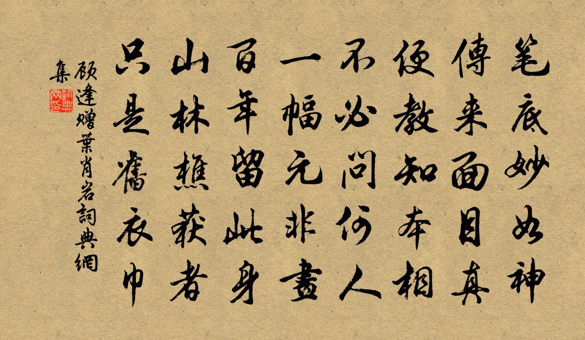 詩詞名句歷史字典書法欣賞書法字典國語詞典說文解字康熙字典古漢語字典標 題 作 者 詩 句 贈葉肖岩作者:顧逢 朝代:宋代贈葉肖岩原文筆底妙如神,傳來面目真。便教知本相,不必問何人。一幅元非畫,百年留此身。山林樵獲者,只是舊衣巾。詩詞問答問:贈葉肖岩的作者是誰?答:顧逢問:贈葉肖岩寫於哪個朝代?答:宋代顧逢贈葉肖岩書法欣賞贈葉肖岩書法作品詩詞推薦有感鄭清之〔宋代〕子思問學惟誠意,孟民工夫只把身。定慧妙明何處覓,要知儒釋共天真。送葛謙問蔡戡〔宋代〕從來鐘鼎不關心,此去溪山更可人。儻有新詩摹勝槩,好憑尺素寄雙鱗。次韻任伯仲均父詩和唐英之什傅察〔宋代〕數子聲華久絕塵,更將詩律斬清新。爛如曉日鋪紅錦,穆若薰風 * 苹。王謝由來多大手,何劉那得比斯人。從今秋夜董嗣杲〔宋代〕秋堂初霽短檠涼,堂外風簾減舊香。螢火正流孤漵焰,閒來坐覺二更長。夢覺梅堯臣〔宋代〕夕夢多夢之,覺來遂成憶。憶子生平時,事往無一得。信若此夢寐,豈不見顏色。復存來告言,言虛音匪默。是覺和帚齋見寄劉黻〔宋代〕棲棲慣聽鼓魚聲,心印相傳第幾燈。江有白鷗閒似我,地惟蒼蘚懶於僧。吟難用世皆東野,窮亦憂時祗少陵。多謝檢校金蓋別業周弼〔宋代〕獨棹一溪雲,山回景自分。露花藏岸勢,風葉亂泉紋。短箭催年急,微陽近草曛。斷猿將落木,清夜不堪聞。徵招(答仇山村見寄)張炎〔宋代〕可憐張緒門前柳,相看頓非年少。三徑已荒涼,更如今懷抱。薄游渾是感,滿煙水、東風殘照。古調誰彈,古音誰送趙一嚴守永嘉釋文珦〔宋代〕九得思共理,符竹付更生。卿月輝麟譜,文星次鹿城。精微敷易教,信厚播詩聲。好使中川水,長流水盡清。九江易帥遂得盡游郡齋董嗣杲〔宋代〕郡吏東征迓袞衣,不知郡圃掩芳扉。櫻桃熟處香山識,楊柳栽時靖節歸。壁帖嵌塵鐘鼎碎,樓歌壓市管弦飛。廬山晉門再吟周曇〔唐代〕君人為理在安民,論道求賢德自新。經國遠圖無所問,何曾言指一何神。送林元質侍郎赴宣城二首劉克莊〔宋代〕江鄉民力已凋疲,妙選名臣往拊綏。此去天家增保障,向來帝子擁旌麾。蕭生補郡寧忘諫,謝守看山定有詩。相國寧宗朝享三十五首真宗〔宋代〕珠幄熉黃,神既燕娭。監觀於下,福祿來宜。雲車風馬,神保聿歸。避佑我後,福祿來為。送俞尚寺丞知蘄春縣梅堯臣〔宋代〕應見言風物,於今有貢蛇。潛蹤遠蛙黽,飲露上蒹葭。清潔一如此,傷殘都莫涯。君惟修職業,男耒女繰車。煎後山峰上人新茶艾性夫〔宋代〕揀芽穰穰鷹爪黃,活火濈濈魚眼湯。掃花席地白日靜,穿簾透戶春風香。喚醒松根渴睡漢,五更清夢從渠短。泠泠夢天李賀〔唐代〕老兔寒蟾泣天色,雲樓半開壁斜白。玉輪軋露濕團光,鸞佩相逢桂香陌。黃塵清水三山下,更變千年如走馬。遙望狂寇後上劉尚書方乾〔唐代〕孫武傾心與萬夫,削平妖孽在斯須。才施偃月行軍令,便見台星逼座隅。獨柱支天寰海正,雄名蓋世古今無。聖君游盱眙南山示楊介賀鑄〔宋代〕霜曉無輕颸,長淮淨如眼。招攜南山游,老子興不淺。不從千步橋,飛度一漁舠。中流鼓素楫,魴鱮欻驚跳。禪叟梨園弟子白居易〔唐代〕白頭垂淚話梨園,五十年前雨露恩。莫問華清今日事,滿山紅葉鎖宮門。獨醉元稹〔唐代〕一樹芳菲也當春,漫隨車馬擁行塵。桃花解笑鶯能語,自醉自眠那藉人。名句推薦情知已被山遮斷,頻倚闌乾不自由。辛棄疾《鷓鴣天·晚日寒鴉一片愁》 空園白露滴,孤壁野僧鄰。馬戴《灞上秋居》 楊柳乍如絲,故園春盡時。納蘭性德《菩薩蠻·問君何事輕離別》 霜輕未殺萋萋草,日暖初乾漠漠沙。白居易《早冬》 蒂有餘香金淡泊,枝無全葉翠離披。曹雪芹《殘菊》 沾衣欲濕杏花雨,吹面不寒楊柳風。志南《絕句》 孤燈不明思欲絕,卷帷望月空長嘆。美人如花隔雲端!李白《長相思·其一》 風乍暖,日初長,裊垂楊。陳子龍《訴衷情·春遊》 半床落月蛩聲病,萬里寒雲雁陣遲。曹雪芹《殘菊》 冠蓋滿京華,斯人獨憔悴。杜甫《夢李白二首·其二》