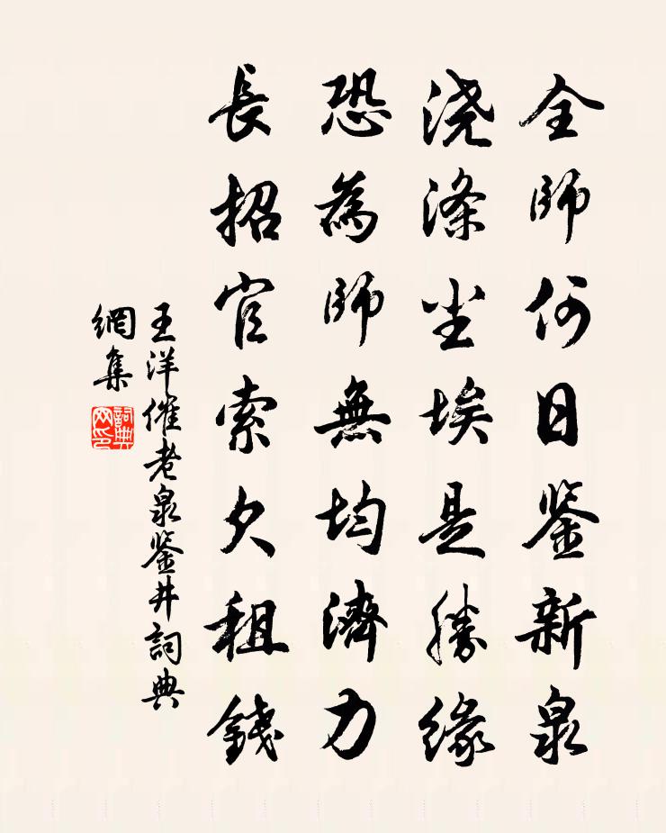 詩詞名句歷史字典書法欣賞書法字典國語詞典說文解字康熙字典古漢語字典標 題 作 者 詩 句 催老泉鑒井作者:王洋 朝代:宋代催老泉鑒井原文全師何日鑒新泉,澆滌塵埃是勝緣。恐為師無均濟力,長招官索欠租錢。詩詞問答問:催老泉鑒井的作者是誰?答:王洋問:催老泉鑒井寫於哪個朝代?答:宋代王洋催老泉鑒井書法欣賞催老泉鑒井書法作品詩詞推薦水亭秋日偶書林逋〔宋代〕巾子峰烏臼樹,微霜未落已先紅。憑闌高看復低看,半在石池波影中。賞梅佳什既不得陪從又莫獲少留深以為恨輒賡孫逸〔宋代〕郡務裝懷日晷催,東園未睹一枝梅。從容後賞輪先見,汩沒塵勞恨阻陪。待雪最宜寒艷坼,迎春會有暗香來。悵然鳳棲梧(壽外舅)廖行之〔宋代〕破臘先春梅有意。管鄰年華,總在清香蕊。不逐浮花紅與紫。歲寒來壽仙翁醉。袞袞諸公名又利。誰似高標,擺卻無隱釋心月〔宋代〕望州烏石未相見,南嶽天台幾對談。引得廬山曾失笑,至今滿面是羞慚。再乞休致未遂得二詩呈之奇鄉友曹勛〔宋代〕錄錄雖能早致身,中年東海與西秦。只宜桐柏山中老,不是麒麟閣上人。故病未休新病起,黑頭應笑白頭新。天公鶴廟松張堅〔宋代〕誰種飛仙百丈梯,風摧雨折昔人非。憑誰寄語楊員外,留取孫令待令威。次韻子瞻與安節夜坐三首蘇轍〔宋代〕少年高論苦崢嶸,老孚寒蟬不復聲。目斷家山空記路,手披禪冊漸忘情。功名久已知前錯,婚嫁猶須畢此生。家世思佳客(秋扇)高觀國〔宋代〕入手西風意已羞。不須玉斧為重修。撲螢涼夜沈沈月,障面清歌澹澹秋。休棄置,且遲留。可憐又向篋中收。莫教秋登萬山寄張五孟浩然〔唐代〕北山白雲里,隱者自怡悅。相望試登高,心飛逐鳥滅。愁因薄暮起,興是清秋發。時見歸村人,沙行渡頭歇。天邊次韻知縣兄蘇泂〔宋代〕秋聲物物類歌豳,旋轉天機屬大鈞。一雨薦涼全卻暑,兩湖添綠不生塵。黃花又近重陽酒,白髮長思五柳人。急喚送隱士游京淮釋斯植〔宋代〕送君湖柳下,未別已關情。古塞去程遠,寒江入夢清。野雲低水樹,山寸閉春城。到處逢知已,虛傳隱姓名。早春寄景仁司馬光〔宋代〕疊石溪上春,茅茨卜築新。前言如不踐,山蟬又笑人。偈頌二十五首釋道璨〔宋代〕開眼便是,開口便是。舉手便是,舉足便是。雖然如是,未是未是。贈垂光同年徐夤〔唐代〕丹桂攀來十七春,如今始見茜袍新。須知紅杏園中客,終作金鑾殿里臣。逸少家風惟筆札,玄成世業是陶鈞。他時和趙守獨游水西寺程炎子〔宋代〕吟月歌風酒力微,獨尋幽壑叩禪扉。泊隄小艇迎人渡,入水閒雲伴鶴飛。寓嘆陸游〔宋代〕日夕羊牛下,月明烏鵲飛。林林皆有托,貿貿獨安歸?疾痼方求藥,秋高未製衣。岷峨不遂隱,更恨昔謀非。瀟湘八景煙寺晚鐘宋寧宗〔宋代〕金碧招提古,高峰最上層。喧風僧入梵,宿霧佛前燈。禪觀延空寂,蒲牢忽震凌。黃昏山路險,窘步一枝藤。踏莎行慢歐陽修〔宋代〕獨自上孤舟。倚危檣目斷。難成暮雨,更朝雲散。涼勁殘葉亂。新月照、澄波淺。今夜裡,厭厭離緒難銷遣。強來太常引(臘前梅)韓淲〔宋代〕小春時候臘前梅。還知道、為誰開。應繞百千回。夜色轉、參橫斗魁。十分孤靜,替伊愁絕,片月共徘徊。一陣暗釣台林景熙〔宋代〕曾來天上宿,夢不離寒磯。宇宙雙台迥,煙波一客歸。姓增江郡重,墓隔越山微。千古登臨意,淒涼帶夕暉。名句推薦深秋寒夜銀河靜,月明深院中庭。尹鶚《臨江仙·深秋寒夜銀河靜》 細數十年事,十處過中秋。范成大《水調歌頭·細數十年事》 兵家稱客主異勢,客貴速戰,主貴持重。姚思廉《陳書·列傳·卷二十五》 疏籬曲徑田家小。雲樹開清曉。周邦彥《虞美人·疏籬曲徑田家小》 泉眼無聲惜細流,樹陰照水愛晴柔楊萬里《小池》 水遠煙微,一點滄洲白鷺飛歐陽修《採桑子·何人解賞西湖好》 汴水流,泗水流,流到瓜州古渡頭。吳山點點愁白居易《長相思·汴水流》 不似當時,小橋沖雨,幽恨兩人知。周邦彥《少年游·朝雲漠漠散輕絲》 白日來深殿,青雲滿後塵杜甫《寄李十二白二十韻》 學而不厭,誨人不倦。孔子弟子《論語·述而篇》