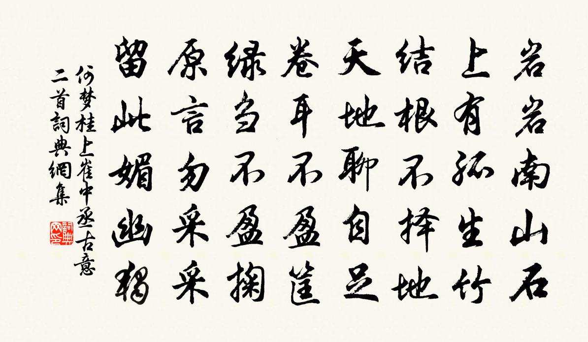 詩詞名句歷史字典書法欣賞書法字典國語詞典說文解字康熙字典古漢語字典標 題 作 者 詩 句 上崔中丞古意二首作者:何夢桂 朝代:宋代上崔中丞古意二首原文岩岩南山石,上有孤生竹。結根不擇地,天地聊自足。卷耳不盈筐,綠芻不盈掬。原言勿采采,留此媚幽獨。詩詞問答問:上崔中丞古意二首的作者是誰?答:何夢桂問:上崔中丞古意二首寫於哪個朝代?答:宋代何夢桂上崔中丞古意二首書法欣賞上崔中丞古意二首書法作品詩詞推薦游翠岩六首舒坦〔宋代〕翠岩老禪和,欲退未容請。聊許隱堂人,先點廣軒境。高松有寒清,孤雲無定影。草暖幽澗香,鳥啼清畫永。一笑書事十首劉克莊〔宋代〕幼作淳熙版籍民,老逢景定改元新。殘年且盡杯中物,他日誰澆柏下人。長鑱谷中忙斸雪,小車花外遍尋春。吾評芳春劉兼〔唐代〕微雨微風隔畫簾,金爐檀炷冷慵添。桃花滿地春牢落,柳絮成堆雪棄嫌。寶瑟不能邀卓氏,彩毫何必夢江淹。宦情辛酉大雪戲成二詩以千山鳥飛絕萬逕人蹤滅為周麟之〔宋代〕吾無千金裘,為博麴米春。床頭臘翁熟,漉以淵明巾。飲少輒至醉,醉眼迷天垠。沖寒望南巷,不見披氅人。摸魚子馬熙〔元代〕買陂塘旋栽楊柳,參知老圃機務。宰相得請歸田裡,久旱忽逢甘雨。懷鄂渚。悵黃鶴樓前,鸚鵡翔煙嶼。清魂可語南朝楊億〔宋代〕五鼓端門漏滴稀,夜簽聲斷翠華飛。繁星曉埭聞雞度,細雨春場射雉歸。步試金蓮波濺襪,歌翻玉樹涕沾衣。龍盤贈竇牟(一作竇洛陽牟見簡篇章,偶贈絕句)楊憑〔唐代〕直用天才眾卻瞋,應欺李杜久為塵。南荒不死中華老,別玉翻同西國人。第二百九十卷九日會飲翠麓趙處澹〔宋代〕山亭對佳客,秋老暮煙橫。鳥下江如畫,潮回浪有聲。竹光添麓潤,詩思入門清。偶約非因酒,相逢話此生。洞仙歌朱彝尊〔清代〕津亭回首,望高城天遠,何況城中玉人面。數郵簽萬里,嶺路千重,行不得,懊惱鷓鴣啼遍。郁孤台畔水,解送歸贈宣義大師英公師頏〔宋代〕禪得玄機筆得精,孤雲光彩甚分明。毫端落紙堪為寶,海內無人不重名。山約終歸雙履在,髭因涼剃一刀輕。何妨和前韻廖行之〔宋代〕詩原渺萬頃,袞袞來無窮。定應遊戲爾,豈事雕琢工。三章見囊穎,一讀清頭風。貧兒獲茲富,往往至寶同。觀禊帖有感三絕范成大〔宋代〕寶章薶九泉,摹本范在世。白鵝滿波間,誰識腕中意。霜花腴·重陽前一日泛石湖吳文英〔宋代〕翠微路窄,醉晚風、憑誰為整欹冠。霜飽花腴,燭消人瘦,秋光作也都難。病懷強寬。恨雁聲、偏落歌前。記年時峨眉山廨趙汝回〔宋代〕褐衣蔬食苦吟身,肌骨雖清鬢雪新。栗里未營三畝宅,桃源已過一年春。也知官職難痴望,化得妻兒不誶貧。別寫菩薩蠻(中呂宮)張先〔宋代〕簟紋衫色嬌黃淺。釵頭秋葉玲瓏翦。輕怯瘦腰身。紗窗病起人。相思魂欲絕。莫話新秋別。何處斷離腸。西風昨夜和酬社從事題壁林逋〔宋代〕弭蓋入衡宇,相看情獨深。蕭疏秋樹色,老大故人心。佳話頻移晷,清飆幾拂襟。寥然長卿壁,題此比兼金。幔卷朱彝尊〔清代〕桃葉舟回,楓林客去,西渚波千疊。見十里橫塘,幾陣涼颸,獨上小樓,柔腸斷絕。春信鶯花,秋期河漢,總是愁已亥雜詩 109龔自珍〔清代〕四海流傳百軸刊,皤皤國老尚神完。談經忘卻三公貴,只作先秦伏勝看。辨漆趙蕃〔宋代〕面上清如水,牽絲作鉤鉤。撥開鷹糞腳,打起有浮漚。梅花蘇泂〔宋代〕清貞表獨立,半蕊便風流。信有魁天下,群芳未轉頭。名句推薦心有疑,隨札記。就人問,求確義。李毓秀《弟子規·餘力學文》 大嫂采芙蓉,溪湖千萬重。李白《湖邊採蓮婦》 下馬登鄴城,城空復何見。岑參《登古鄴城》 取次花叢懶回顧,半緣修道半緣君。元稹《離思五首·其四》 逐流牽荇葉,緣岸摘蘆苗。儲光羲《江南曲四首》 燈火萬家城四畔,星河一道水中央。白居易《江樓夕望招客》 乘人之車者載人之患,衣人之衣者懷人之憂,食人之食者死人之事。司馬遷《史記·七十列傳·淮陰侯列傳》 春水別來應到海,小松生命合禁霜李覯《秋晚悲懷》 野者上,園者次。陸羽《茶經·一之源》 曲徑穿花尋蛺蝶,虛闌傍日教鸚鵡。岳珂《滿江紅·小院深深》