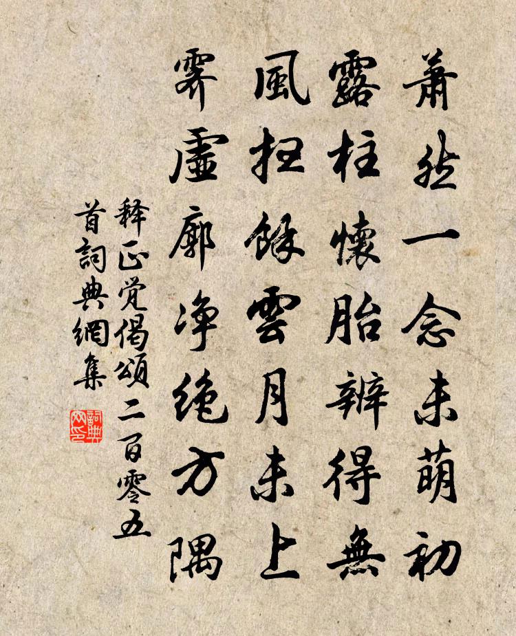詩詞名句歷史字典書法欣賞書法字典國語詞典說文解字康熙字典古漢語字典標 題 作 者 詩 句 偈頌二百零五首作者:釋正覺 朝代:宋代偈頌二百零五首原文蕭然一念未萌初,露柱懷胎辨得無。風掃余雲月未上,霽虛廓淨絕方隅。詩詞問答問:偈頌二百零五首的作者是誰?答:釋正覺問:偈頌二百零五首寫於哪個朝代?答:宋代釋正覺偈頌二百零五首書法欣賞偈頌二百零五首書法作品詩詞推薦如意湖乾隆〔清代〕塞水恆流此處渟,柳湖蓮島偶募形。煙容波態皆如畫,屬意悠然在杳冥。禮石霜慈大師塔釋智遇〔宋代〕水繞山轉獅子窟,赫赫金毛從此出。野犴既死狐兔悲,天下叢林鬧聒聒。我來不敢重步行,森嚴匝匝清風生。三拜紅樓夢十二曲——分骨肉曹雪芹〔清代〕一帆風雨路三千,把骨肉家園,齊來拋閃。恐哭損殘年,告爹娘休把兒懸念。自古窮通皆有定,離合豈無緣?從今歲暮感懷以餘年諒無幾休日愴已迫為韻陸游〔宋代〕士生始志學,固為聖人徒,人人可稷契,世世皆唐虞。仰事與俯育,治道無絕殊。孔孟之所傳,世俗顧謂迂。申韓偈頌一百零九首釋可湘〔宋代〕黃面老漢,至死脫空。分明病背,特故摩胸。當日無人知此意,年年花鳥訴春風。蝶戀花歐陽修〔宋代〕水浸秋天風皺浪。縹緲仙舟,只似秋天上。和露採蓮愁一餉。看花卻是啼妝樣。折得蓮莖絲未放。蓮斷絲牽,特地送合學袁尚書帥蜀沈繼祖〔宋代〕兵書一篋老空休,尚記當年寓益州。捫虱蓋嘗談世事,膾鱸聊復寄扁舟。我方泥飲夸嚴尹,公喜逢時過武侯。作此病中作陸游〔宋代〕浮世寄酣枕,勞生居漏船。已悲身老大,更著病沈綿。親舊動千里,歡娛無百年。床頭周易在,端擬絕韋編。過田家陳允平〔宋代〕村南啼布穀,村北響繅車。隔浦賣魚市,傍橋沽酒家。野花朝日暖,溪柳背風斜。又過東鄰去,東鄰採菊芽。送鄭少卿景望知建寧陳傅良〔宋代〕屏廢誠愚分,牢愁更索居。若逢知己問,猶解課兒書。地僻門長閉,年飢菜自鋤。相望無一字,不是故情疎。郊廟歌辭。梁太廟樂舞辭。送神佚名〔唐代〕其降無從,其往無蹤。黍稷非馨,有感必通。赫奕令德,仿佛睟容。再拜慌忽,遐想昊穹。中秋月郭印〔宋代〕蕭蕭灝氣清,風露秋將半。今夕更無雲,銀盤轉霄漢。鳥語茂林驚,樹影空庭亂。常時豈不佳,作意人瞻玩。我欲贈姜白石潘檉〔宋代〕世間官職似樗蒲,採到枯松亦大夫。白石道人新拜號,斷無繳駮任稱呼。尹樓岩久留華亭朱南傑〔宋代〕風雷昨夜揭窗紗,未信樓岩不憶家。和靖山頭春到了,莫因尋鶴負梅花。發端州初入西江宋之問〔唐代〕問我將何去,清晨溯越溪。翠微懸宿雨,丹壑飲晴霓。樹影捎雲密,藤陰覆水低。潮回出浦駛,洲轉望鄉迷。人意偈頌一百零四首釋紹曇〔宋代〕蒿籬關猛虎,筆管養蒼龍。穩帖帖藏牙伏爪,黑漫漫怪雨顛風。臨濟小廝兒驚心欲折,豐乾老凍腕睡思方濃。山蒙江心長句葛紹體〔宋代〕問津城西市,呼渡江南岸。棹穩當潮生,帆輕趁風便。龍翔古招提,鳥革今輪奐。回合列翠屏,周遭鋪素練。邀行宿靈石方丈陳著〔宋代〕偶因塵隙游靈石,不覺夷猶到夜深。坐對半窗山月影,參成一片白雲心。螿著露更相調,老葉無風也自吟。分得僧兵後西日溪行皎然〔唐代〕一從清氣上為天,仙叟何年見乾海。黃河幾度濁復清,此水如今未曾改。西尋仙人渚,誤入桃花穴。風吹花片使我早行五首吳芾〔宋代〕此地惟多古樹林,路傍處處足清陰。行人九夏熱如火,到此清風忽滿襟。名句推薦拔一毛而利天下,不為也。孟子《孟子·盡心章句上·第二十六節》 學不可以已。荀子《荀子·勸學》 今日漢宮人,明朝胡地妾。李白《王昭君二首》 長太息以掩涕兮,哀民生之多艱。屈原《離騷》 敏而好學,不恥下問,是以謂之文也。孔子弟子《論語·公冶長篇》 亭皋木葉下。隴首秋雲飛。柳惲《搗衣詩》 零落成泥碾作塵,只有香如故。陸游《卜運算元·詠梅》 寵錫從仙禁,光華出漢京。張九齡《奉和聖制送尚書燕國公赴朔方》 丹灶初開火,仙桃正落花。孟浩然《清明日宴梅道士房 / 宴梅道士山房》 舉杯互敬屠蘇酒,散席分嘗勝利茶。 * 《元旦口占用柳亞子懷人韻》