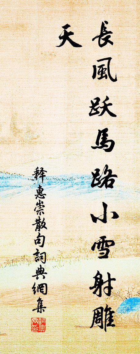 詩詞名句歷史字典書法欣賞書法字典國語詞典說文解字康熙字典古漢語字典標 題 作 者 詩 句 句作者:釋惠崇 朝代:宋代句原文長風躍馬路,小雪射鵰天。詩詞問答問:句的作者是誰?答:釋惠崇問:句寫於哪個朝代?答:宋代釋惠崇句書法欣賞句書法作品詩詞推薦祝英台近(武陵寄暖紅諸院)趙長卿〔宋代〕記臨歧,銷黯處。離恨慘歌舞。恰是江梅,開遍小春暮。斷腸一曲金衣,兩行玉箸,酒闌後、欲行難去。惡情緒。挽鮑監鎮沈說〔宋代〕一紙辟書馳,華年發軔時。排云何不到,殞露遽如斯。幼子不知父,偏親反哭兒。有書來謁些,忍淚看埋碑。寄俞君度強至〔宋代〕夫子憊已甚,平生心向存。黃金空舊產,白首寄他門。獨酌醉應淺,愁吟聲更吞。飄零那復久,知己有平原。次韻子瞻和淵明飲酒二十首蘇轍〔宋代〕我友二三子,兼有仕未仕。青松出林秀,豈獨私與己。斂然不求人,而我自罍恥。臨風忽長鳴,誰信日千里。江行冬夜耿拾遺王秀才就宿因傷故人司空曙〔唐代〕舊時聞笛淚,今夜重沾衣。方恨同人少,何堪相見稀。竹煙凝澗壑,林雪似芳菲。多謝勞車馬,應憐獨掩扉。子瞻聞瘦以詩見寄次韻蘇轍〔宋代〕多生習氣未除肉,長夜安眠懶食粥。屈伸久已效熊虎,倒掛漸擬同蝙蝠。眾笑忍飢長杜門,自恐莫年還入俗。經旬金應第一百一十文天祥〔宋代〕追隨三十載,艱難愧深情。何處埋爾骨,呼號傍孤城。七日夜女歌·其二佚名〔〕長河起秋雲,漢渚風涼發。含欣出霄路,可笑向明月。古劍行韋應物〔唐代〕千年土中兩刃鐵,土蝕不入金星滅。沉沉青脊鱗甲滿,蛟龍無足蛇尾斷,忽欲飛動中有靈。豪士得之敵國寶,仇家題魚磯釋智愚〔宋代〕秋竿倚石台,沙鳥喑相猜。一草有時勸,幾朝魚不來。初冬雜詠陸游〔宋代〕老去胸中百事真,同游無復白頭新。鵲從熟後頻分食,鹿漸馴來不避人。滿江紅宋自遜〔宋代〕舉扇西風,又十載、重遊秋浦。對舊日、江山錯愕,鬢絲如許。世事興亡空感慨,男兒事業誰堪數。被老天、開眼游曹園趙汝鐩〔宋代〕先登東畔高亭子,洗卻胸襟萬斛塵。落乍玉殘梅興盡,舊桃金吐柳芽新。倚林困鶴聊休足,巡食飢烏不避人。尚欲再次韻陳造〔宋代〕傳聞使者心,忽士幾忍渴。廣文馬已秣,勢似不宜遏。長翁仕窮山,離索幾苟活。藉君忘幽獨,長恐有力奪。勸其郊廟歌辭。五郊樂章。送神佚名〔唐代〕春末冬暮,徂夏杪秋。土王四月,時季一周。黍稷已享,籩豆宜收。送神有樂,神其賜休。延平次趙糾曹韻十四首第一溪山陳宓〔宋代〕溪山號清絕,自古產奇人。可惜吾夫子,南來不到閩。雜詠一百首投梭女劉克莊〔宋代〕琴挑何曾動,梭投未免慚。女郎循古禮,元不解清談。送明甫初筮十首劉克莊〔宋代〕莫嘆家庭遠,卿侯即父師。尚於吾繾綣,定不汝瑕疵。人不聊生梅柳早有春意戴復古〔宋代〕歲歉家家窘,時危事事難。出門如有礙,對酒亦無歡。楊柳含春思,梅花耐歲寒。少須天意轉,谷熟萬民安。楊帥二首項安世〔宋代〕更須石叟共甘公,酌得民言帝自同。四海人才容接里,百城生聚撫摩中。似聞聖世開皇極,欲倚名賢鎮士風。看把名句推薦青春花姊不同時。淒涼生較遲。吳文英《醉桃源·芙蓉》 烏絲闌紙嬌紅篆,歷歷春星。納蘭性德《紅窗月·燕歸花謝》 日落謝家池館,柳絲金縷斷。韋莊《歸國遙·春欲晚》 己有能,勿自私。人所能,勿輕訾。李毓秀《弟子規·泛愛眾》 鵬北海,鳳朝陽。辛棄疾《鷓鴣天·送廓之秋試》 鳳凰城闕知何處,寥落星河一雁飛。賀鑄《思越人·紫府東風放夜時》 有理言自壯,負屈聲必高。馮夢龍《警世通言·卷十五》 唯有門前鏡湖水,春風不改舊時波。賀知章《回鄉偶書二首》 古之為政,愛人為大戴聖《禮記·哀公問》 狎興生疏,酒徒蕭索,不似少年時。柳永《少年游·長安古道馬遲遲》