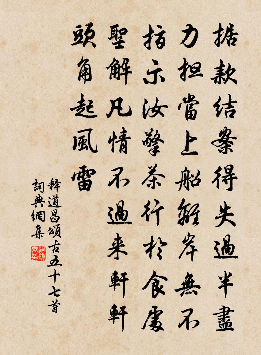 詩詞名句歷史字典書法欣賞書法字典國語詞典說文解字康熙字典古漢語字典標 題 作 者 詩 句 頌古五十七首作者:釋道昌 朝代:宋代頌古五十七首原文據款結案,得失過半。盡力擔當,上船離岸。無不指示汝,擎茶行於食處。聖解凡情不過來。軒軒頭角起風雷。詩詞問答問:頌古五十七首的作者是誰?答:釋道昌問:頌古五十七首寫於哪個朝代?答:宋代釋道昌頌古五十七首書法欣賞頌古五十七首書法作品詩詞推薦樂府曹植〔魏晉〕市肉取肥。酤酒取醇。交觴接杯。以致殷懃。嘲元中丞(一作襄陽中堂賞花為憲與妓人戲語潮之)段成式〔唐代〕鶯里花前選孟光,東山逋客酒初狂。素娥畢竟難防備,燒得河車莫遣嘗。宮詞王珪〔唐代〕大家裝著門時宜,獨自尋拂曉淡眉。為梁淺黃衫子色,金盆添水看鵝兒。句張鎡〔宋代〕開鏡影相歡。李仁甫將至郭下以詩迎之晁公溯〔宋代〕公館可休會,良宵宜對床。肯污白雲屨,來過碧瀾堂。置饌同三飯,開筵累十觴。涼秋當泛菊,小住擷微芳。紅窗月·燕歸花謝納蘭性德〔清代〕燕歸花謝,早因循、又過清明。是一般風景,兩樣心情。猶記碧桃影里、誓三生。烏絲闌紙嬌紅篆,歷歷春星。道燕歸梁張先〔宋代〕去歲中秋玩桂輪。河漢淨無雲。今年江上共瑤尊。都不是、去年人。水精宮殿,琉璃台閣,紅翠兩行分。點唇機動詩品二十四則。雄渾司空圖〔唐代〕大用外腓,真體內充。返虛入渾,積健為雄。具備萬物,橫絕太空。荒荒油雲,寥寥長風。超以象外,得其環中。花犯(再和中甫)劉辰翁〔宋代〕甚天花、紛紛墜也,偏偏著余帽。乾坤清皓。任海角荒荒,都變瑤草。落梅天上無人掃。角吹吹不到。想特為、東青玉案(送人赴黃岡令)王千秋〔宋代〕雪堂不遠臨皋路。悵仙伯、騎鯨去。燕麥桃花更幾度。橫橋雖在,種松無有,誰是關心處。解鞍君到冬雖暮。傳語西風王安石〔宋代〕少年不知秋,喜聞西風生。老大多感傷,畏此蟠蟀鳴。況乃舍親友,抱病獨遠行。中夜臥不周,惻惻感我情。起視再用韻三首裘萬頃〔宋代〕雪裡鷗盟元未寒,小舟南浦著漁竿。眼明似共月千里,衣冷欲迷雲一灘。挽右史方鐵庵詩三首李昴英〔宋代〕一疏綱常重,端平起直聲。難磨石宋璟,不動鐵元城。前輩風流在,南州個信誠。精神兼學力,傾倒為遐氓。題時覺寺在在堂十二首舒坦〔宋代〕沙溪過雨半清渾,徑石高低帶雪痕。又見山農話春事,腰鎌兩兩喚兒孫。泊釣台方岳〔宋代〕落帆鸕鶿步,倚策羊裘軒。紛披稚篠閒,森郁古木尊,幽蹊石齒齒,醉袖風翻翻。緬懷台上人,老蘚雙骭存。寧知第一百九十六文天祥〔宋代〕客從何鄉來,挾矢身漢月。殺身傍權要,門戶有旌節。游保寧院練光亭同丘程凌林四君分題用業字韻蘇頌〔宋代〕寺本梁瓦棺,地臨吳建業。何人構虛亭,勝概壓危堞。岩扃豁常開,江練靜相協。洪濤雖震騰,迅流終妥帖。遠窮六盤山詩梁聯馨〔清代〕繞徑寒雲拂步生,巑岏青嶂壓孤城。東連華岳三峰小,北擁蕭關大漠平。山外煙霞閒隱見,世間塵土自虛盈。勞人過老子廟李隆基〔唐代〕仙居懷聖德,靈廟肅神心。草合人蹤斷,塵濃鳥跡深。流沙丹灶沒,關路紫煙沉。獨傷千載後,空餘松柏林。趙寶學輓詞二首林季仲〔宋代〕珠海光無盡,瑤山氣自溫。鴻基開烈祖,餘慶襲賢孫。妙墨潛虬動,雄詞駭浪翻。九重應震悼,同性失毛原。名句推薦人善被人欺,馬善被人騎。佚名《增廣賢文·上集》 漢寢唐陵無麥飯,山溪野徑有梨花。趙鼎《寒食》 大曰逝,逝曰遠,遠曰反。老子《老子·道經·第二十五章》 牽牛織女遙相望,爾獨何辜限河梁。曹丕《燕歌行二首·其一》 酌酒會臨泉水,抱琴好倚長松。王維《田園樂七首·其七》 為高必因丘陵,為下必因川澤。孟子《孟子·離婁章句上·第一節》 半生已分孤眠過,山枕檀痕涴。納蘭性德《虞美人·曲闌深處重相見》 會天大雨,道不通,度已失期司馬遷《陳涉世家》 飲馬渡秋水,水寒風似刀。王昌齡《塞下曲四首》 菡萏香銷翠葉殘,西風愁起綠波間。李璟《攤破浣溪沙·菡萏香銷翠葉殘》