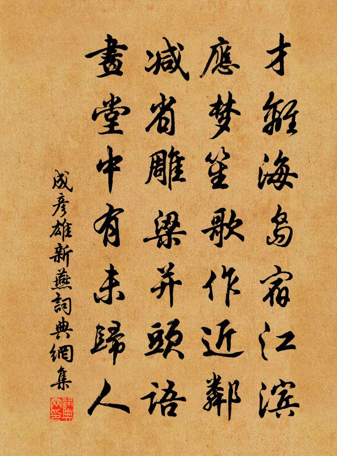 詩詞名句歷史字典書法欣賞書法字典國語詞典說文解字康熙字典古漢語字典標 題 作 者 詩 句 新燕作者:成彥雄 朝代:唐代新燕原文才離海島宿江濱,應夢笙歌作近鄰。減省雕梁並頭語,畫堂中有未歸人。詩詞問答問:新燕的作者是誰?答:成彥雄問:新燕寫於哪個朝代?答:唐代問:新燕是什麼體裁?答:七絕成彥雄新燕書法欣賞新燕書法作品注釋全唐詩:卷759-7詩詞推薦風吹木葉吟邵雍〔宋代〕風吹木葉不吹根,慎勿將根苦自陳。天子舊都閒好住,聖人餘事冗休論。長年國里神仙侶,安樂窩中富貴人。萬水代人上師垣生辰三首仲並〔宋代〕化工作意辦春來,斗柄明朝後日回。東風先到江南岸,江山濯濯無塵埃。靈光蔥蔥隨處有,夜半兩兩明三台。天遣五仙觀方信孺〔宋代〕蹁躚天上五仙人,羊駕何年到海濱。晉漢相傳羊無有,觀中遺石自輪囷。醉桃源·柳翁元龍〔宋代〕千絲風雨萬絲晴。年年長短亭。暗黃看到綠成陰。春由他送迎。鶯思重,燕愁輕。如人離別情。繞湖煙冷罩波明。哭潘義榮二首鄭剛中〔宋代〕少年聯轡入京華,闊步超群便起家。親覽聲名高漢殿,夏時蹤跡僅長沙。 * 所在留餘刃,懷璧終身不見瑕。老眼憶秦娥 昨日嘗賦憶秦娥一首,以介石齊前木倪瓚〔元代〕笑人寂寞,蓋以風雨傷懷耳。茲重改呈,又作一首,共寫呈,二君卻不可扶疏玉。蟾宮樹影闌乾曲。闌乾曲。一襟游龍湫拜諾矩羅尊者釋祖珍〔宋代〕十里松溪到上流,斷崖千尺瀉龍湫。誰言尊者心無著,冷眼長年看不休。壽丞相慶七十五首吳泳〔宋代〕渤海兵戈靜,全淮版籍歸。紅繅蠶繭大,紫擘蟹鰲肥。柳港添生色,榆關閟殺機。君王新御殿,莫使諫書稀。薛侍朗移鎮合肥被命入覲賦唐律詩二章曹彥約〔宋代〕經濟蜚聲數十年,只今韞櫝固依然。老於思慮惟憂國,好在功名更守邊。人望鼎來須易地,春風早去便朝天。漢家江湖偉觀朱繼芳〔宋代〕吳山表里水為池,百有餘年壯帝畿。天目舊將雙鳳下,海門新拱六龍飛。胥濤白雪生秋思,太乙紅雲駐夕暉。江上次金東園農家雜詠八首楊公遠〔宋代〕婦作生涯勤杼軸,夫營活計在桑田。老翁榾柮爐邊坐,幼稚檐前負日暄。新正重華宮侍皇太后宴乾隆〔清代〕元正大禮賀慈寧,翌日重華鳳輦停。左右承顏娛永晝,曾元繞膝樂家庭。盆中茂樹萬年柏,階際才舒兩葉蓂。小部寄題朱元晦武夷精舍十二隱求堂楊萬里〔宋代〕夢裡長逢孟,羹中亦見顏。痴兒入吾室,真作釆薇看。蘭陵王黃廷璹〔宋代〕絮花弱。吹滿斜陽院落。鞦韆外,無數小舟,綠水溶溶帶城郭。流光漫暗覺。辜卻。鶯呼燕諾。歡游地,都在夢中蠶婦詞李若川〔宋代〕舍前舍後桑成林,鋤墾不放青草侵。東風滿條新葉大,村家愛此輕黃金。日暖春蠶大眠起,戢戢盈箱齊若指。看蠶市李嶠〔唐代〕闤闠開三市,旗亭起百尋。漸離初擊築,司馬正彈琴。細柳龍鱗映,長槐兔月陰。徒知觀衛玉,詎肯掛秦巾。鹿鳴宴席上詩二首奉送解元諸先輩汪應辰〔宋代〕嘉賓式燕正炎曦,風自南來為解圍。細聽吹笙仍鼓瑟,即看結綬卻登畿。清朝不用齎刀布,晝日偏宜著錦衣。太守信步丘葵〔宋代〕榻上殘書已倦攤,幅巾藜杖出柴關。卜居宿鷺眠牛處,覓句殘蘆敗葦間。心逐間雲橫碧落,眼隨飛鳥度青山。忽然天津橋劉叉〔唐代〕洛陽宮闕照天地,四面山川無毒氣。誰令漢祖都秦關,從此奸雄轉相熾。松徑林逋〔宋代〕霜子落秋筇卓破,雨釵堆地屐拖平。不知呵止長安客,肯愛深穿冷翠行。名句推薦禍之所由生也,生自纖纖也。荀子《荀子·大略》 萬里辭家事鼓鼙,金陵驛路楚雲西。劉長卿《送李判官之潤州行營》 虎踞龍蟠何處是,只有興亡滿目。辛棄疾《念奴嬌·登建康賞心亭呈史致道留守》 當年得意如芳草。日日春風好。辛棄疾《虞美人·賦虞美人草》 親戚或余悲,他人亦已歌。陶淵明《擬輓歌辭三首》 長夏村墟風日清,檐牙燕雀已生成。張耒《夏日三首·其一》 清明時節雨紛紛,路上行人慾斷魂。杜牧《清明》 人生貴得適意爾。劉義慶《世說新語·識鑒》 春日宴,綠酒一杯歌一遍。馮延巳《長命女·春日宴》 時無英雄,使豎子成名!房玄齡《晉書·列傳·第十九章》