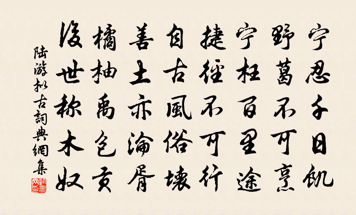 詩詞名句歷史字典書法欣賞書法字典國語詞典說文解字康熙字典古漢語字典標 題 作 者 詩 句 擬古作者:陸游 朝代:宋代擬古原文寧忍千日飢,野葛不可烹;寧枉百里途,捷徑不可行。自古風俗壞,善土亦淪胥。橘柚禹包貢,後世稱木奴。詩詞問答問:擬古的作者是誰?答:陸游問:擬古寫於哪個朝代?答:宋代問:陸游的名句有哪些?答:陸游名句大全陸游擬古書法欣賞擬古書法作品詩詞推薦戲呈鄭卻華縣丞張鎡〔宋代〕疊破當年御賜袍,飽看人釣六靈鰲。行藏雖似少中節,識趣不妨依舊高。入夢傅岩初豈意,上書曼倩本徒勞。浮生念奴嬌黃應武〔宋代〕乾坤開闢,桂林有、元氣自來融結。石磴盤空行木杪,天柱屹然中立。窟宅幽深,泉源清遠,不是靈神擘。潛通後新樓詩二十首滿桂樓李紳〔唐代〕為憐湖水通宵望,不學樊楊卻月樓。惟待素規澄滿鏡,莫看纖魄掛如鉤。捲簾方影侵紅燭,繞竹斜暉透碧流。蕭瑟三吳漫遊集唐方鳳〔宋代〕江南江北望煙波,南國浮雲水上多。共說總戎雲鳥陣,中原將帥憶廉頗。太一宮孔武仲〔宋代〕江城南畔碧連峰,疇昔貞人寄此中。琳宇邃深靈跡在,仙壇牢落杏花空。池塘自老琴高鯉,岩谷仍回禦寇風。共羨題鴛鴦浦漵圖佚名〔宋代〕睡足鴛鴦各欲飛,水花欹岸兩三枝。多情公子因乘興,寫出江春日暖時。偈頌一百零二首釋紹曇〔宋代〕秘魔擎叉,俱胝豎指。邪法難扶,如何得是。山僧冷地思量,不覺吞聲飽氣。攻乎異端,斯害也矣。洛陽易士達〔宋代〕季龍方始是童時,視志觀聲已嘆奇。嘯倚上都門外者,如何夷甫卻先知。芭蕉三首楊萬里〔宋代〕檐牙窗額兩三株,只欠王維畫雪圖。開卷不題元字腳,碧窗圜蠟有如無。宋山掃墓書所見吳潛〔宋代〕松楸長夜夢,風露作晨征。山近卻無色,葉枯偏有聲。架禾知歲熟,種麥得天晴。到底農桑好,營營誤此生。雨中花(七夕)楊無咎〔宋代〕漠漠雲輕,涓涓露重,西風特地颼颼。覺良宵初永,袢暑微收。乘鶴緱山,浮槎銀漢,尚想風流。笑人間兒戲,瓜酬春湖史履庸惠四皓圖艾性夫〔宋代〕有客有客吾春湖,踏霜打門呼老夫。寒溫粗了不暇坐,兩手奉我商山圖。皓首龐眉發如漆,千古高人誰畫出。疏行幽居書事陸游〔宋代〕安命知天更不疑,幽居最愛早寒時。手中書墮初酣枕,窗下燈殘正劇棋。鮮鯽每從溪女買,香菰時就釣船炊。山陰餞平洲僧徐集孫〔宋代〕天地一身閒,袈裟裹亂山。聽經離竺寺,結制去雲間。包重懸詩稿。藤枯帶蘚斑。西風落梧葉,應又向西還。過楊村溪張嵲〔宋代〕坡陀兩山間,滄波旦夕騖。高柳橫澄流,歲久根全露。細雨川上來,瀾漪滿沿泝。灌木生退灘,危橋架孤嶼。石瀨花月吟效連珠體十一首 8唐寅〔明代〕有花無月恨茫茫, 有月無花恨轉長; 花美似人臨月鏡, 月明如水照花香。 扶笻月下尋花步, 攜酒花前帶題朝爽軒戴栩〔宋代〕不須拄笏覓西山,太白峰頭雪未乾。物景四時俱是爽,江流三面此為寬。慣來幽鳥遺巢在,欲縱香苞和雨寒。我有宿徐靈暉山舍趙師秀〔宋代〕分坐橋邊石,同歸原上村。窺燈禽出樹,聞語仆開門。雪後挑蔬潔,更深貰酒渾。極知高臥久,吾賤不能倫。西江月·堂上謀臣尊俎劉過〔宋代〕堂上謀臣尊俎,邊頭將士干戈。天時地利與人和。燕可伐歟曰可。今日樓台鼎鼐,明年帶礪山河。大家齊唱大風歌聞紅鶴有感張耒〔宋代〕東風吹曉麥青青,柯山樹頭紅鶴嗚。窗間夢斷客嘆息,憶我去年臨汝城。平池朱閣花如雪,峴山少室兩奇絕。豈知名句推薦憐君片雲思,一棹去瀟湘。杜牧《送薛種游湖南》 綠蓑江上秋聞笛,紅袖樓頭夜倚欄。曹雪芹《香菱詠月·其三》 按其實而審其名,以求其情;聽其言而察其類,無使方悖。呂不韋《呂氏春秋·覽·審分覽》 天朗氣清,惠風和暢王羲之《蘭亭集序 / 蘭亭序》 柳花驚雪浦,麥雨漲溪田。李賀《南園十三首》 璇室群酣夜,璜溪獨釣時。劉基《題太公釣渭圖》 群臣見素,則大君不蔽矣。韓非及後人《韓非子·二柄》 千家閉戶無砧杵,七夕何人望鬥牛。李嘉祐《早秋京口旅泊章侍御寄書相問因以贈之時七夕》 冬夜夜寒覺夜長,沉吟久坐坐北堂。李白《夜坐吟》 舊時燕子還飛否?今古不勝情。歸莊《錦堂春·半壁橫江矗起》