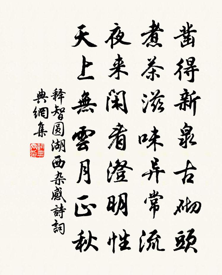 詩詞名句歷史字典書法欣賞書法字典國語詞典說文解字康熙字典古漢語字典標 題 作 者 詩 句 湖西雜感詩作者:釋智圓 朝代:宋代湖西雜感詩原文鑿得新泉古砌頭,煮茶滋味異常流。夜來閒看澄明性,天上無雲月正秋。詩詞問答問:湖西雜感詩的作者是誰?答:釋智圓問:湖西雜感詩寫於哪個朝代?答:宋代釋智圓湖西雜感詩書法欣賞湖西雜感詩書法作品詩詞推薦次韻答宗汝為初夏見寄黃庭堅〔宋代〕宮蛙無時休,不知憂復樂。夕暉半規黃,冉冉納暮壑。鳥栖松隕花,風下竹解籜。南箕與北斗,磊磊貫纓絡。懷我抑佚名〔先秦〕抑抑威儀,維德之隅。人亦有言:靡哲不愚,庶人之愚,亦職維疾。哲人之愚,亦維斯戾。無競維人,四方其訓之擬古詩鮑照〔南北朝〕魯客事楚王。懷金襲丹素。既荷主人恩。又蒙令尹顧。日晏罷朝歸。輿馬塞衢路。宗黨生光輝。賓仆遠傾慕。富貴出郊即事朱子恭〔宋代〕水滿牛耕犢後隨,早田大半已翻犁。趁時浸谷清明近,次第身針綠又齊。送彭將軍雲中覲兄李端〔唐代〕聞說蒼鷹守,今朝欲下鞲。因令白馬將,兼道覓封侯。略地關山冷,防河雨雪稠。翻弓騁猿臂,承箭惜貂裘。設伏送王仲言倅泰州絕句陸游〔宋代〕汝陰太史萬簽藏,酸棗先生六世芳。豹尾屬車留不住,卻尋陳跡海陵倉。孫彥古畫風雨山水歌張耒〔宋代〕山深岩高石壁青,白日忽變天晦冥。黑風驅雲走不停,驚電疾雨來如傾。山前雨點大如手,山下水涌危槎橫。崩崖德清永興寺傅夢得〔宋代〕蒼寒松竹滿,此地稱僧居。寺僻啼林鳥,廊空響木魚。煮茶燒樹葉,帶雨翦園蔬。待了功名債,重來買地鋤。送王安節赴武康尉賀鑄〔宋代〕江左風華推第一,王氏堂堂文獻出。烏衣諸郎能少屈,尚執中司三尺律。君方色養白頭親,吳興水陸饒甘新。卞山宋玉楊億〔宋代〕蘭台清吹指冠緌,薙草新居對渺瀰。麗賦朝雲無處所,羈懷秋氣動齎咨。三年送目愁鄰媛,七澤 * 怨楚辭。獨有寄易定公乘億侍郎羅隱〔唐代〕謝舞仍宮柳,高奇世少雙。侍中生不到,園令死須降。班秩通烏府,樽罍奉碧幢。昭王有餘烈,試為禱迷邦。次韻侄過江漲蘇轍〔宋代〕陰淫夏為秋,雨暴溪作瀆。缺防舊通市,流潦幾入屋。雖幸廩粟空,猶惜畦蔬綠。鹿駭不擇音,鴻羈分遵陸。室誚太常引 斡克莊杜德常寓所二松可愛,醉中賦許有壬〔元代〕二松如蓋偃中庭。向朱夏、作秋聲。搖影動疏欞。掩映得、苔痕轉青。西清博士,西台御史,相對又雙清。咫尺到僧院夏日和酬朱仲方林逋〔宋代〕一院掩蕭森,晨涼又夕陰。鶴應輸靜立,蟬合伴清吟。著壁雲衣重,通簾竹翠深。臥屏來看否,天姥雪千尋。南歌子·天上星河轉李清照〔宋代〕天上星河轉,人間簾幕垂。涼生枕簟淚痕滋,起解羅衣聊問、夜何其?翠貼蓮蓬小,金銷藕葉希舊時天氣舊時衣,念奴嬌王孝嚴〔宋代〕昨宵灰動,有階前春草,侵凌春雪。碧玉堂前為壽處,齊祝遐齡千百。夜冷笙簫,庭深燈火,應照梅妝額。容華依谷初忝諫垣今憲長薛公方在西閣知獎隆異以四韻代述榮感鄭谷〔唐代〕舊詩常得在高吟,不奈公心愛苦心。道自瑣闈言下振,恩從仙殿對回深。流年漸覺霜欺鬢,至藥能教土化金。自拂月夕歐陽修〔宋代〕月氣初升海,屏光半隱扉。寒消覺春盡,漏永送籌稀。蘭燭風驚燼,煙簾霧濕衣。清羸急寬頻,頻減故時圍。【南呂】四塊玉_詠手弦上看喬吉〔元代〕詠手弦上看,花間把,握雨攜雲那清嘉,春風滿袖拈羅帕。擎玉斝,微蘸甲,風韻煞。玉掌溫,瓊枝嫩,閒弄閒拈上巳文天祥〔宋代〕昔自長淮樹去帆,今從燕薊眺東南。泥沙一命九分九,風雨六年三月三。地下故人那可作,天涯遊子竟何堪。便從名句推薦一樹梨花一溪月,不知今夜屬何人?佚名《雜詩·舊山雖在不關身》 無人收廢帳,歸馬識殘旗。張籍《沒蕃故人》 低頭羞見人,雙手結裙帶。毛鉉《 * 詞·下床著新衣》 老來多健忘,唯不忘相思。白居易《偶作寄朗之》 征馬分飛日漸斜,見此空為人所嗟。孟浩然《高陽池送朱二》 舉物而暗,無務博聞。墨子《墨子·02章 修身》 梅子青,梅子黃,菜肥麥熟養蠶忙。祝允明《首夏山中行吟》 盡日空濛無所見,雁行斜去字聯聯。韋莊《登鹹陽縣樓望雨》 料有牽情處,忍思量、耳邊曾道。時彥《青門飲·寄寵人》 窮巷多怪,曲學多辯。商鞅《商君書·更法》
