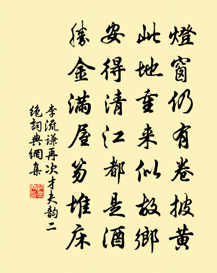 詩詞名句歷史字典書法欣賞書法字典國語詞典說文解字康熙字典古漢語字典標 題 作 者 詩 句 再次才夫韻二絕作者:李流謙 朝代:宋代再次才夫韻二絕原文燈窗仍有卷披黃,此地重來似故鄉。安得清江都是酒,勝金滿屋笏堆床。詩詞問答問:再次才夫韻二絕的作者是誰?答:李流謙問:再次才夫韻二絕寫於哪個朝代?答:宋代李流謙再次才夫韻二絕書法欣賞再次才夫韻二絕書法作品詩詞推薦徐仲修寄詩次韻何夢桂〔宋代〕一枕邯鄣午夢醒,好風吹信入軒欞。溟摶六月鵬先化,胎孕千年鶴已靈。氣囿陰陽元有數,道超天地妙無形。何時夏夜陳與義〔宋代〕虛庭散策晚涼生,斟酌星河亦喜晴。不記牆西有修竹,夜風還作雨來聲。泛湖十絕句陳造〔宋代〕荷面跳珠小濺衣,酒邊團扇已停揮。濕雲收盡人間暑,卻度西山載雨歸。將至漢川夜泊張耒〔宋代〕水翼飛棲定,連檣宿暝煙。葦風驚客夢,江月伴人眠。多病閒偏樂,苦吟愁易牽。漁郎爾何恨,終夕獨鳴舷。和陶淵明二十首陳造〔宋代〕海鄉亦好春,紅紫紛蕤英。黃鳥托庭柯,啁哳如有情。知我得碧濤,似勸花前傾。豈知好飲客,靜坐耐耳鳴。和范景仁王景彝殿中雜題三十八首並次韻其十梅堯臣〔宋代〕重說已經旬,應懷獨寢人。通宵彈玉枕,白晝拂床塵。幾想迎雕輦,何當快倦身。門前車馬立,疑是角生輪。冬至夜發峽州舟中作范成大〔宋代〕舟中萬里行,燈下一陽生。不減在家好,都忘為旅情。霜乾風愈勁,雲淡月微明。況有詩兼酒,樽前莫問更。焚書坑章碣〔唐代〕竹帛煙銷帝業虛,關河空鎖祖龍居。坑灰未冷山東亂,劉項原來不讀書。金陵雜興二百首蘇泂〔宋代〕北門繚繞出東門,一處亭台酒一巡。景物欣欣樂知己,柳容花貌越精神。賦得花發上林王儲〔唐代〕東陸和風至,先開上苑花。穠枝藏宿鳥,香蕊拂行車。散白憐晴日,舒紅愛晚霞。桃間留御馬,梅處入胡笳。城郭太山吟陸機〔魏晉〕太山一何高。迢迢造天庭。峻極周已遠。曾雲郁冥冥。梁甫亦有館。蒿里亦有亭。幽塗延萬鬼。神房集百靈。長吟寄石溪何文季〔宋代〕龐老多年不入州,一竿危坐石溪頭。山中飽食魚羹飯,不博人間萬戶侯。雜曲歌辭。妾薄命武平一〔唐代〕有女妖且麗,裴回湘水湄。水湄蘭杜芳,采之將寄誰。瓠犀發皓齒,雙蛾顰翠眉。紅臉如開蓮,素膚若凝脂。綽約喜遷鶯(即鶴沖天)韋莊〔唐代〕人洶洶,鼓冬冬,襟袖五更風。大羅天上月朦朧,騎馬上虛空。香滿衣,雲滿路,鸞鳳繞身飛舞。霓旌絳節一群群行住坐臥三十二頌釋印肅〔宋代〕扁鵲盧醫速退邊,大家飽吃普庵圓。解冤釋結消諸病,感應無方不用錢。赴章陵酬李卿贈別錢起〔唐代〕一官叨下秩,九棘謝知音。芳草文園路,春愁滿別心。乙丑元日壽昌拜表陳杰〔宋代〕盛服黎明起,瞻天咫尺東。舒遲寅出日,清淑艮來風。陰盡恰亭午,景長疑再中。初元調玉燭,勉勉聖神功。宮詞宋白〔宋代〕春來車駕入西都,父老千人拜路隅。潛問馬嵬端正樹,枝條猶似舊家無。比干墓汪遵〔唐代〕國亂時危道不行,忠賢諫死勝謀生。一沉冤骨千年後,壟水雖平恨未平。勉時思王和尚留李曾伯〔宋代〕面壁瓶者十年,瓶桑下者一瓶宿。時止瓶則止行則行,可久則久速則速。時思老子苦硬人,孤雲其身心槁木。三年名句推薦精衛銜微木,將以填滄海。陶淵明《讀山海經·其十》 佳期悵何許,淚下如流霰謝朓《晚登三山還望京邑》 年年今夜,月華如練,長是人千里。范仲淹《御街行·秋日懷舊》 黃鶯不語東風起,深閉朱門伴舞腰。溫庭筠《楊柳八首·其三》 雖至親亦忍絕,縱為惡亦不讓。來俊臣《羅織經·事上卷第二》 王者以民為天,而民以食為天。班固《漢書·傳·酈陸朱劉叔孫傳》 天下英雄誰敵手?曹劉。生子當如孫仲謀辛棄疾《南鄉子·登京口北固亭有懷》 己有能,勿自私。人所能,勿輕訾。李毓秀《弟子規·泛愛眾》 荒村帶返照,落葉亂紛紛。劉長卿《碧澗別墅喜皇甫侍御相訪》 空山梵唄靜,水月影俱沉。納蘭性德《水調歌頭·題西山秋爽圖》