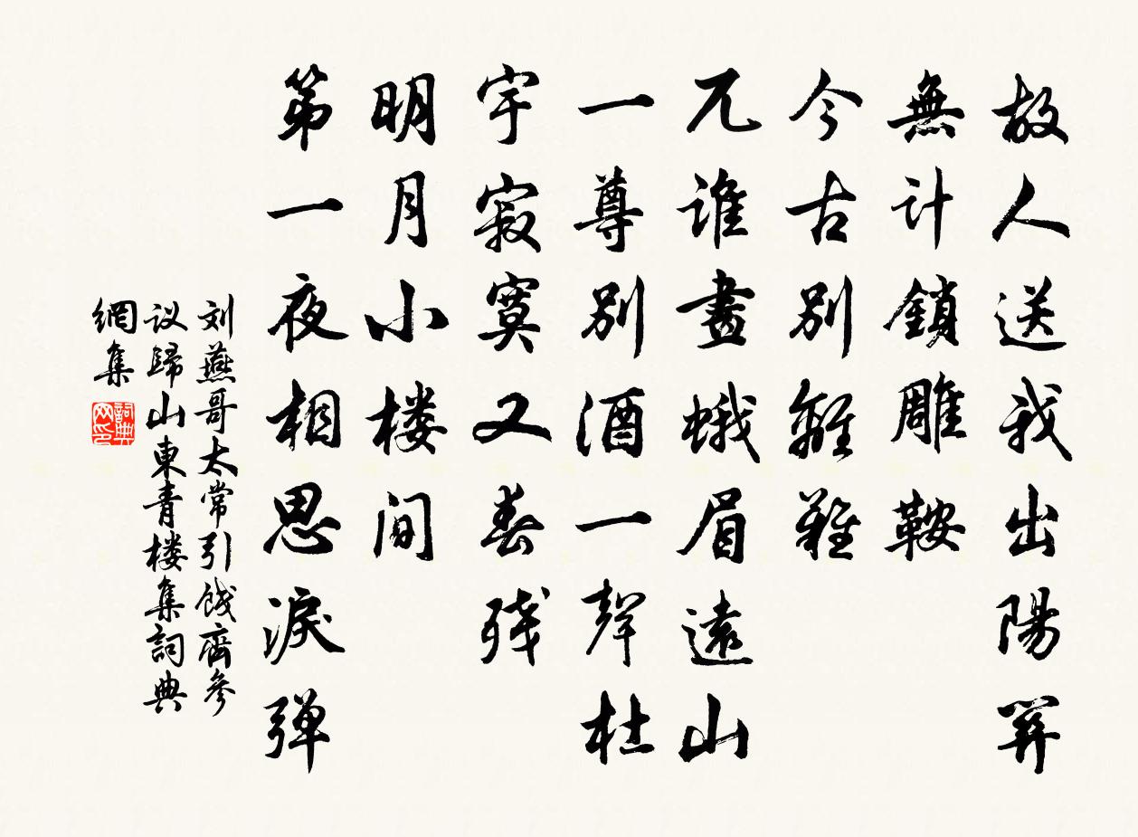 詩詞名句歷史字典書法欣賞書法字典國語詞典說文解字康熙字典古漢語字典標 題 作 者 詩 句 太常引 餞齊參議歸山東 青樓集作者:劉燕哥 朝代:元代原文故人送我出陽關。無計鎖雕鞍。今古別離難。兀誰畫、蛾眉遠山。一尊別酒,一聲杜宇,寂寞又春殘。明月小樓間。第一夜、相思淚彈。詩詞問答問:《太常引 餞齊參議歸山東 青樓集》的作者是誰?答:劉燕哥問:該詩寫於哪個朝代?答:元代問:該詩是什麼體裁?答:詞書法欣賞太常引 餞齊參議歸山東 青樓集書法作品注釋①陽關:泛指送別之地。②鎖雕鞍:意謂留住。詩詞推薦題金山寺石堂李群玉〔唐代〕白波四面照樓台,日夜潮聲繞寺回。千葉紅蓮高會處,幾曾龍女獻珠來。錢塘贈武翊黃章孝標〔唐代〕曾將心劍作戈矛,一戰名場造化愁。花錦文章開四面,天人科第上三頭。鴛鴻待侶飛清禁,山水緣情住外州。時伴橫浦十詠湛泉劉黻〔宋代〕境僻遠塵跡,湛然風雨林。一泉通地脈,千古照人心。灌菊增花蘤,煎茶得味深。石渠才此爾,誰向道山尋。次韻吳帥卿宴高年二首劉克莊〔宋代〕禮重耆年與令名,由來椿菌異枯榮。卑辭昔有迎商皓,字畫今誰寫洛英。應共蓋公談治道,素知嚴醜富□情。可憐送二友游湘中黃滔〔唐代〕千里楚江新雨晴,同征肯恨跡如萍。孤舟泊處聯詩句,八月中旬宿洞庭。為客早悲菸草綠,移家晚失岳峰青。今來築城三首曹鄴〔唐代〕郎有蘼蕪心,妾有芙蓉質。不辭嫁與郎,築城無休日。嗚嗚啄人鴉,軋軋上城車。力盡土不盡,得歸亦無家。築人暮春陳宓〔宋代〕蘭亭明日禊餘春,風冷難回積雨雲。不惜芳菲倦遊賞,雅宜竹下閉門人。謝吳子與惠詩艾性夫〔宋代〕解後西風野菊黃,別來冉冉歷三霜。未償詩債如山重,曾結交盟引夢長。老病終年親藥裹,清談何日倒書囊。聞君夢芙蓉朱彝尊〔清代〕日長深院裡,見微吟紅豆,學書青李。鼠須散卓,曾付掃眉翠,綠紗風不起,爐煙都篆心字。。密締星期,許支機次韻婺州蕭教授見寄林季仲〔宋代〕不到雙溪久,渾疑一夢間。把君詩在手,見我別來山。薄宦故不惡,危塗難自閒。翩翩出林翼,飛倦合知還。水調歌頭曾布〔宋代〕義城元靖賢相國,喜慕英雄士,賜金繒。聞斯事,頻嘆賞,封章歸印。請贖馮燕罪,日邊紫泥封詔,闔境赦深刑。題緱山王子晉廟鄭畋〔唐代〕有昔靈王子,吹笙溯泬 。六宮攀不住,三島去相招。亡國原陵古,賓天歲月遙。無蹊窺海曲,有廟訪山椒。石帳枇杷花董嗣杲〔宋代〕種接他枝宿土乾,花開抵得北風寒。蛹須負雪疑蜂蟄,毛葉粘霜若蝟攢。蕤破極冬懸蠟蒂,果收初夏摘金丸。凍香題太平興國官宋德之〔宋代〕殷勤此別幾時還,結足應須岩洞音。卒歲在家貧亦好,何人似我老來閒。九天使者邀歸艇,五嶽丈人分半山。已是喜雨口號九首呈潘侯劉克莊〔宋代〕雖擁朱幡只澤臞,孕魚丹荔免苞苴。未應旱魃無分別,更把秋陽懊惱渠。送別曹封叔曹勛〔宋代〕華宗豐度藹長雲,一笑相逢契懶真。豈但金蘭如舊分,固應俞扁是前身。久為輦轂緇塵客,欲趁龍園茗碗春。顧我秘書省冬夜宿直寄懷李德素黃庭堅〔宋代〕曲肱驚夢寒,皎皎人牖下。出門問何祥,岑寂省中夜。姮娥攜青女,一笑粲萬瓦。懷我金玉人,幽獨秉大雅。古來挽龔致政二首李曾伯〔宋代〕繡節榮分使,斑衣喜拜親。方將昌厥後,豈必在其身。其館仙遊遠,佳城瑞氣新。九原看厚報,袞袞耀絲綸。發金陵折柳亭二首張耒〔宋代〕桃李蕃晴日,江山秀晚春。孤舟多病客,長道未歸人。豪俗競行樂,倦遊慵問津。南山還暮雨,疑有楚台神。滿江紅周紫芝〔宋代〕寂寂江天,雪又滿、晚來風急。空懊恨、散鹽飛絮,未成輕集。萬里長空飛不到,珠簾卷盡還羞入。問向晚、誰欲名句推薦何期今日酒,忽對故園花。文森《九日》 盪而失水,螻蟻得意焉。韓非及後人《韓非子·說林下》 悵恨不逢如意酒。尋思難值有情人。晏幾道《浣溪沙·閒弄箏弦懶系裙》 一去無訊息,那能惜馬蹄。薛道衡《昔昔鹽》 春去花還在,人來鳥不驚。王維《畫》 長江悲已滯,萬里念將歸。王勃《山中》 死別已吞聲,生別常惻惻。杜甫《夢李白二首·其一》 霜降碧天靜,秋事促西風。葉夢得《水調歌頭·九月望日與客習射西園余偶病不能射》 窮冬烈風,大雪深數尺,足膚皸裂而不知。宋濂《送東陽馬生序》 以人言善我,必以人言罪我。韓非及後人《韓非子·說林上》