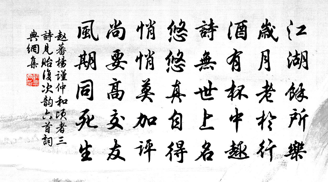 詩詞名句歷史字典書法欣賞書法字典國語詞典說文解字康熙字典古漢語字典標 題 作 者 詩 句 楊謹仲和頃者三詩見貽複次韻六首作者:趙蕃 朝代:宋代原文江湖余所樂,歲月老於行。酒有杯中趣,詩無世上名。悠悠真自得,悄悄莫加評。尚要高交友,風期同死生。詩詞問答問:《楊謹仲和頃者三詩見貽複次韻六首》的作者是誰?答:趙蕃問:該詩寫於哪個朝代?答:宋代書法欣賞楊謹仲和頃者三詩見貽複次韻六首書法作品詩詞推薦寄題知儀州太保蒲中書齋梅堯臣〔宋代〕中條插遠近,黃河瀉直斜。蒲坂之城在其涯,渠渠碧瓦十萬家。官商工農共擾擾,侯獨理齋窗照紗。侯方守邊聽胡憶宛陵舊居許棠〔唐代〕舊憶陵陽北,林園近板橋。江晴帆影滿,野迥鶴聲遙。島徑通山市,汀扉上海潮。秦城歸去夢,夜夜到漁樵。雲間閣留題壁間張垓〔宋代〕清江一曲抱村流,古柏千莖繞徑幽。天畔峰巒俱秀峙,壁間珠玉爛凝眸。遙觀細菊重岩下,共作攜壺九口游。回首春日即事吳晦之〔宋代〕山居無事到襟懷,日午柴門尚未開。啼鳥一聲春晝寂,隔牆風送落花來。萱草晁說之〔宋代〕山中萱草三赤長,山中高人萬事忘。欲借忘憂汝輩力,世間兒女徒顛狂。汝亦忘憂非世憂,臨風恐汝亦分將。願爾上政府五首郭印〔宋代〕塞上煙塵永不揚,邊民戌卒盡耕桑。抗言用武真非策,唾手扶危別有方。須信精誠能感格,由來道德本安強。恩沾迎善財歸南樓釋梵琮〔宋代〕古寺閒房共掩扉,相逢彼此罷參歸。時難只得同香火,莫信閒人說是非。呈陸嚴州五首趙蕃〔宋代〕往游金陵都,始攀石湖仙。為我談公詩,大雅後有焉。謂我欠公詩,勉哉成其天。此語久不理,今朝墮公前。泊舟浮石寺前有善士百餘輩拜迎因聯句於水濱白玉蟾〔宋代〕三百六旬周復始,二十四岸高且寒。法乳試流鋒上蜜,詩腸畧露管中班。山山日腳黃金軟,片片梅心白雪乾。遙指飲散夜歸贈諸客白居易〔唐代〕鞍馬夜紛紛,香街起暗塵。回鞭招飲妓,分火送歸人。風月應堪惜,杯觴莫厭頻。明朝三月盡,忍不送殘春。秋懷五首鮑溶〔唐代〕促促生有涯,營營意無限。無限意未申,有涯生已晚。恩榮不可恃,天道歸寸管。老如影隨人,時若車下坂。行者頌古四十五首釋如珙〔宋代〕是定出得不得,關捩初無多子。文殊神通太過,罔明輕輕彈指。次韻李子永見慶新居韓元吉〔宋代〕旋移桐樹占高岡,更喜松筠翠作行。檐外參差見林影,門前溶漾足溪光。天涯留落還相識,地上經營豈太忙。好事長門怨(一作長信宮)李端〔唐代〕金壺漏盡禁門開,飛燕昭陽侍寢回。隨分獨眠秋殿里,遙聞語笑自天來。人壽釋文珦〔宋代〕人壽百年三萬日,有誰曾滿百年來。騰騰任運聊堪樂,汩汩勞生盡可哀。富貴惟增身外累,酕醄當覆掌中杯。到頭上章納祿恩畀外祠遂以五月初東歸陸游〔宋代〕身是風前一斷蓬,經年竊食竟何功?倚天青嶂迎船出,撲馬紅麈轉眼空。網戶餉魚勝丙穴,旗亭送酒等郫筒。死前天台梵才師長吉在都數以詩筆見授因答以轉句宋祁〔宋代〕九霞凝標倚霄極,爾時師在雲岩側。坐中不起見諸方,滿祴天香嗅薝蔔。竹枝詞二首·其一劉禹錫〔唐代〕楊柳青青江水平,聞郎江上踏歌聲。(踏歌聲 一作:唱歌聲)東邊日出西邊雨,道是無晴卻有晴。(卻有晴 一南池賈島〔唐代〕蕭條微雨絕,荒岸抱清源。入舫山侵塞,分泉稻接村。秋聲依樹色,月影在蒲根。淹泊方難遂,他宵關夢魂。霪雨方岳〔宋代〕朝雨暮雨不肯晴,昏昏冥冥如翳塵。舍有連月汗流礎,道傍前日泥埋輪。東南地傾水所匯,潮汐沙擁江之漘。埧頭名句推薦風遞幽香出,禽窺素艷來。齊己《早梅》 那裡是清江江上村,香閨里冷落誰瞅問?好一個憔悴的憑欄人。關漢卿《大德歌·冬》 足以充虛繼氣,強股肱,耳目聰明,則止。墨子《墨子·21章 節用(中)》 樓前綠暗分攜路,一絲柳、一寸柔情。吳文英《風入松·聽風聽雨過清明》 飛花兩岸照船紅,百里榆堤半日風。陳與義《襄邑道中》 禮者,人道之極也。荀子《荀子·禮論》 道本足於身,切實求來,則常若不足矣王永彬《圍爐夜話·第一一三則》 河海不擇細流,故能就其深;李斯《諫逐客書》 欲知方寸,共有幾許清愁,芭蕉不展丁香結。賀鑄《石州引·薄雨初寒》 昨夢西湖,老扁舟身世。吳文英《拜星月慢·林鐘羽姜石帚以盆蓮數十置中庭宴客其中》