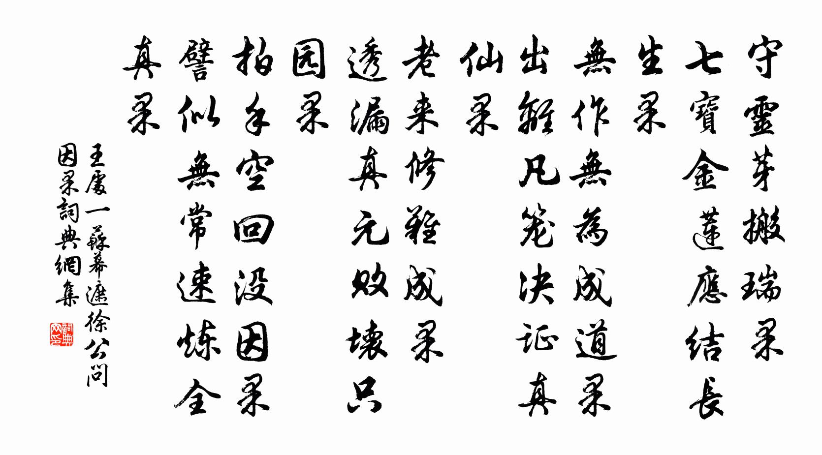 詩詞名句歷史字典書法欣賞書法字典國語詞典說文解字康熙字典古漢語字典標 題 作 者 詩 句 蘇幕遮 徐公問因果作者:王處一 朝代:元代蘇幕遮 徐公問因果原文守靈芽,搬瑞果。七寶金蓮,應結長生果。無作無為成道果。出離凡籠,決證真仙果。老來修,難成果。透漏真元,敗壞只園果。拍手空回沒因果。譬似無常,速煉全真果。詩詞問答問:蘇幕遮 徐公問因果的作者是誰?答:王處一問:蘇幕遮 徐公問因果寫於哪個朝代?答:元代問:蘇幕遮 徐公問因果是什麼體裁?答:詞王處一蘇幕遮 徐公問因果書法欣賞蘇幕遮 徐公問因果書法作品詩詞推薦送李殿丞通判處州梅堯臣〔宋代〕拜官將近親,不畏千里險。泝流上贛水,石亂波驚颭。舟人素已諳,曲折就回閃。豈虞失便利,倚慣憂亦掩。昔余勸耕神堂快活林吳則禮〔宋代〕小雨尚復連清明,晴鳩撩我爭喚晴。余寒不奈殘春酒,遲日初斜細柳營。黑貂強脫行作吏,白髮渾生來勸耕。樹底同衛八題陸少府書齋高適〔唐代〕知君薄州縣,好靜無冬春。散帙至棲鳥,明燈留故人。深房臘酒熟,高院梅花新。若是周旋地,當令風義親。無調名 以上三首原誤作臨江仙王哲〔元代〕昌時須默默,清徹名澄。總棄總無能。軒好景,便依登。趙州茶味好,悟曉如冰。雲友與霞朋。分別得,正升騰。敬亭道中方岳〔宋代〕小謝曾臨郡,山應自識詩。空餘春草夢,無復敬亭碑。暝色如相覓,秋雲不受吹。買魚尋宿處,煙水有茅茨。蟬雍陶〔唐代〕高樹蟬聲入晚雲,不唯愁我亦愁君。何時各得身無事,每到聞時似不聞。至溫州文天祥〔宋代〕萬里風霜鬢已絲,飄零回首壯心悲。羅浮山下雪來未,揚子江心月照誰。只謂虎頭非貴相,不圖羝乳有歸期。乘潮雜詠四首王安石〔宋代〕已作湖陰客,如何更遠遊。章江昨夜月,送我到揚州。霪雨方岳〔宋代〕朝雨暮雨不肯晴,昏昏冥冥如翳塵。舍有連月汗流礎,道傍前日泥埋輪。東南地傾水所匯,潮汐沙擁江之漘。埧頭訪懷遇師林表民〔宋代〕獨隱重岩里,全無物役心。禪因秋月悟,詩對晚雲吟。訪古猿驚錫,拋生鳥上林。相知今十載,不憚遠來尋。菩薩蠻(採蓮女)王之道〔宋代〕藕絲衫剪輕紅窄。衫輕不礙瓊膚白。縵鬢小橫波。花樓東是家。上湖閒蕩槳。粉艷芙蓉榜。湖水亦多情。照妝天底蜀公范景仁忠文公輓辭四首蘇頌〔宋代〕雅麗文園令,深湛揚大夫。初為蜀詞客,終作漢真儒。榮遇封公爵,歸休職禁塗。逢時致君事。自與二賢殊。元夕立春喜晴於是郡人久不出矣葉適〔宋代〕艾褐家紬闊闊裁,抱孫攜子看燈來。余甘暫棄從教覓,莫斗機心漫自猜。次韻吳僧魁一山十絕方回〔宋代〕高安僧寶姚圓至,鹽水誰其成醬冰。莫為猢猻打筋斗,回頭不記讀書燈。題韓乾馬高翔〔宋代〕渴烏項領紫駝峰,跑地求泉鬣上沖。不敢牽來向江水,預防踴躍學蛟龍。送友人之括蒼薛嵎〔宋代〕石門當半道,想見泊舟時。伴鶴立終日,就岩題幾詩。近山秋易老,問隱地偏宜。我亦江湖去,心期爾得知。小軒窠石史彌寧〔宋代〕密傍軒窗開小池,巧安窠石俯清漪。道人不愛閒花草,祗種瓶蕉和水梔。苦晝短李賀〔唐代〕飛光飛光,勸爾一杯酒。吾不識青天高,黃地厚。唯見月寒日暖,來煎人壽。食熊則肥,食蛙則瘦。神君何在,太鷓鴣天 戲題村舍辛棄疾〔宋代〕雞鴨成群晚不收,桑麻長過屋山頭。有何不可吾方羨,要底都無飽便休。新柳樹,舊沙洲,去年溪打那邊流。自言聞參政王侍郎令子著作登第復除崇文校書強至〔宋代〕宮壺移刻對延英,文帝從容問賈生。儒館旋承恩詔入,士林尤說御批榮。丹山鳳出寧無種,滄海鵬摶遂有程。漸待名句推薦一點殘紅欲盡時。乍涼秋氣滿屏幃。周紫芝《鷓鴣天·一點殘紅欲盡時》 歲寒,然後知松柏之後凋也。孔子弟子《論語·子罕篇》 顧謂戚夫人,彼翁羽翼成。李白《山人勸酒》 誰見汀洲上,相思愁白蘋。劉長卿《餞別王十一南遊》 山重水複疑無路,柳暗花明又一村。陸游《游山西村》 昔有佳人公孫氏,一舞劍器動四方。杜甫《觀公孫大娘弟子舞劍器行》 知而弗為,莫如勿知;親而弗信,莫如勿親。佚名《孔子家語·子路初見》 天將暮,雪亂舞,半梅花半飄柳絮。馬致遠《壽陽曲·江天暮雪》 河海不擇細流,故能就其深;李斯《諫逐客書》 得饒人處且饒人。曹雪芹《紅樓夢·第五十九回》