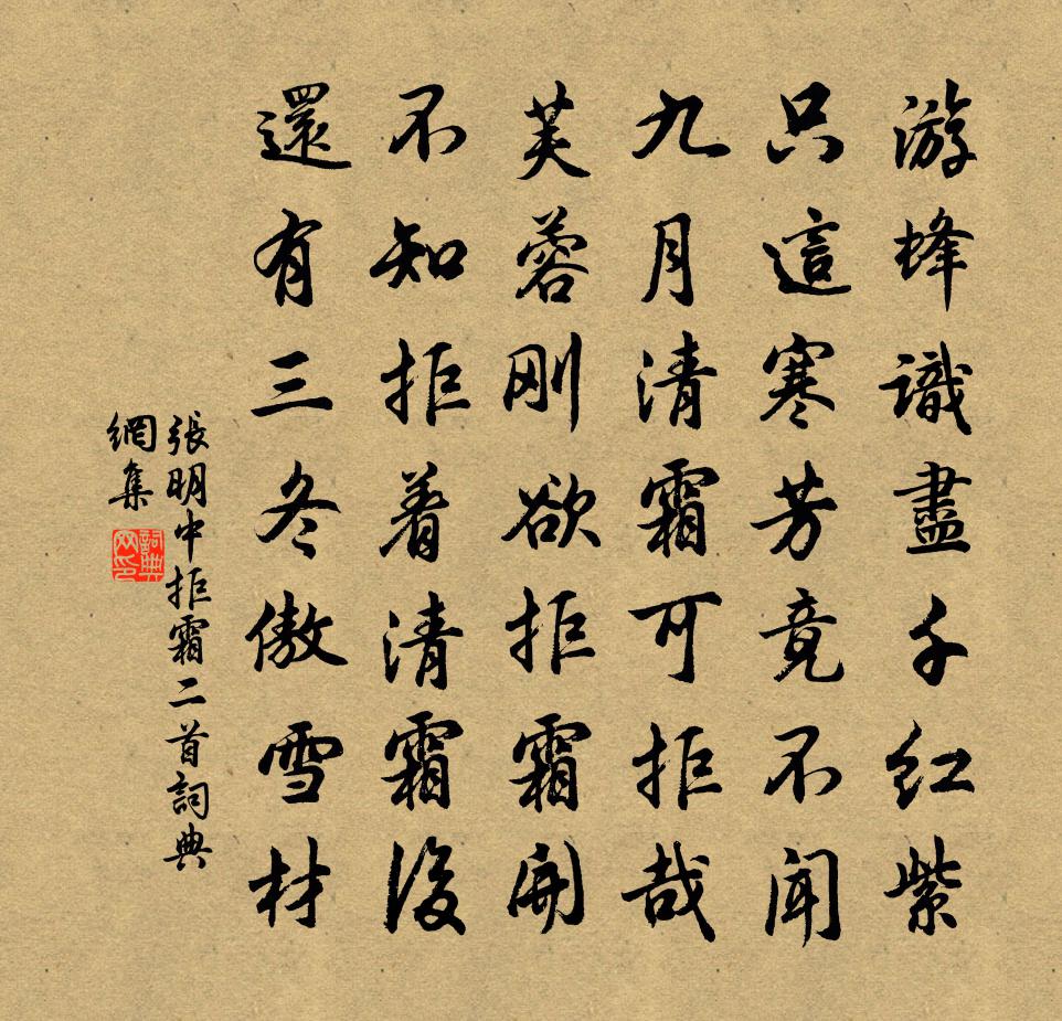 詩詞名句歷史字典書法欣賞書法字典國語詞典說文解字康熙字典古漢語字典標 題 作 者 詩 句 拒霜二首作者:張明中 朝代:宋代拒霜二首原文游蜂識盡千紅紫,只這寒芳竟不聞。九月清霜可拒哉,芙蓉剛欲拒霜開。不知拒著清霜後,還有三冬傲雪材。詩詞問答問:拒霜二首的作者是誰?答:張明中問:拒霜二首寫於哪個朝代?答:宋代張明中拒霜二首書法欣賞拒霜二首書法作品詩詞推薦蝶戀花 送春何可視〔元代〕金井啼鴉深院曉。*盡東風,柳絮吹難了。燕子多情相識早。杏梁依舊雙雙到。一縷沉煙簾幕悄。滿眼飛花,只覺偈頌一百四十一首釋師範〔宋代〕天上星,地下木。見便見,休□速。老瞿曇,空捏目。三七日,心返復。從此拿空便脫空,天上人間遍流毒。帶累頌古一百則釋正覺〔宋代〕一倒一起,雪庭師子。慎於犯而懷仁,勇於為而見義。清光照眼似迷家,明白轉身還墮位。衲僧家,了無寄,同死客至 [一作許渾詩]趙嘏〔唐代〕得路逢津更俊才,可憐鞍馬照春來。殘花幾日小齋閉,大笑一聲幽抱開。袖拂碧溪寒繚繞,冠欹紅樹晚徘徊。相逢婦女之孝二十首孔融女林同〔宋代〕不憂身即死,惟恐死無知。儻得從父母,寧非我所期。六月十八日立秋未旦起行山園口占陸游〔宋代〕北斗離離柄漸西,披衣出戶聽晨雞。豈惟蒲柳先搖落,坐覺風雲已慘淒。斷簡不妨重料理,清樽隨處可提攜,穿林踏莎行譚處端〔元代〕忍辱常餐,永除濁酒,洗心滌意忘諸有。存存損損了空虛,安安穩穩無他走。靜靜清清,天長地久。春花秋月堅堅和子由四首 首夏官舍即事蘇軾〔宋代〕安石榴花開最遲,絳裙深樹出幽菲。吾廬想見無限好,客子倦遊胡不歸。坐上一樽雖得滿,古來四事巧相違。令人奉陪鄭中丞自宣州解印,與諸侄宴餘乾後溪劉長卿〔唐代〕跡遠親魚鳥,功成厭鼓鼙。林中阮生集,池上謝公題。戶牖垂藤合,藩籬插槿齊。夕陽山向背,春草水東西。度雨秋懷十首以竹藥閉深院琴樽開小軒為韻陸游〔宋代〕短裘入重雲,長鑱求靈藥。人葠四體具,狗杞群吠惡。采實去條枚,摘花棄跗萼。長嘯忽躡空,天台赴幽約。地黃蘇軾〔宋代〕地黃飼老馬,可使光鑒人。吾聞樂天語,喻馬施之身。我衰正休櫪,垂耳氣不振。移栽附沃壤,蕃茂爭新春。瀋水宮詞楊皇后〔宋代〕銀燭瑤觥競上元,□□午月正當軒。棚頭所喚歌新曲,宛轉餘音出紫垣。詔取永豐柳植禁苑感賦白居易〔唐代〕一樹衰殘委泥土,雙枝榮耀植天庭。定知玄象今春後,柳宿光中添兩星。峽山寺竹枝詞五首楊萬里〔宋代〕一灘過了一灘奔,一石橫來一石蹲。若怨古來天設險,峽山不到也由君。慶壽光晁端禮〔宋代〕丹扆疏恩,慶闈受命,聖朝廣孝非常。大邑高封,名兼壽考輝光。閭巷相傳盛事,煥絲五色成章。崇新棟,天語榮少年游(十之七·林鐘商)柳永〔宋代〕簾垂深院冷蕭蕭。花外漏聲遙。青燈未滅,紅窗閒臥,魂夢去迢迢。薄情漫有歸訊息,鴛鴦被、半香消。試問伊家幽居歲暮陸游〔宋代〕燃薪代秉燭,煮茗當傳杯。但恨朋儕少,那知日月催。衣裘任穿穴,芋栗且燔煨。不為殘年迫,吾心久矣灰。錢塘江待潮胡仲弓〔宋代〕潮至千艘動,濤喧萬鼓鳴。江翻晴雪卷,海漲石塘平。帆影林端見,波光屋上明。青山自吳越,相峙兩含情。任居雲棲枝閣文同〔宋代〕峨峨仙鸞山,杳杳山上閣。道傍問耕者,居雲之所作。居雲倜儻士,韁鎖不可縛。讀書三十年,議論寫不涸。縱橫重到毓村宅有感白居易〔唐代〕欲入中門淚滿巾,庭花無主兩回春。軒窗簾幕皆依舊,只是堂前欠一人。名句推薦浪花有意千里雪,桃花無言一隊春。李煜《漁父·浪花有意千里雪》 我閉南樓看道書,幽簾清寂在仙居。李白《早秋單父南樓酬竇公衡》 江上月明胡雁過,淮南木落楚山多。劉長卿《江州重別薛六柳八二員外》 將在外,君命有所不受畢沅《續資治通鑑·元紀·元紀三十》 憐夜冷孀娥,相伴孤照。吳文英《花犯·謝黃復庵除夜寄古梅枝》 仗酒祓清愁,花銷英氣姜夔《翠樓吟·淳熙丙午冬》 蠶無夏織桑充寨,田廢春耕犢勞軍。杜荀鶴《題所居村舍》 碧蕪千里思悠悠,惟有霎時涼夢、到南州。李廌《虞美人·玉闌乾外清江浦》 桃花流水窅然去,別有天地非人間。李白《山中問答》 香爐瀑布遙相望,回崖沓嶂凌蒼蒼。李白《廬山謠寄盧侍御虛舟》