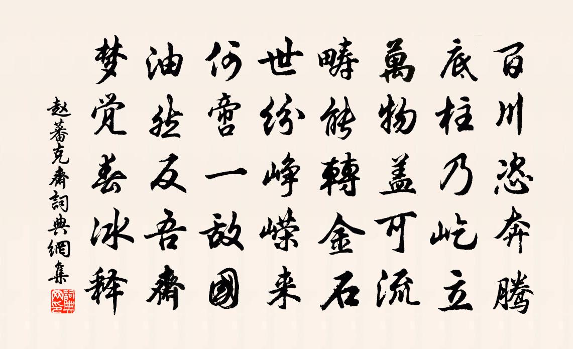 詩詞名句歷史字典書法欣賞書法字典國語詞典說文解字康熙字典古漢語字典標 題 作 者 詩 句 克齋作者:趙蕃 朝代:宋代克齋原文百川恣奔騰,底柱乃屹立。萬物蓋可流,疇能轉金石。世紛崢嶸來,何啻一敵國。油然反吾齋,夢覺春冰釋。詩詞問答問:克齋的作者是誰?答:趙蕃問:克齋寫於哪個朝代?答:宋代趙蕃克齋書法欣賞克齋書法作品詩詞推薦又用前韻賦夜坐方回〔宋代〕酒醒招得醉魂歸,深護爐熏鍵夕扉。渴舌惡甜勤漱茗,癯肩耐凍懶添衣。頗聞空暗無星出,小待更深定雪飛。一字西江月(席上呈子華)韓維〔宋代〕早歲相期林下,高年同在尊前。風花繡舞乍晴天。綠蟻新浮酒面。身外虛名電轉,人間急景梭傳。當筵莫惜聽朱弦倚樓陸游〔宋代〕減盡朱顏白髮新,高樓徙倚默傷神。未酬馬上功名願,已是人間老大身,太史周南方臥疾,拾遺劍外又逢春。一杯前檻十二韻楊億〔宋代〕前檻瓊鉤掛,深房斗帳褰。梨花飛白雪,蕙草吐青煙。彩鳳依珠樹,神龍護玉蓮。驚禽時格磔,戲蝶自翩翾。度繡示李叔時二首王安石〔宋代〕千山訪我幾摧輈,清坐來看十日留。勢利白頭何足道,古人傾蓋有綢繆。王御史野塘圖歌方回〔宋代〕野塘之水兮其色油油,以畜以泄兮灌我良疇。弋有鳧雁兮盟有鷗,我出而仕兮可則進,脫如不可兮還我鋤耰。水之浪淘沙晏幾道〔宋代〕翠幕綺筵張,淑景難忘。陽關聲巧繞雕梁。美酒十分誰與共,玉指持觴。曉枕夢高唐,略話衷腸。小山池院竹風涼鹽倉作呈叔能同官葛立方〔宋代〕平生懶作子公書,俯首銓曹一紀余。第有神馳招隱館,久無夢到承明廬。文字真宜覆醬瓿,技能只合服鹽車。清才雜詠黃庚〔宋代〕柳嫌暮雨鶯聲澀,花怯東風蝶夢寒。偶憶故園春色好,他鄉花柳帶愁看。驀山溪(北觀避暑次明叔韻)李之儀〔宋代〕金柔火老,欲避幾無地。誰借一檐風,鎖幽香、愔愔清邃。瑤階珠砌,如膜遇金篦,流水外,落花前,豈是人能致荊州賊平,臨洞庭言懷作李白〔唐代〕修蛇橫洞庭,吞象臨江島。積骨成巴陵,遺言聞楚老。水窮三苗國,地窄三湘道。歲晏天崢嶸,時危人枯槁。思歸嘉禾頌七章章四句吳泳〔宋代〕維昔唐叔,實施王命。伊今之人,惟唐叔是景。寄方岩高翥〔宋代〕綠髮仙人山澤癯,出遊入息幾曾拘。種花甚少四時有,諫草不多千古無。閱世眼高曆日月,好賢名重滿江湖。行藏發金陵折柳亭二首張耒〔宋代〕匆匆十日事,回首亦淒涼。何處無芳草,行人休斷腸。以魯直露溼何郎試湯餅為韻賦酴醿七首舒邦佐〔宋代〕金沙與同架,並蔕更連柯。紅白雖相宜,品藻當如何。過湍溝谷許棠〔唐代〕西去窮胡處,岩崖境不常。石形相對聳,天勢一條長。棧底鳴流水,林端斂夕陽。雖隨兵馬至,未免畏豺狼。濠梁感懷梅堯臣〔宋代〕天子昔封禪,吾叔從金輿。回首泰山下,出建雙隼旟。來尋觀魚台,遂遠承明廬。當時十五詠,螢照墨石書。漫成寄朱伯海主簿曹彥約〔宋代〕幸拜恩綸強自寬,窮居寒土忝微官。風霜迢遞逾千里,晨夕間關歷萬端。一片山城常寂寞,幾宵燈火憶團欒。當年梅花繆鑒〔宋代〕鐵石槎牙玉粒姿,詩中圖書中詩。半稜山色初晴後,一截豀煙吹欲暝時。流水帶雲棲瘦影,小窗和月上橫枝。老來遣興陸游〔宋代〕湖海元為汗漫遊,誤恩四領幔亭秋。掃空薄祿始無媿,閉上衡門那得愁?湯嫩雪濤翻茗碗,火溫香縷上衣篝。床頭名句推薦布衣得暖真為福,千金平安即是春。佚名《增廣賢文·下集》 窣地春袍,嫩色宜相照。梅堯臣《蘇幕遮·草》 宴爾新婚,以我御窮。佚名《谷風》 石欄斜點筆,桐葉坐題詩杜甫《重過何氏五首》 食必常飽,然後求美;衣必常暖,然後求麗;居必常安,然後求樂劉向《說苑·反質》 諸君才絕世,獨步許誰強妙信《九日酬諸子》 新帖繡羅襦,雙雙金鷓鴣。溫庭筠《菩薩蠻·小山重疊金明滅》 雨恨雲愁,江南依舊稱佳麗。王禹偁《點絳唇·感興》 中人以上,可以語上也;中人以下,不可以語上也。孔子弟子《論語·雍也篇》 亂世用能,平則去患。來俊臣《羅織經·控權卷第四》