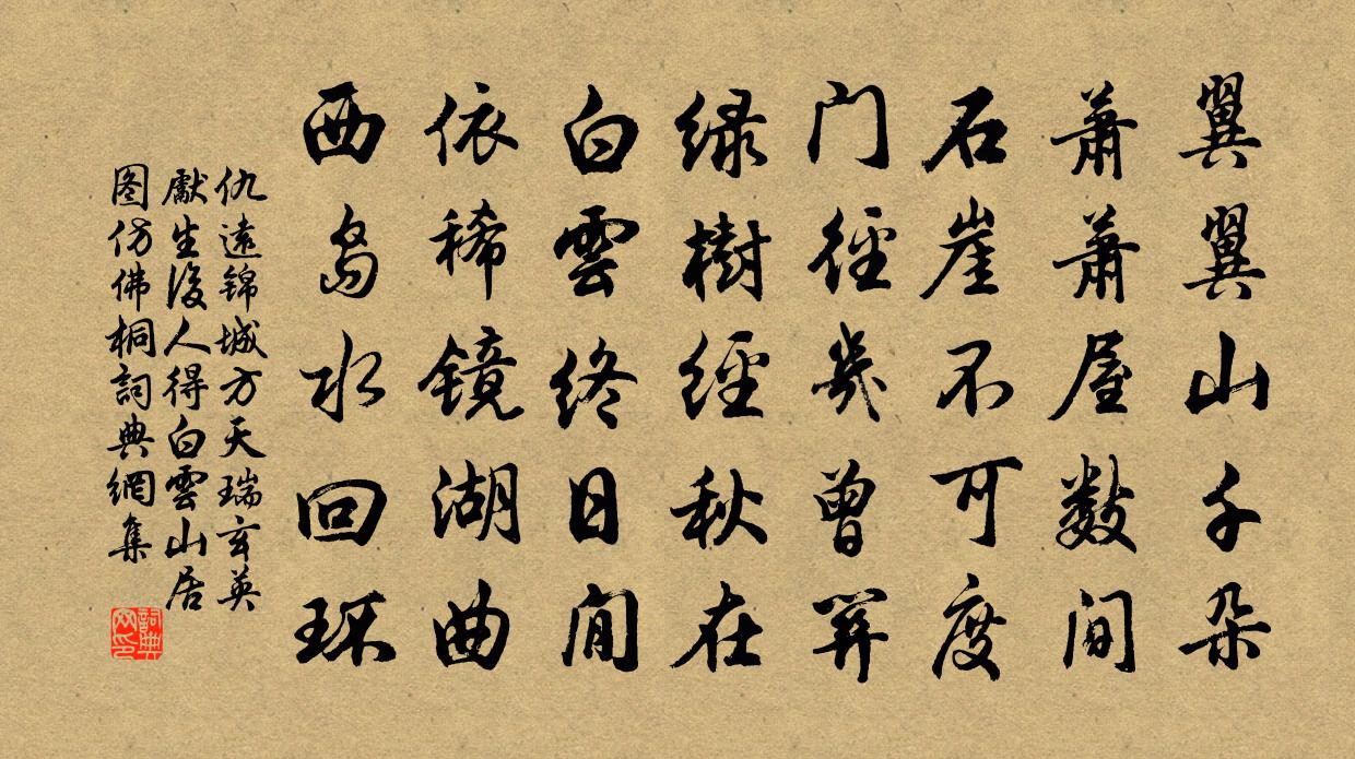 詩詞名句歷史字典書法欣賞書法字典國語詞典說文解字康熙字典古漢語字典標 題 作 者 詩 句 錦城方天瑞玄英先生後人得白雲山居圖仿佛桐作者:仇遠 朝代:宋代原文翼翼山千朵,蕭蕭屋數間。石崖不可度,門徑幾曾關。綠樹經秋在,白雲終日閒。依稀鏡湖曲,西島水迴環。詩詞問答問:《錦城方天瑞玄英先生後人得白雲山居圖仿佛桐》的作者是誰?答:仇遠問:該詩寫於哪個朝代?答:宋代書法欣賞錦城方天瑞玄英先生後人得白雲山居圖仿佛桐書法作品詩文賞析【原題】:錦城方天瑞玄英先生後人得白雲山居圖仿佛桐廬山中隱所錢舜舉真跡別有一種風致漫系以詩詩詞推薦次前韻謝袁提學及其弟府判二首方回〔宋代〕公家賢伯仲,似是晉機雲。黃卷丁年共,青燈午夜分。望風初魄動,飲德更心醺。自合登台省,官猶類廣文。初日照鳳樓李虞仲〔唐代〕旭日煙雲殿,朝陽燭帝居。斷霞生峻宇,通閣麗晴虛。流彩連朱檻,騰輝照綺疏。曈曨晨景里,明滅曉光初。戶牖安往寺道中舒岳祥〔宋代〕半村晴日烏鹽角,十里春豀雀李花。餅餌風來香冉冉,教人那得不思家。憶秦娥張孝祥〔宋代〕天一角。南枝向我情如昨。情如昨。水寒煙淡,霧輕雲薄。吹花嚼蕊愁無托。年華冉冉驚離索。驚離索。倩春留住青羊宮磚記佚名〔唐代〕太平平中元災。慶全庵桃花謝枋得〔宋代〕尋得桃源好避秦,桃紅又是一年春。花飛莫遣隨流水,怕有漁郎來問津。雜曲歌辭。少年行二首杜牧〔唐代〕官為駿馬監,職帥羽林兒。兩綬藏不見,落花何處期。獵敲白玉鐙,怒袖紫金鎚。田竇長留醉,蘇辛曲護岐。豪持蝦子贊釋梵琮〔宋代〕斗里跳出,手中捏定。不入水泥,喪卻性命。減字木蘭花黃庭堅〔宋代〕蒼崖萬仞。下有奔雷千百陣。自古危哉。誰遣西園漝麽來。猿啼雲杪。破夢一聲巫峽曉。苦喚愁生。不是西園作麽禪人並化主寫真求贊釋正覺〔宋代〕眉垂而楊,只默而方。了見源底,淨極發光。月魂排夜色,鬥氣濯秋霜。誰嫌眼上瞋生角,我道機前影不章。春晚晁說之〔宋代〕春晚何為尚絮袍,強尋樂事慰無聊。鍛聲不讓雨聲急,花影爭隨幡影高。莫問餱糧難卒歲,且無甲馬在今朝。書成贈張相鎬其二李白〔唐代〕本家隴西人。先為漢邊將。功略蓋天地。名飛青雲上。苦戰竟不侯。當年頗惆悵。世傳崆峒勇。氣激金風壯。英烈春意郊行黎廷瑞〔宋代〕卯酒醒來欲午天,意行平陸自悠然。近山欲雨有遠意,老樹得春還少年。蝶化不知何宇宙,蝸爭難到好林泉。令人頌古四十五首釋如珙〔宋代〕曲設多方驗作家,有誰親見老玄沙。耳聾口啞眼睛瞎,五濁眾生數似麻。含珠林釋鑒〔宋代〕風勁蕭蕭響,露滴個個圓。坐看西山月,渾疑墮我前。與羅教授飯園中種梔子朱翌〔宋代〕園木交陰正可觀,壺觴隨分卻成歡。綠錢流地雨當足,飛絮暖空春不寒。雪綴酴醾緣屋角,香移檐卜近欄乾。與君即事舒岳祥〔宋代〕麥熟南風掛衲畦,山禽快活曉來啼。中分草色柴車路,半壓藤花石步豀。茅屋數家深避馬,竹林三里遠聞雞。荒村回渡荷葉浦張鎡〔宋代〕宿雨驚眠變早涼,喜成負便放歸航。山雲野樹水墨暗,蘆葉荷花文繡香。藉枕冰藤醒倦思,打簾珠浪發清狂。天圍菩薩蠻·風柔日薄春猶早李清照〔宋代〕風柔日薄春猶早,夾衫乍著心情好。睡起覺微寒,梅花鬢上殘。故鄉何處是?忘了除非醉。瀋水臥時燒,香消酒未季札墓王冕〔元代〕識君因讀春秋傳,今日墳前見斷碑。大義可令吳俗變,高風不獨魯人知。劍光注壑生靈草,樹影懸空動羽旗。休問名句推薦玉梅消瘦,恨東皇命薄。汪元量《傳言玉女·錢塘元夕》 三杯吐然諾,五嶽倒為輕。李白《俠客行》 江海不擇小助,故能成其富。韓非及後人《韓非子·大體》 江南江北愁思,分付酒螺紅方岳《水調歌頭·平山堂用東坡韻》 春風只在園西畔。薺菜花繁胡蝶亂。嚴仁《玉樓春·春思》 樹曲木者,惡得直景劉向《說苑·君道》 露濕晴花春殿香,月明歌吹在昭陽。李益《宮怨》 試問鄉關何處是,水雲浩蕩迷南北。趙鼎《滿江紅·丁未九月南渡泊舟儀真江口作》 自見者不明;自是者不彰老子《老子·道經·第二十四章》 只願君心似我心,定不負相思意。李之儀《卜運算元·我住長江頭》