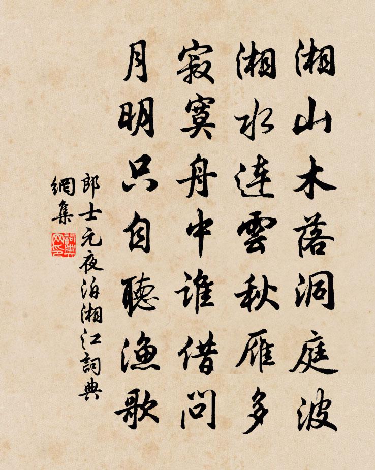 詩詞名句歷史字典書法欣賞書法字典國語詞典說文解字康熙字典古漢語字典標 題 作 者 詩 句 夜泊湘江作者:郎士元 朝代:唐代夜泊湘江原文湘山木落洞庭波,湘水連雲秋雁多。寂寞舟中誰借問,月明只自聽漁歌。詩詞問答問:夜泊湘江的作者是誰?答:郎士元問:夜泊湘江寫於哪個朝代?答:唐代問:夜泊湘江是什麼體裁?答:七絕郎士元夜泊湘江書法欣賞夜泊湘江書法作品注釋全唐詩:卷248_68詩詞推薦南歌子張先〔宋代〕醉後和衣倒,愁來殢酒醺。困人天氣近清明。盡日厭厭□臉、淺含顰。睡覺□□恨,依然月映門。楚天何處覓行雲任漕魯漕同謁史發運為廬阜之游恨不得偕行因吳芾〔宋代〕不向廬山久,回頭五十秋。羨君聯騎去,顧我幾時游。五老想如故,二林應更幽。無因陪後乘,神往但形留。木蘭花慢 和陳思濟 洞霄詩集卷九李德基〔元代〕訪仙家洞府,仰天柱,徹高寒。對百尺飛湍,四圍喬木,九鎖青山。危亭晚來極目,勝王維、三昧畫中看。何處朝贈常州院僧姚合〔唐代〕一住毗陵寺,師應只信緣。院貧人施食,窗靜鳥窺禪。古磬聲難盡,秋燈色更鮮。仍聞開講日,湖上少魚船。答謝家最小偏憐女(感元九悼亡詩,因為代答三首)白居易〔唐代〕嫁得梁鴻六七年,耽書愛酒日高眠。雨荒春圃唯生草,雪壓朝樹未有煙。身病憂來緣女少,家貧忘卻為夫賢。誰知沖雪至餘慶覺林雪連日不止陸游〔宋代〕策蹇清吟涉若耶,灞橋猶恨近京華。山前千頃誰種玉?座上六時天散花。林雀無聲溪彴斷,炊煙不動竹籬斜。勝游徐介卿赴召經筵二詩送之李曾伯〔宋代〕袂判平山十五年,喜迎召節下樓船。交情一見歲寒在,世事幾番春夢然。我亦將歸謀佚老,公今此去類登仙。一杯壽巴陵朱宰廖行之〔宋代〕萬里沅湘浩蕩秋,秋來佳致日清遒。湖平一碧波光靜,雨足千崖暑氣收。底事歡聲騰下雋,祗今賢宰在中牟。民情時賢有爵高名重而不自由者再念閒居這可樂為張鎡〔宋代〕多幸因愚得養恬,林扃風變陡寒天。杯傳蕉葉溫成酒,襖織梅花軟入綿。經室爐添羊脛炭,道床屏護鷓斑煙。遙思鎮陽讀書歐陽修〔宋代〕春深夜苦短,燈冷焰不長。塵蠹文字細,病眸濮無光。坐久百骸倦,中遭群慮戕。尋前顧後失,得一念十忘。乃知玄都觀李尊師喻鳧〔唐代〕蘚幘翠髯公,存思古觀空。曉壇檉葉露,晴圃柳花風。壽已將椿並,棋難見局終。何當與高鶴,飛去海光中。欹枕鄭谷〔唐代〕欹枕高眠日午春,酒酣睡足最閒身。明朝會得窮通理,未必輸他馬上人。木蘭花(甘泉岩)曾原郕〔宋代〕斷崖拋雪瀑,又潛溜、入山跟。聽暗壁潺湲,山中紫霧,山下紅雲。當年七僧甚處,但空餘、老剎靠嶙峋。底事神贈樂天元稹〔唐代〕莫言鄰境易經過,彼此分符欲奈何。垂老相逢漸難別,白頭期限各無多。長沙郡齋中夜聞雨不寐李曾伯〔宋代〕檐花窗葉和燈前,全似江南雁到天。漸老弗堪秋意早,不眠那為雨聲然。學儒不力冠非誤,善舞何心袖足旋。喚醒效古(天寶十四年)皎然〔唐代〕日出天地正,煌煌辟晨曦。六龍驅群動,古今無盡時。夸父亦何愚,競走先自疲。飲乾鹹池水,折盡扶桑枝。渴死待旦吟二首曹勛〔宋代〕 * 水雪陰風寒,松竹半死相摧殘。嚴居谷飲蔽荊棘,藤蘿委地難躋攀。猛虎志大自羈束,易飽不及狐兔安。雞鳴清明日宴梅道士房 / 宴梅道士山房孟浩然〔唐代〕林臥愁春盡,搴帷覽物華。忽逢青鳥使,邀入赤松家。 丹灶初開火,仙桃正落花。童顏若可駐,何惜醉流霞。醉蓬萊楊無咎〔宋代〕正才過七夕,又近中元,素秋時候。月皎風高,漸涼生襟袖。灝氣澄凝,是誰清白,應此□□秀。味洗膏粱,才侔過檀溪盧明甫〔宋代〕鳥泊隨陽雁,魚藏縮項鯿。停杯問山簡,何似習池邊。名句推薦今宵酒醒何處?楊柳岸,曉風殘月。柳永《雨霖鈴·寒蟬淒切》 梅似雪,柳如絲。試聽別語慰相思。辛棄疾《鷓鴣天·送歐陽國瑞入吳中》 寵錫從仙禁,光華出漢京。張九齡《奉和聖制送尚書燕國公赴朔方》 出犯繁花露,歸穿弱柳風溫庭筠《清明日》 欲尋芳草去,惜與故人違。孟浩然《留別王侍御維 / 留別王維》 幽微靈秀地,無可奈何天。曹雪芹《紅樓夢·第五回》 不恨古人吾不見,恨古人不見吾狂耳。辛棄疾《賀新郎·甚矣吾衰矣》 禮者、斷長續短,損有餘,益不足,達愛敬之文,而滋成行義之美者也。荀子《荀子·禮論》 平林漠漠煙如織,寒山一帶傷心碧。李白《菩薩蠻·平林漠漠煙如織》 送君歸去愁不盡,又惜空度涼風天。王昌齡《送狄宗亨》