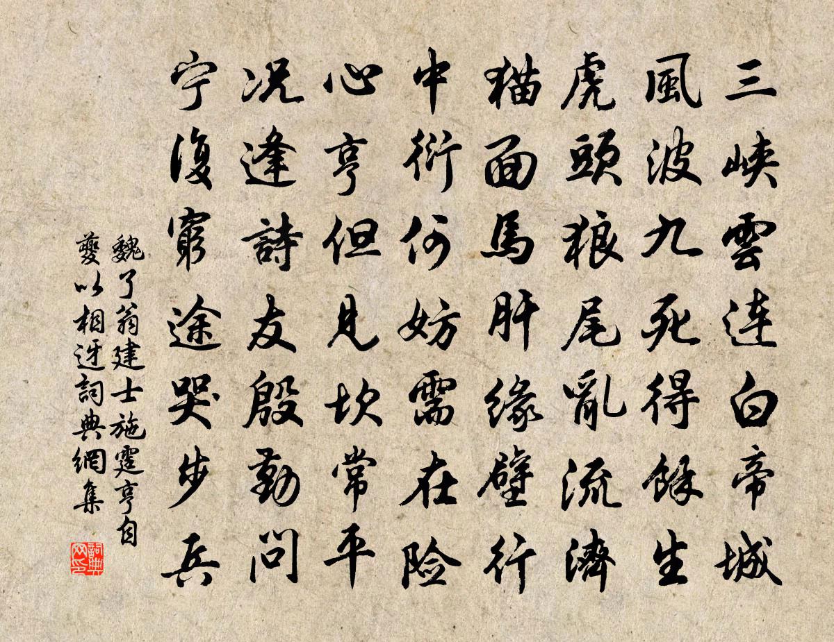 詩詞名句歷史字典書法欣賞書法字典國語詞典說文解字康熙字典古漢語字典標 題 作 者 詩 句 建士施霆亨自夔以相迓作者:魏了翁 朝代:宋代建士施霆亨自夔以相迓原文三峽雲連白帝城,風波九死得餘生。虎頭狼尾亂流濟,貓面馬肝緣壁行。中衍何妨需在險,心亨但見坎常平。況逢詩友殷勤問,寧復窮途哭步兵。詩詞問答問:建士施霆亨自夔以相迓的作者是誰?答:魏了翁問:建士施霆亨自夔以相迓寫於哪個朝代?答:宋代魏了翁建士施霆亨自夔以相迓書法欣賞建士施霆亨自夔以相迓書法作品詩詞推薦送邦佐弟歸鄉姜特立〔宋代〕昔時俱是一兒童,今日相看兩禿翁。舊約對床心自喜,新詩入夢句仍工。吾衰已覺身如幻,汝老猶疑氣吐虹。南北臨江仙 梁山舟中二首張翥〔元代〕羨殺漁家生處樂,隔灣數點青燈。蓑衣忘在石磯層。蓼花秋釀酒,楓樹晚垂罾。時向瓦鷗篷底醉,往來鷺侶鷗朋。水墨松石方乾〔唐代〕三世精能舉世無,筆端狼藉見功夫。添來勢逸陰崖黑,潑處痕輕灌木枯。垂地寒雲吞大漠,過江春雨入全吳。蘭堂江上主人文同〔宋代〕客路逢江國,人家占畫圖。青林隨遠岸,白水滿平湖。魚小猶論尺,鷗輕欲問銖。何時遂休去,來此伴潛夫。胡旋女-戒近習也白居易〔唐代〕胡旋女,胡旋女。心應弦,手應鼓。弦鼓一聲雙袖舉,回雪飄颻轉蓬舞。左旋右轉不知疲,千匝萬周無已時。人間送羅年能赴興國杜范〔宋代〕句金與君別,忽忽二十年。君滋厲素節,我已羞華顛。轉物有玄機,掃翳還青天。群耳共聳聽,明詔方改元。篤意游洞霄彭揮〔宋代〕洞霄從古宅真仙,鎮日群峰起瑞煙。林下千年丹已就,山中九鎖月長圓。半岩隱跡遺靈像,一井清涼撫掌泉。我到夢中詠醉人蘇轍〔宋代〕城中醉人舞連臂,城外醉人相枕睡。此人心中未必空,暫爾頹然似無事。我生從來不解飲,終日騰騰少憂累。昔年送魏簡能東遊二首李涉〔唐代〕獻賦論兵命未通,卻乘羸馬出關東。灞陵原上重回首,十載長安似夢中。燕市悲歌又送君,目隨征雁過寒雲。孤亭婦女之孝二十首鄭義宗妻林同〔宋代〕抵死侍姑側,寧知有妾身。若懷 * 顧,尚得謂之人。江上度元宵節袁說友〔宋代〕一舟元夕臥孤村,夜半相呼了不應。說與兒曹休誶語,黃州明日買殘燈。甘露子一名地蠶楊萬里〔宋代〕甘露子,甘露子,喚作地蠶亦良似。不食柘桑不食絲,何須走入地底藏。不能作繭不上簇,如何也蒙賜湯沐。呼我鷺鷥劉象〔唐代〕潔白孤高生不同,頂絲清軟冷搖風。窺魚翹立荷香里,慕侶低翻柳影中。幾日下巢辭紫閣,多時凝目向晴空。摩霄菩薩蠻·隔花才歇簾纖雨納蘭性德〔清代〕隔花才歇簾纖雨,一聲彈指渾無語。梁燕自只歸,長條脈脈垂。小屏山色遠,妝薄鉛華淺。獨自立瑤階,透寒金縷夜會李太守宅(一作宿太守李公宅)於鵠〔唐代〕郡齋常夜掃,不臥獨吟詩。把燭近幽客,升堂戴接B 。微風吹凍葉,余雪落寒枝。明日逢山伴,須令隱者知。書事七首時少章〔宋代〕共說曾公有府城,殿前數日淨邊塵。白麻宣受人爭看,寶馬高秋報主身。次韻日新見招王灼〔宋代〕聞道山中熟臘醅,懸知瓮面喚春回。桃花亦解相勾引,前度劉郎擬獨來。減字木蘭花沈瀛〔宋代〕聖經五止。止向丘隅黃鳥喜。廣大儒風。一貫三才萬類通。太羹玄酒。聖域能躋民域壽。支派從何。關內濂溪洛澗頌一百則釋重顯〔宋代〕對一說,太孤絕,無孔鐵鎚重下楔。閻浮樹下笑呵呵,昨夜驪龍拗角折。別別,韶陽老人得一橛。送趙郎二首張嵲〔宋代〕匡山太白書淫久,不但天才蓋一時。須慕更生勤博古,莫師長吉只為詩。八磚學士多時譽,七步賢王有令資。數子名句推薦仁不異遠,義不辭難班固《漢書·紀·武帝紀》 舉賢任能,不時日而事利。尉繚《尉繚子·戰威》 玉座猶寂寞,況乃妾身輕。謝朓《同謝諮議詠銅雀台》 對菊難逢元亮酒,登樓愧乏仲宣才。秋瑾《九日感賦》 老翁逾牆走,老婦出門看。杜甫《石壕吏》 好事不出門,壞事傳千里。佚名《增廣賢文·上集》 智用於眾人之所不能知,而能用於眾人之所不能見。王詡《鬼谷子·謀篇》 學而時習之,不亦說乎?佚名《論語十則》 語之所貴者意也,意有所隨。意之所隨者,不可言傳也。莊子《莊子·外篇·天道》 如何肯到清秋日,已帶斜陽又帶蟬。李商隱《柳》