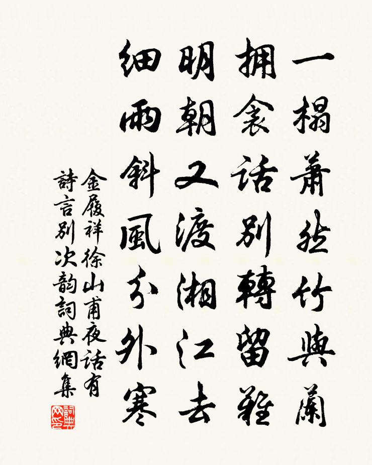 詩詞名句歷史字典書法欣賞書法字典國語詞典說文解字康熙字典古漢語字典標 題 作 者 詩 句 徐山甫夜話有詩言別次韻作者:金履祥 朝代:宋代徐山甫夜話有詩言別次韻原文一榻蕭然竹與蘭,擁衾話別轉留難。明朝又渡湘江去,細雨斜風分外寒。詩詞問答問:徐山甫夜話有詩言別次韻的作者是誰?答:金履祥問:徐山甫夜話有詩言別次韻寫於哪個朝代?答:宋代金履祥徐山甫夜話有詩言別次韻書法欣賞徐山甫夜話有詩言別次韻書法作品詩詞推薦過揚子江王令〔宋代〕長江來何從,遠自西極詹。中破蜀山流,始與巴水兼。川原日混合,淚射勢益嚴。奔渾萬里流,不自頃刻淹。駭如辭世偈釋慧開〔宋代〕虛空不生,虛空不滅。證得虛空,虛空不別。賡李篔房韻釋文珦〔宋代〕故國頻關夢,春深一到來。卻因風景異,便棹雨舟回。其可忘諸夏,真堪賦七哀。天居曾入處,滿目舊寒苔。長相思佚名〔宋代〕晴也行。雨也行。雨也行時不似晴。天晴終快人。名也成。利也成。利也成時不似名。名成天下驚。聞汪翔甫八月十日卒去曹元會五月三日之報僅方回〔宋代〕甫作詩為兩翁壽,豈虞相繼駭予聞。八旬已過太公望,一旦俱為冥漠君。場屋少時嘗張王,兵戈晚歲忽紛紜。全天西江月尹志平〔元代〕我愛秋陽道眾,人人謙讓溫和。終朝豁暢恣高歌。日用不分彼我。福地安居自在,松間閒步煙蘿。先人後己行功多七年九月,自廣陵召還,復館於浴室東堂。八蘇軾〔宋代〕夢繞吳山卻月廊,白梅盧橘覺猶香。會稽且作須臾意,從此歸田策最良。立春方岳〔宋代〕采燕雙簪翡翠翹,巧裁銀勝試春韶。東風已到闌乾北,看見嬌黃上柳條。青釋應端住與化寺惟其說而勉之二首李昴英〔宋代〕一般奇怪弄精魂,豬蜆皆餐針戲吞。未到空通渠地位,只當齋戒作沙門。長安春韋莊〔唐代〕長安二月多香塵,六街車馬聲轔轔。家家樓上如花人,千枝萬枝紅艷新。簾間笑語自相問,何人占得長安春?長安幽居即事陸游〔宋代〕薰艾割蜜房,荷鋤掘吳術。誰烹彌明鼎,來薦維摩室?厚味不腊毒,上藥能愈疾。今夕風月佳,良會不可失。孫太祝亳州簽判梅堯臣〔宋代〕微風起船尾,雨氣生日腳。不愁春路泥,正泛春波樂。順去疾鳥飛,問程殊我度。才名留守家,更入尚書幙。庭前桃韋莊〔唐代〕曾向桃源爛漫遊,也同漁父泛仙舟。皆言洞裡千株好,未勝庭前一樹幽。帶露似垂湘女淚,無言如伴息媯愁。五陵和答鞏提乾見賀浙東總戎姜特立〔宋代〕黜陟何嘗取耳邊,旋栽花木學平泉。二年竊食祠官冷,一日頒恩寶篆鮮。閫寄暫居油幕副,朋從遙憶竹林賢。詩筒頌一百則釋重顯〔宋代〕公案圓來問趙州,長安城裡任閒遊。草鞋頭戴無人會,歸到家山便即休。庭中千葉玫瑰今春盛發爛然可愛因賦一章寄上李至〔宋代〕小檻鎖玫瑰,群芳次第催。刺多疑有妒,艷絕卻無媒。露灑啼妝在,風牽舞態回。層苞不暇吐,數日未能開。爛勝欲游嵩岳留別李少尹益賈島〔唐代〕孤策遲回洛水湄,孤禽嘹唳幸人知。嵩岳望中常待我,河梁欲上未題詩。新秋愛月愁多雨,古觀逢仙看盡棋。微眇詠杜鵑花釋擇璘〔宋代〕蠶老麥黃三月天,青山處處有啼鵑。斷崖幾樹深如血,照水晴花暖欲然。三嘆鶴林成夢寐,前生閬苑覓神仙。小山和范景仁王景彝殿中雜題三十八首並次韻其二梅堯臣〔宋代〕文章老重欲追古,便作帝宮蒼檜詩。青蔥玉樹傳楊子,盤屈洪桃見左思。龍鱗已愛松身直,珠實還看柏葉垂。秀木李工部輓歌三首張說〔唐代〕錦帳為郎日,金門待詔時。楊宮先上賦,柏殿幾連詩。瞬息琴歌斷,淒涼簫挽悲。那堪霸陵岸,回首望京師。宅兆名句推薦記得那年花下,深夜,初識謝娘時。韋莊《荷葉杯·記得那年花下》 寒來暑往,秋收冬藏。周興嗣《千字文·全文》 四海皆兄弟,誰為行路人。佚名《舊題蘇武詩 / 別詩四首·其一》 江頭宮殿鎖千門,細柳新蒲為誰綠?杜甫《哀江頭》 聰明睿智,守之以愚李昉、李穆、徐鉉《太平御覽·文部·卷六》 芳樹籠秦棧,春流繞蜀城。李白《送友人入蜀》 青綾被,莫憶金閨故步晁補之《摸魚兒·東皋寓居》 我欲穿花尋路,直入白雲深處,浩氣展虹霓。黃庭堅《水調歌頭·遊覽》 錦瑟無端五十弦,一弦一柱思華年。李商隱《錦瑟》 治國猶如栽樹,本根不搖,則枝葉茂榮。吳兢《貞觀政要·卷一·論政體》