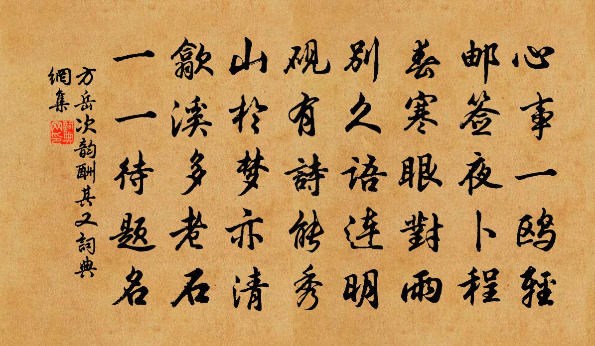 詩詞名句歷史字典書法欣賞書法字典國語詞典說文解字康熙字典古漢語字典標 題 作 者 詩 句 次韻酬其又作者:方岳 朝代:宋代次韻酬其又原文心事一鷗輕,郵簽夜卜程。春寒眼對雨,別久語連明。硯有詩能秀,山於夢亦清。歙溪多老石,一一待題名。詩詞問答問:次韻酬其又的作者是誰?答:方岳問:次韻酬其又寫於哪個朝代?答:宋代方岳次韻酬其又書法欣賞次韻酬其又書法作品詩詞推薦乾元節群臣祝壽小人無位以詩繼之李覯〔宋代〕帝命當敷佑,民生有厥初。千秋唐節日,萬國禹朝車。韶美笙鏞外,需亨飲食餘。神仙似姑射,夢想即華胥。嘉會和樊晉陵傷妾詩陰鏗〔南北朝〕畫梁朝日盡。芳樹落花辭。忽以千金笑。長作九泉悲。鏡前塵劇粉。機上網多絲。戶余雙入燕。床有一空帷。名香賀黃少府受辟釋紹嵩〔宋代〕一鶚新收薦士書,從今價重百車渠。麒麟步舞開天上,會見含香近紫虛。漁家傲佚名〔宋代〕好。說聰明也,孔仲尼安可齊肩;論道德也,李伯陽故應縮首。絕倫武略,獨戰退八萬四千魔兵;蓋世良才,復論拜赦歐陽修〔宋代〕拜赦古州南,山火明烈烈。州人共喧喧,兩◇扶白髮。丁寧天語深,曠盪皇恩闊。乃知天地施,幽遠無間別。欣欣金華山人陳襄〔宋代〕幽居倚翠巒,塵事不相干。天地醉來小,琴棋靜里歡。雨苔春徑綠,風竹夜窗寒。若問長生術,金爐有寶丹。哭韋大夫之晉杜甫〔唐代〕悽愴郇瑕色,差池弱冠年。丈人叨禮數,文律早周旋。台閣黃圖裡,簪裾紫蓋邊。尊榮真不忝,端雅獨翛然。貢喜頌證道歌證道歌釋印肅〔宋代〕如淨琉璃含寶月,昔時未悟今皆徹。只有此心更沒心,不覽邪師文字訣。夏五再游慈雲陳著〔宋代〕青山屏繞碧溪灣,不是閒身欲到難。好容易招才隔水,先塋在望莫憑闌。三杯便是人閒福,半榻聊分物外安。扶醉酬嚴給事賀加五品兼簡同制水部李郎中劉禹錫〔唐代〕九天雨露傳青詔,八舍郎官換綠衣。初佩銀魚隨仗入,宜乘白馬退朝歸。雕盤賀喜開瑤席,彩筆題詩出鎖闈。聞道答皇甫十郎中秋深酒熟見憶白居易〔唐代〕煙景冷蒼茫,秋深夜夜霜。為思池上酌,先覺瓮頭香。未暇傾巾漉,還應染指嘗。醍醐慚氣味,琥珀讓晶光。若許僑廡宋祁〔宋代〕瞿曇少病否,司寇正歸歟。不鑿牆坯遁,猶煩里旅居。飯舂霜棱粟,羹糝雪畦蔬。願受為氓籍,閒披種樹書。寄趙子昂濟南戴表元〔宋代〕濟南官府最風流,聞是山東第一州。戶版自多無訟獄,儒冠相應有賓游。秋風魚酒黃梁市,夜月笙歌畫舫舟。行樂無題二首楊億〔宋代〕露冷星翻月上弦,九枝銀燭照金鈿。應知韓掾偷香夜,猶記潘郎擲果年。天上明河雖可望,苑中高柳未經眠。烏啼頌一百則釋重顯〔宋代〕日面佛,月面佛,五帝三皇是何物。二十年來曾苦辛,為君幾下蒼龍窟。屈堪述明眼,衲僧莫輕忽。寄李公擇郎中秦觀〔宋代〕節旄淮畔脫秋風,忽跨鯨魚上碧空。華秀兩跗當重露,文成五色在高桐。江南又說衣冠盛,廷右仍瞻禮樂隆。朝睍頌古二首釋彌光〔宋代〕家家盡看野狐兒,見者雖多識者稀。百怪千妖俱掃跡,春風已到萬年枝。自鳳州還至秦川驛寄守倅薛姚二君邵雍〔宋代〕歡聚九十日,回首都如夢。明月與清江,東軒又難共。點絳唇王哲〔元代〕可惜嬌兒,惺惺伶俐聰明作。靈台廓。圓明光爍。我許蓬萊約。斷卻麻繩,正好修丹藥。如今卻。買條銅索。縛住揚州慢(為二花著語)趙以夫〔宋代〕粱苑吟新,高陽飲散,玉容寂寞妝樓。故人應念我,折贈水晶球。不須倩、東風說與, * 雲路,解佩江流。似天名句推薦孤舟蓑笠翁,獨釣寒江雪。柳宗元《江雪》 大家漸及消亡,難期其復振,勢成於因循也。王永彬《圍爐夜話·第三七則》 盤飧市遠無兼味,樽酒家貧只舊醅。杜甫《客至》 盡教春思亂如雲,莫管世情輕似絮晏幾道《玉樓春·雕鞍好為鶯花住》 林花謝了春紅,太匆匆。無奈朝來寒雨晚來風。李煜《相見歡·林花謝了春紅》 丹砂成黃金,騎龍飛上太清家,雲愁海思令人嗟。李白《飛龍引二首·其一》 少年射虎名豪,等閒赤羽千夫膳元好問《水龍吟·從商帥國器獵於南陽同仲澤鼎玉賦此》 事業文章隨身銷毀,而精神萬古如新洪應明《菜根譚·概論》 少室眾峰幾峰別,一峰晴見一峰雪。李頎《少室雪晴送王寧》 教人學而執有命,是猶命人葆而去其冠也。墨子《墨子·48章 公孟》