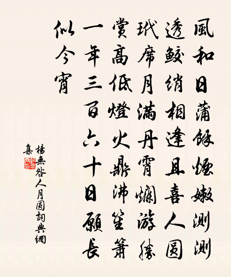 詩詞名句歷史字典書法欣賞書法字典國語詞典說文解字康熙字典古漢語字典標 題 作 者 詩 句 人月圓作者:楊無咎 朝代:宋代人月圓原文風和日蒲余煙嫩,測測透鮫綃。相逢且喜,人圓玳席,月滿丹霄。爛游勝賞,高低燈火,鼎沸笙簫。一年三百六十日,願長似今宵。詩詞問答問:人月圓的作者是誰?答:楊無咎問:人月圓寫於哪個朝代?答:宋代楊無咎人月圓書法欣賞人月圓書法作品詩詞推薦餛鈍釋慧開〔宋代〕寬著肚皮急叉手,鑊湯裡面翻筋斗。渾身糜爛轉聲香,那個禪和不開口。阻風,泊鍾家村。離英州已三日,才行二十里楊萬里〔宋代〕滿船兒女厭江行,我愛江行怕入城。慚愧風師教款曲,為分一舍作三程。以長歌意無極好為老夫聽為韻奉別沔鄂親友姜夔〔宋代〕伐木響虛牝,我願友褐夫。九關呀虎豹,何時內高祛。黃鵠眇雲樹,鸚鵡澹煙蕪。倚杖得清賞,洗心觀本初。落梅劉克莊〔宋代〕昨夜尖風幾陣寒,心知尤物久留難。枝疏似被金刀剪,片細疑經玉杵殘。痛叱山童持帚去,苛留野客坐苔看。月中吟社遞至詩卷足十四韻以答之為梅水村發也趙必象〔宋代〕紫薇號舍人,紅荔名郎官。梅花隱君子,未可一樣觀。又送馬氏兄弟歸彭門李石〔宋代〕山程趼足肯相從,未厭崎嶇易道東。二馬仙風還舊觀,六鰲香餌看新功。北田夜誦披蓮蕊,東閣春歸折桂叢。努力河傳令王哲〔元代〕凡軀莫藉。把惺惺了了,自然明明構架。行住坐臥,須要清清閒暇。氣神和,結成珠,堪教化。張弓舉箭能親射。思玄賦張衡〔兩漢〕衡常思圖身之事,以為吉凶倚伏,幽微難明,乃作《思玄賦》,以宣寄情志。其辭曰:仰先哲之玄訓兮,雖彌高其雨霖鈴(雪)王庭珪〔宋代〕瓊樓玉宇。滿人寰似、海邊洲渚。蓬萊又還水淺,鯨濤靜見,銀宮如許。紫極鳴筲聲斷,望霓舟何處。待夜深、重穆天子李群玉〔唐代〕穆滿恣逸志,而輕天下君。一朝得八駿,逐日西溟濆。寂漠崦嵫幽,絕跡留空文。三千閟宮艷,怨絕寧勝雲。或言闕景初進納長安相值於西採石話及家事因與對劉過〔宋代〕未有還家策,故鄉吾太和。龍洲沙石健,快閣水雲多。場屋科名累,江湖歲月磨。茅柴一杯酒,相對奈愁何。對雪偶成三頌呈芳公長老兼簡收貴二上人韓維〔宋代〕聞君鼎足話無生,說盡無生及有生。幾日西郊回杖錫,小窗同聽竹風聲。題水簾洞羅鄴〔唐代〕亂泉飛下翠屏中,名共真珠巧綴同。一片長垂今與古,半山遙聽水兼風。雖無舒捲隨人意,自有潺湲濟物功。每向淳熙八年端午帖子詞太上皇帝合六首崔敦詩〔宋代〕竹殿陰陰間綠槐,日長棋罷看流杯。北窗風味沈沈靜,南內時新節節來。陳老畫牛趙汝績〔宋代〕老融棄發逃於禪,胸藏丘壑身林泉。時拈寸草幻墨汁,慘澹咫尺生風煙。尤工畫牛古絕比,不特形似真神全。平生髮長蘆江口梅堯臣〔宋代〕篙師柂工相整衣,龍女廟中來宰豨。野祝擊鼓降神語,老鴉銜肉上樹飛。長江無風平似削,兩櫓夾舸行將歸。南國春日閒居三首秦系〔唐代〕一似桃源隱,將令過客迷。礙冠門柳長,驚夢院鶯啼。澆藥泉流細,圍棋日影低。舉家無外事,共愛草萋萋。長謠次韻文約贈行董穎〔宋代〕歸買農疇一飽休,烏鳶儲肉且身謀。扁舟欲趁晚潮發,別袂莫煩樽酒留。松菊有情供好夢,氛埃無賴犯征裘。明年寄閻記室譚用之〔唐代〕織錦歌成下翠微,豈勞西去問支機。未開水府珠先見,不掘豐城劍自輝。鰲逐玉蟾攀桂上,馬隨青帝踏花歸。相逢李子長縣丞示詩卷曾幾〔宋代〕乃祖天邊太白星,裔孫名字見家聲。官曹卑似崔斯立,句律清如庾義城。贈我不知相報答,投人政恐未分明。丞哉名句推薦使殺生之機,奪予之要在大臣,如是者侵。韓非及後人《韓非子·三守》 忠臣挾難進之術,吐逆耳之言陳壽《三國志·魏書·辛毗楊阜高堂隆傳》 朔方三度重陽節,河曲乾旌歲歲忙。齊之鸞《九日登清水營城》 摘青梅薦酒,甚殘寒,猶怯薴蘿衣。湯恢《八聲甘州·摘青梅薦酒》 玉骨那愁瘴霧,冰姿自有仙風。蘇軾《西江月·梅花》 雲里帝城雙鳳闕,雨中春樹萬人家。王維《奉和聖制從蓬萊向興慶閣道中留春雨中春望之作應制》 窮且益堅,不墜青雲之志。王勃《滕王閣序》 折戟沉沙鐵未銷,自將磨洗認前朝。杜牧《赤壁》 獨王之國,勞而多禍管仲《管子·形勢》 思牽今夜腸應直,雨冷香魂吊書客。李賀《秋來》