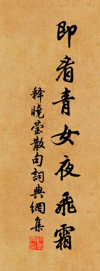詩詞名句歷史字典書法欣賞書法字典國語詞典說文解字康熙字典古漢語字典標 題 作 者 詩 句 句作者:釋曉瑩 朝代:宋代句原文即看青女夜飛霜。詩詞問答問:句的作者是誰?答:釋曉瑩問:句寫於哪個朝代?答:宋代釋曉瑩句書法欣賞句書法作品詩詞推薦勸善吟(醉會中贈郭行餘)孟郊〔唐代〕瘦郭有志氣,相哀老龍鍾。勸我少吟詩,俗窄難爾容。一口百味別,況在醉會中。四座正當喧,片言何由通。顧余常春范成大〔宋代〕染根得靈藥,無時不春風。倚闌與掛壁,相伴歲寒中。往雲門郊居途經回流作韋應物〔唐代〕茲晨乃休暇,適往田家廬。原谷徑途澀,春陽草木敷。才遵板橋曲,復此清澗紆。崩壑方見射,回流忽已舒。明滅次韻張秘校喜雪三首黃庭堅〔宋代〕巷深朋友稀來往,日晏兒童不掃除。雪裡正當梅臘盡,民飢可待麥秋無。寒生短棹誰乘興,光入疏欞我讀書。官冷送楊浩秘丞入蜀梅堯臣〔宋代〕有才不得試,志亦無所乾。有母不得養,法當之遠官。雖曰在民政,孝心寧得安。志願且未遂,而趨蜀道難。行思菩薩蠻·寶函鈿雀金鸂鶒溫庭筠〔唐代〕寶函鈿雀金鸂鶒,沉香閣上吳山碧。楊柳又如絲,驛橋春雨時。畫樓音信斷,芳草江南岸。鸞鏡與花枝,此情誰得吳景年真贊陳著〔宋代〕其容淵,其髯撳,其服野,其冠圜。是誰筆之得其粗焉,孰若見君於此筆之外,而知君於此筆之前。氣以直而肆,雪水庵詠雪二十韻趙良坡〔宋代〕玄冥司號令,屏翳驅雲車。巧舞穿幽隙,輕揚下曲窪。初疑蠶食葉,猶恐蠏行沙。鉛汞三千界,璚瑤百萬家。樓台有懷舍弟逢年時歸婺源以詩督之洪邁〔宋代〕木落天未霜,君歸定何時。相思如驚鵲,中夜未安枝。夢中見阿連,鏘然詠新詩。寤驚衰葉翻,道是步屐移。攬衣拜星月慢陳允平〔宋代〕漏閣閒簽,琴窗倦譜,露濕宵螢欲暗。雁咽涼聲,寂寞芙蓉院。畫檐外,樹色驚霜漸改,澹碧雲疏星爛。舊約桐陰滿庭芳趙長卿〔宋代〕晚色沈沈,雨聲寂莫,夜寒初凍雲頭。曉來階砌,一捻冷光浮。目斷江天靄靄,低迷映、綠竹修修。多才客,高吟隨堤口占呈李公實郎中卷剛中〔宋代〕十年堤上草青青,今日重來春夢驚。載路壺漿皆再造,向人榆柳若生平。漸看英盪傳聲教,永願銀河洗甲兵。鄧禹對芳樽廣韋蘇州詩作姜特立〔宋代〕對芳樽,老來萬事不足論。朱唇皓腕年少伴,青山白雲居古鄰。對芳樽,老來萬事不足論。初夏幽居偶題陸游〔宋代〕放逐還家一老翁,痴頑自笑更誰同?倚欄風月黃昏後,攜杖園林綠潤中。泳水小魚依藻荇,覓巢輕燕拂簾櫳。此身偈頌七十八首釋正覺〔宋代〕只解恁麽去,沙禽夜宿滄洲樹。不解恁麽來,石筍穿開古路苔。莫道鯤鯨無羽翼,今日親從鳥道回。早飯後戲作陸游〔宋代〕髯須主簿方用事,冰壼先生來解圍。蠻童取火炷香碗,不讀南華誰與歸?重傷楊攀處士二首(攀自號綠雲翁)許渾〔唐代〕綠雲多學術,黃髮竟無成。酒縱山中性,詩留海上名。讀書新樹老,垂釣舊磯平。今日悲前事,西風聞哭聲。從官曉起探梅四首楊萬里〔宋代〕打並人間名利心,萬山佳處一溪深。仙家忍餓禪家苦,老子梅邊政醉吟。玉台體題湖上亭戎昱〔唐代〕湖入縣西邊,湖頭勝事偏。綠竿初長筍,紅顆未開蓮。蔽日高高樹,迎人小小船。清風長入坐,夏月似秋天。果州協和練使何公靖康小雅〔宋代〕巍巍京師,帝王之澤。臨制華夏,憲相紫極。邊塵漲天,雨墜矢石。千雉摧毀,公死於敵。欃槍舒芒,萬象變色。名句推薦曉月過殘壘,繁星宿故關。司空曙《賊平後送人北歸》 汀洲采白苹,日落江南春。柳惲《江南曲》 四面邊聲連角起,千嶂里,長煙落日孤城閉。范仲淹《漁家傲·秋思》 無我原非你,從他不解伊。曹雪芹《紅樓夢·第二十二回》 日出入安窮?時世不與人同。佚名《日出入》 雪月最相宜,梅雪都清絕。張孝祥《卜運算元·雪月最相宜》 桂魄初生秋露微,輕羅已薄未更衣。王維《秋夜曲》 東山老,可堪歲晚,獨聽桓箏。葉夢得《八聲甘州·壽陽樓八公山作》 背燈和月就花陰,已是十年蹤跡十年心。納蘭性德《虞美人·銀床淅瀝青梧老》 陪都歌舞迎佳節,遙祝延安景物華。 * 《元旦口占用柳亞子懷人韻》