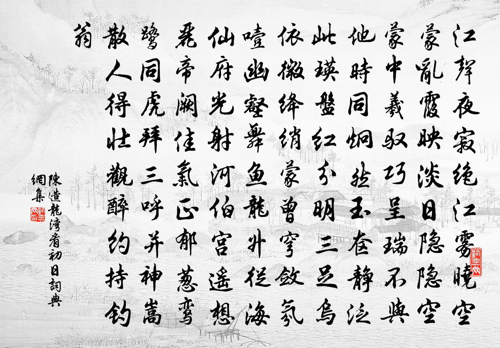 詩詞名句歷史字典書法欣賞書法字典國語詞典說文解字康熙字典古漢語字典標 題 作 者 詩 句 龍灣看初日作者:陳造 朝代:宋代龍灣看初日原文江聲夜寂絕,江霧曉空濛。亂霞映淡日,隱隱空濛中。羲馭巧呈瑞,不與他時同。炯然玉奩靜,泛此瑛盤紅。分明三足烏,依微絳綃蒙。曾穹斂氛噎,幽壑舞魚龍。升從海仙府,光射河伯宮。遙想麗帝闕,佳氣正郁蔥。鸞鷺同虎拜,三呼並神嵩。散人得壯觀,醉約持釣翁。詩詞問答問:龍灣看初日的作者是誰?答:陳造問:龍灣看初日寫於哪個朝代?答:宋代陳造龍灣看初日書法欣賞龍灣看初日書法作品詩詞推薦九里松鄧林〔宋代〕松是山靈一手栽,堯天長就棟樑材。龍髯怒起春風急,似怪遊人喝道來。赴蘇州酬別樂天劉禹錫〔唐代〕吳郡魚書下紫宸,長安廄吏送朱輪。二南風化承遺愛,八詠聲名躡後塵。梁氏夫妻為寄客,陸家兄弟是州民。江城承友攜琴見訪趙友直〔宋代〕三尺絲桐太古音,清風明月是知心。伯牙去後無訊息,會見君家契此深。金剛隨機無盡頌無法可得分第二十二釋印肅〔宋代〕如是□些些,翠竹與黃花。打鼓弄琵琶,還我一會家。滿庭芳 住鐵杳山雲光洞作王處一〔元代〕俯視滄溟,屏山掩映,萬重松檜森然。金波滾滾,雲鎖翠峰巔。書對清光浩渺,更闌顯月印新鮮。圓明聚,紅霞影南鄉子 登京口北固亭有懷辛棄疾〔宋代〕何處望神州,滿眼風光北固樓。千古興亡多少事,悠悠,不盡長江滾滾流。年少萬兜鍪,坐斷東南戰未休。天下英勝勝慢/聲聲慢趙長卿〔宋代〕金垂煙重,雪揚風輕,東風慣得多嬌。秀色依依,偏應綠水朱樓。腰肢先來太瘦,更眉尖、惹得閒愁。牽情處,是醉落魄/一斛珠周紫芝〔宋代〕雲深海闊。天風吹上黃金闕。酒醒不記歸時節。三十年來,往事無人說。浮生正似風中雪。丹砂豈是神仙訣。世間飲文氏園是日鵲噪於庭坐上燭花無數就試者凡李流謙〔宋代〕虎變龍騰各有心,諸公高宴盍朋簪。爛開數對迎祥燭,合噪仍來報喜禽。人似月娥元自近,酒名天祿莫辭深。坐中庚子歲五月中從都還阻風於規林 其二陶淵明〔魏晉〕自古嘆行役,我今始知之!山川一何曠,巽坎難與期。崩浪聒天響,長風無息時。久游戀所生,如何淹在茲。靜念長相思石孝友〔宋代〕樹槎牙。冰交加。冷艷疏疏瘦影斜。幾枝梅花放。天一涯。語三叉。已是情多怨物華。那堪更憶家。春夜溫故六言二十首劉克莊〔宋代〕拔舌犯世深忌,枕肱夸師緒言。徂徠生為鬼怪,伊川死尚還魂。送月上人住寶積寺敖陶孫〔宋代〕天竺應須老辨才,羅浮那得染塵埃。試看出日朱明觀,便是中天積翠台。起廢合歸良匠手,安禪好住白雲堆。寄聲畫堂春(春日)趙鼎〔宋代〕空籠簾影隔垂楊。夢回芳草池塘。杏花枝上蝶雙雙。春晝初長。強理雲鬟臨照,暗彈粉淚沾裳。自憐容艷惜流光。八聲甘州(送□制參分司□□,兼攝守漕)李曾伯〔宋代〕自當年、種柳向西門,古今號名州。對風聲策策,浪濤袞袞,又是新秋。暫為江山彈壓,誰得似賢侯。夜觀燈棋里春日五首楊時〔宋代〕雨余殘日照窗明,風弄行雲點點輕。坐對庭陰人閴寂,時聞蛛網掛蟲聲。題左正卿壽慈堂楊萬里〔宋代〕萬事絲窠黏露珠,奉親最樂天下無。丘明遠孫千里駒,有母七十發漆如。雪底箏生冰底魚,人間無覓天賜渠。三更九月九日劉十八東堂集李頎〔唐代〕風俗尚九日,此情安可忘。菊花辟惡酒,湯餅茱萸香。雲入授衣假,風吹閒宇涼。主人盡歡意,林景晝微茫。清切失調名佚名〔宋代〕一庭影浸梧竹。題光福劉伯祥所藏東坡枯木及漁村落落照圖孫應時〔宋代〕灑落胸中丘壑,崢嶸海外風霜。幻出小山枯木,教成千載甘棠。名句推薦但東望、故人翹首。戴復古《賀新郎·寄豐真州》 自昔佳人多薄命,對古來、一片傷心月。辛棄疾《賀新郎·用前韻送杜叔高》 今朝此為別,何處還相遇。韋應物《初發揚子寄元大校書》 十日春寒不出門,不知江柳已搖村。蘇軾《正月二十日往岐亭郡人潘古郭三人送余於女王城東禪莊院》 萬里乘雲去復來,隻身東海挾春雷。秋瑾《黃海舟中日人索句並見日俄戰爭地圖》 黃葉古祠寒雨積,清山荒冢白雲多。于謙《岳忠武王祠》 桃根桃葉終相守,伴殷勤、雙宿鴛鴦。納蘭性德《一叢花·詠並蒂蓮》 故聲聞過情,君子恥之。孟子《孟子·離婁章句下·第十八節》 濤瀾洶湧,風雲開闔。蘇轍《黃州快哉亭記》 借人物,及時還。後有急,借不難。李毓秀《弟子規·謹》