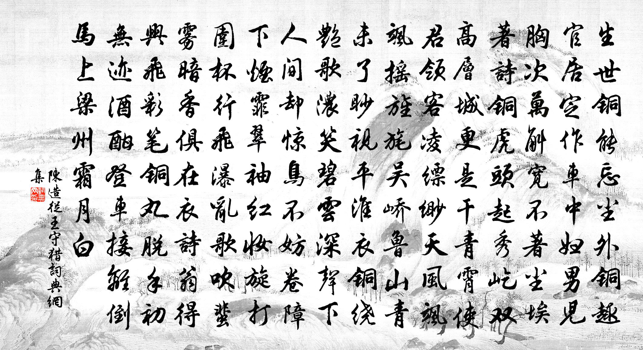詩詞名句歷史字典書法欣賞書法字典國語詞典說文解字康熙字典古漢語字典標 題 作 者 詩 句 從王守獵作者:陳造 朝代:宋代從王守獵原文生世銅能忘塵外銅趣,官居定作車中婦。男兒胸次萬斛寬,不著塵埃著詩銅。虎頭起秀屹雙高,層城更是乾青霄。使君領客凌縹緲,天風颯颯搖旌旄。吳嶠魯山青未了,眇視平淮衣銅繞。艷歌濃笑碧雲深,聲下人間卻驚鳥。不妨卷障下煙霏,翠袖紅妝旋打圍。杯行飛瀑亂歌吹,蜚霧暗香俱在衣。詩翁得興飛彩筆,銅丸脫手初無跡。酒酣登車接離倒,馬上樑州霜月白。詩詞問答問:從王守獵的作者是誰?答:陳造問:從王守獵寫於哪個朝代?答:宋代陳造從王守獵書法欣賞從王守獵書法作品詩詞推薦游長安諸寺聯句靖恭坊大興善寺聖柱聯句段成式〔唐代〕天心惟助善,聖跡此開陽。 ——段成式載恐雷輪重,縆疑電索長。 ——張希復上沖挾螮蝀,不動束鋃鐺。 —相和歌辭。長門怨袁暉〔唐代〕早知君愛歇,本自無縈妒。誰使恩情深,今來反相誤。愁眠羅帳曉,泣坐金閨暮。獨有夢中魂,猶言意如故。偈頌十首釋德光〔宋代〕一法不明,翳汝眼睛。眼睛不明,世界崢嶸。侄孫亦龍作亭於小山之上□余以野亭名之得詩戴復古〔宋代〕詩禮家聲重,田園活計饒。自甘為野客,不願仁王朝。時為花開眼,誰因米折腰。此心安出處,何日不逍遙。錦李嶠〔唐代〕漢使巾車遠,河陽步障陳。雲浮仙石日,霞滿蜀江春。機迥回文巧,紳兼束髮新。若逢楚王貴,不作夜行人。句李迎〔宋代〕籍甚人言易已東。詠史下蜀先主陳普〔宋代〕西行不與本心符,西負劉璋東負吳。漢業此時如累卵,天公先與殺周瑜。夏雨薛能〔唐代〕何處發天涯,風雷一道賒。去聲隨地急,殘勢傍樓斜。透樹垂紅葉,沾塵帶落花。瀟湘無限思,閒看下蒹葭。武夷九曲棹歌留元剛〔宋代〕五曲雲崖有許深,石門書屋著修林。堂堂不泯清風在,一片寒潭印我心。出真州文天祥〔宋代〕一別迎鑾十八秋,重來意氣落旄頭。平山老子不收拾,南望端門淚雨流。頌古三十一首釋如本〔宋代〕草戶柴門謝子來,躬身下拜笑眉開。深深密密親分付,莫道寶山空手回。訴衷情曹勛〔宋代〕人情世態飽經過。眼也見來多。忙中掉得便去,不是有人唆。雲似舞,水如歌。笑呵呵。這回還我,半世偎綏,一臥病聞吉中孚拜官寄元秘書昆季李端〔唐代〕漢家采使不求聲, * 文章道欲行。毛遂登門雖異賞,韓非入傳濫齊名。雲歸暫愛青山出,客去還愁白髮生。年少遣僧澄收刈潼陽朱翌〔宋代〕不潠田將獲,東屯稼亦收。厭煩吾老矣,為眾子行不。一粒生何處,千箱慶有秋。灌溪明月飯,今日已無愁。題鴛鴦浦漵圖佚名〔宋代〕睡足鴛鴦各欲飛,水花欹岸兩三枝。多情公子因乘興,寫出江春日暖時。白山茶劉學箕〔宋代〕白茶誠異品,天賦玉玲瓏。不作燒燈焰,深明韞櫝功。易容非世功,幻質本春工。皓皓知難污,塵飛謾自紅。次韻譚彥成學士早春五首李彌遜〔宋代〕渺渺家山水四涯,秋風僧憶醉黃華。馬頭不識南塘路,又看感陽二月花。聽雨軒四首李洪〔宋代〕春到池塘草自青,飛花時度破窗欞。恨無好句追顏謝,賴有鳴蛙鼓吹聽。贈劉司戶蕡李商隱〔唐代〕江風揚浪動雲根,重碇危檣白日昏。已斷燕鴻初起勢,更驚騷客後歸魂。漢廷急詔誰先入,楚路高歌自欲翻。萬里八月八日發潭州後得絕句四十首趙蕃〔宋代〕兩岸多為激水輪,創由人力用如神。山田枯旱湖田澇,惟此豐凶歲歲均。名句推薦遙望洞庭山水色,白銀盤裡一青螺劉禹錫《望洞庭》 紫塞門孤,金河月冷,恨誰訴?朱彝尊《長亭怨慢·雁》 剛待不思量,吹一片、簫聲過牆。項鴻祚《太常引·客中聞歌》 獨倚危欄,神遊無際,天地猶嫌隘。朱栴《念奴嬌·雪霽夜月中登樓望賀蘭山作》 甚時躍馬歸來,認得迎門輕笑。時彥《青門飲·寄寵人》 多事年年二月風,翦出鵝黃縷。納蘭性德《卜運算元·新柳》 海上千烽火,沙中百戰場。李頎《古塞下曲》 信人莫若信己,防人毋存幸念。來俊臣《羅織經·閱人卷第一》 梧桐半死清霜後,頭白鴛鴦失伴飛。賀鑄《半死桐·重過閶門萬事非》 道在邇而求諸遠,事在易而求之難。孟子《孟子·離婁章句上·第十一節》