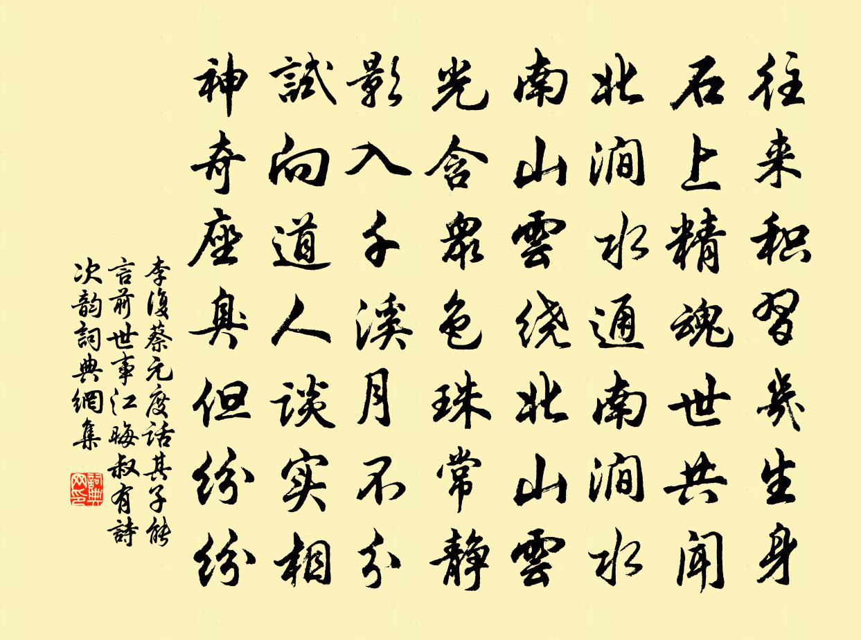 詩詞名句歷史字典書法欣賞書法字典國語詞典說文解字康熙字典古漢語字典標 題 作 者 詩 句 蔡元度話其子能言前世事江晦叔有詩次韻作者:李復 朝代:宋代原文往來積習幾生身,石上精魂世共聞。北澗水通南澗水,南山雲繞北山雲。光含眾色珠常靜,影入千溪月不分。試向道人談實相,神奇座臭但紛紛。詩詞問答問:《蔡元度話其子能言前世事江晦叔有詩次韻》的作者是誰?答:李復問:該詩寫於哪個朝代?答:宋代書法欣賞蔡元度話其子能言前世事江晦叔有詩次韻書法作品詩詞推薦酬里中友人代得韻徐集孫〔宋代〕鬢絲冉冉負年華,客夢無時不在家。吟得新詩三百首,卻慚籬下見黃花。題鄞江舒坦〔宋代〕地吞越絕海分深,渺渺平流萬馬駸。早晚渡船潮有信,往來鷗鳥客無心。寒空倒影千山動,暖日澄波萬籟沈。安用病中蔡槃〔宋代〕繞舍東風急,柴門靜掩時。交情貧里見,藥性病中知。沉寂心當定,清羸步懶移。呼童理書案,為管舊時書。詠墨袁說友〔宋代〕奚李名高三百秋,只今良法信源流。裕陵獨寶君家物,猶帶祥光燦鬥牛。用五男兒再賦方回〔宋代〕每於生日賦新詩,似覺今年老更痴。竊謂齊公千駟馬,豈知陶氏五男兒。能拼久客常沉醉,不念全家慣忍飢。七十山店賣石榴取以薦酒陸游〔宋代〕山色蒼寒雲釀雪,旗亭據榻興悠哉!麴生正欲相料理,催喚風流措措來。溧水道中仇遠〔宋代〕步屧春風白馬橋,車溝泥滑路迢遙。眼前未識千紅紫,但見新黃上柳條。壽胡興元三首吳泳〔宋代〕幾代貞元會,還生忠簡孫。清風拔薤本,愛日護葵根。疋馬馳周道,分公翰蜀門。保全橋上路,手滌瘴雲昏。題岳祠白玉蟾〔宋代〕南來一劍住三山,分得平生風月懽。雖宰旌陽應施藥,本求勾漏為修丹。蒙莊且慕漆園祿,李老嘗為柱下官。我視十七日和原甫風花偶書梅堯臣〔宋代〕風花不戀枝,脫萼亂翻飛。自學空中雪,寧同垣上衣。繞庭迴旋久無著,眾鳥爭銜何處歸。初入二里文同〔宋代〕樹色交山色,蟬聲雜水聲。客懷殊不倦,信馬此間行。子陵釣台吳龍翰〔宋代〕峭壁千尋屹曉寒,何年人插釣魚竿。煙霞不受衣冠涴,天地那如蓑笠寬。幸有同肩黃屋貴,不妨伸腳白雲端。能令春夜雪再用韻十首楊公遠〔宋代〕茆檐堆積未消除,仔細觀來半尺余。臘後春前知幾白,豐年可卜史官書。滿江紅 贈密庵述三教李道純〔元代〕教有三門,致極處、元來只一。這一字法門,深不可測。老子穀神恆不死,仲尼心易初無畫。問瞿曇教外**心,雙澗寺二首黃庭堅〔宋代〕山韻江深屋翠崖,夜鐘聲自瓮中來。長松偃蹇蒼龍臥,六月澗泉轟怒雷。送訥堂和尚住秀之天寧釋師範〔宋代〕蘇州有,常州有。真箇有,未嘗有。賤時傾國不可換,貴則陪錢掗一{左豆右斗}。伸一手,縮一手,日月奔忙,書方伯謨窗間趙蕃〔宋代〕問此林間屋,何年所築成。開窗山自入,繞屋水長鳴。可靜看書眼,如參琢句聲。白雲原上宅,比並孰堪兄。欒家瀨王維〔唐代〕颯颯秋雨中,淺淺石榴瀉。跳波自相濺,白鷺驚復下。好事近(碩人生日)程大昌〔宋代〕綠鬢又紅顏,誰道年周甲子。兩婿□□藍綬,那一兒何慮。只今卜築水晶宮,歸安好名義。金紫珈笄偕老,備長生百福寺薰風堂沈樞〔宋代〕築室最高處,軒窗八面通。鑿山流乳液,開戶納薰風。巾履隨涼設,花瓜與客同。我來資解慍,不羨楚王雄。名句推薦我本不棄世,世人自棄我。李白《送蔡山人》 回頭流水小橋東,煙掃畫樓出。雷應春《好事近·梅片作團飛》 天下傷心處,勞勞送客亭。李白《勞勞亭》 半天涼月色,一笛酒人心。袁枚《夜過借園見主人坐月下吹笛》 天外黑風吹海立,浙東飛雨過江來。蘇軾《有美堂暴雨》 一涓春水點黃昏,便沒頓、相思處。史達祖《留春令·詠梅花》 善有善報,惡有惡報。不是不報,時候未到。佚名《增廣賢文·上集》 舞殿冷袖,風雨淒淒。杜牧《阿房宮賦》 自古逢秋悲寂寥,我言秋日勝春朝。劉禹錫《秋詞》 烽火城西百尺樓,黃昏獨上海風秋。王昌齡《從軍行七首》