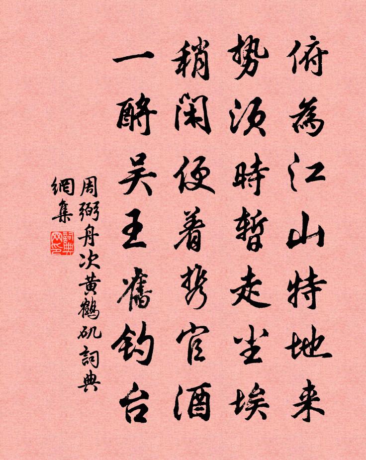 詩詞名句歷史字典書法欣賞書法字典國語詞典說文解字康熙字典古漢語字典標 題 作 者 詩 句 舟次黃鶴磯作者:周弼 朝代:宋代舟次黃鶴磯原文俯為江山特地來,勢須時暫走塵埃。稍閒便著攜官酒,一酹吳王舊釣台。詩詞問答問:舟次黃鶴磯的作者是誰?答:周弼問:舟次黃鶴磯寫於哪個朝代?答:宋代周弼舟次黃鶴磯書法欣賞舟次黃鶴磯書法作品詩詞推薦偈頌七十八首釋正覺〔宋代〕恰恰無綾縫,明明不覆藏。鷲嶺豈傳迦葉,少林那付神光。現成處處合頭句,是足人人知見香。虛空說法森羅聽,次陸放翁韻蘇泂〔宋代〕登高望遠不可無,不可一日不讀書。予方自委下濕地,君乃獨占高明居。楊雲儻許客載酒,杜陵安得錢買驢。徐行過蘄州董嗣杲〔宋代〕清霜染岸楓,扁舟渡蘄水。蘄城傍新築,無此至堅壘。誰憐多病苦,委命空江里。艱險已備嘗,萬事謹謀始。追憶頌古九十八首釋印肅〔宋代〕達人相見無交涉,不落丹霞正自瞞。賴得龐公無二解,迎來送去一般般。閒居釋行海〔宋代〕繞岸奇峰半沒煙,滿窗涼影竹涓涓。雙鳩並睡枯桑上,一鷺閒行白水邊。次韻李袁州絕句七首趙蕃〔宋代〕先生句法從江夏,今代詞人孰比肩。戲出小詩還會否,要收萬斛作泓泉。滄洲白鷺軒五首汪炎昶〔宋代〕聊拳一足傍菰蒲,照影秋波雪點孤。荷鄉滴殘蓬外雨,遠應有夢落江湖。贈淳于公歸養梁顥〔宋代〕懇辭浮宦振家聲,懸憶高堂指去程。選籍便通閨籍美,彩衣兼映錦衣榮。推恩半俸供甘旨,守道全家試滿盈。我恨題丹陽永泰寺練湖亭張祜〔唐代〕小檻俯澄鮮,龍宮浸浩然。孤光懸夜月,一片割秋天。淺派胤沙草,餘波漂岸船。聊當因畎澮,披拂坐潺湲。彌牟鎮孔明八陣圖王剛中〔宋代〕我稽八陣圖,規模載方冊。曷來鎮西蜀,夔門觀疊石。賦詩有數字,字字究來歷。進涉漢州西,彌矣鎮之北。平原塞下曲四首·其一常建〔唐代〕玉帛朝回望帝鄉,烏孫歸去不稱王。天涯靜處無征戰,兵氣銷為日月光。題真空閣李熙輔〔宋代〕括蒼山上雲,山好雲亦好。可憐山下僧,看雲不知老。清明日賜百僚新火韓濬〔唐代〕朱騎傳紅燭,天廚賜近臣。火隨黃道見,煙繞白榆新。榮耀分他日,恩光共此辰。更調金鼎膳,還暖玉堂人。灼灼和襲美春夕陪崔諫議櫻桃園宴陸龜蒙〔唐代〕佳人芳樹雜春蹊,花外煙濛月漸低。幾度艷歌清欲轉,流鶯驚起不成棲。矮齋雜詠二十首曉望華岳〔宋代〕長天萬里掃清秋,宿霧朝雲寸不留。向曉殘星猶未落,一盤棋子倩誰收。寄呈方蛟峰尚書林景熙〔宋代〕野鶴松根認履聲,夢中鈞樂尚泠泠。南山老翠幾千尺,北斗寒芒第一星。泉石好春歸健筆,乾坤正氣寄遺經。神功和趙宮管看梅三首蘇泂〔宋代〕縛屋疏疏傍柳塘,詩腸渾不畏田荒。今年天賜清修福,只晏梅花一味香。公館姜特立〔宋代〕公館當清夜,移樽近北墉。秋聲連蟋蟀,月色淡芙蓉。次韻調甘內掾王邁〔宋代〕韓掾才情妙,吟成苦夜長。歌殘如意鐵,夢斷合歡床。鼓瑟湘雲暖,吹笙嶺月涼。舊時雙燕子,飛入謝家堂。後天易吟三十首方回〔宋代〕彖辭六十四,三十四方貞。幹事匪正固,難求心外亨。名句推薦料峭春寒中酒,交加曉夢啼鶯。吳文英《風入松·聽風聽雨過清明》 曲終漏盡嚴具陳,月沒星稀天下旦。佚名《雞鳴歌》 雪暗凋旗畫,風多雜鼓聲。楊炯《從軍行》 露清枕簟藕花香,恨悠揚。顧敻《虞美人·觸簾風送景陽鍾》 其安易持,其未兆易謀;其脆易泮,其微易散。為之於未有,治之於未亂。老子《老子·德經·第六十四章》 遠上寒山石徑斜,白雲生處有人家。杜牧《山行》 永豐西角荒園裡,盡日無人屬阿誰。白居易《楊柳枝二首》 陰壑生虛籟,月林散清影杜甫《游龍門奉先寺》 所作福德不應貪著。鳩摩羅什譯《金剛經·不受不貪》 百花頭上開,冰雪寒中見。辛棄疾《生查子·重葉梅》